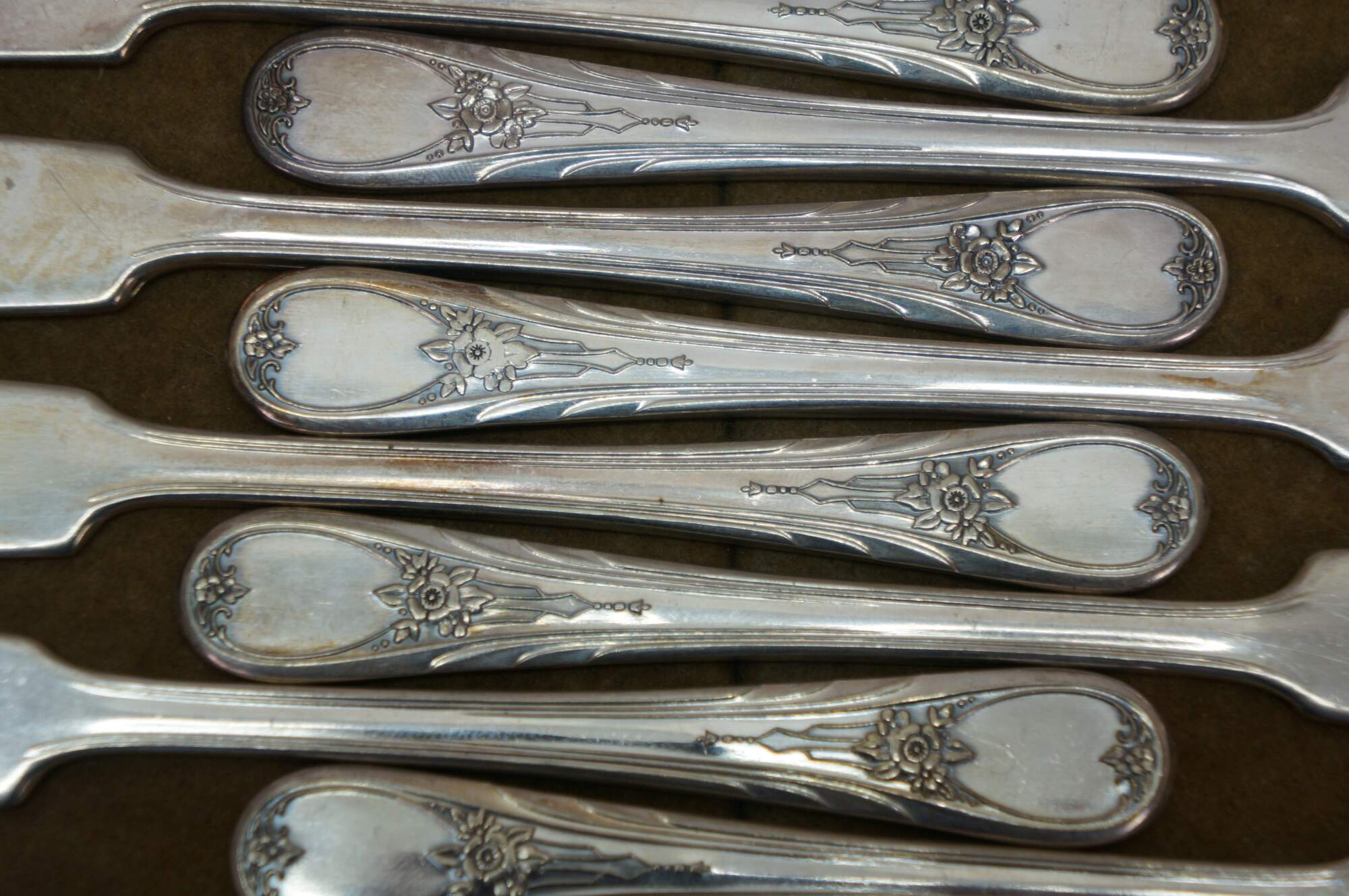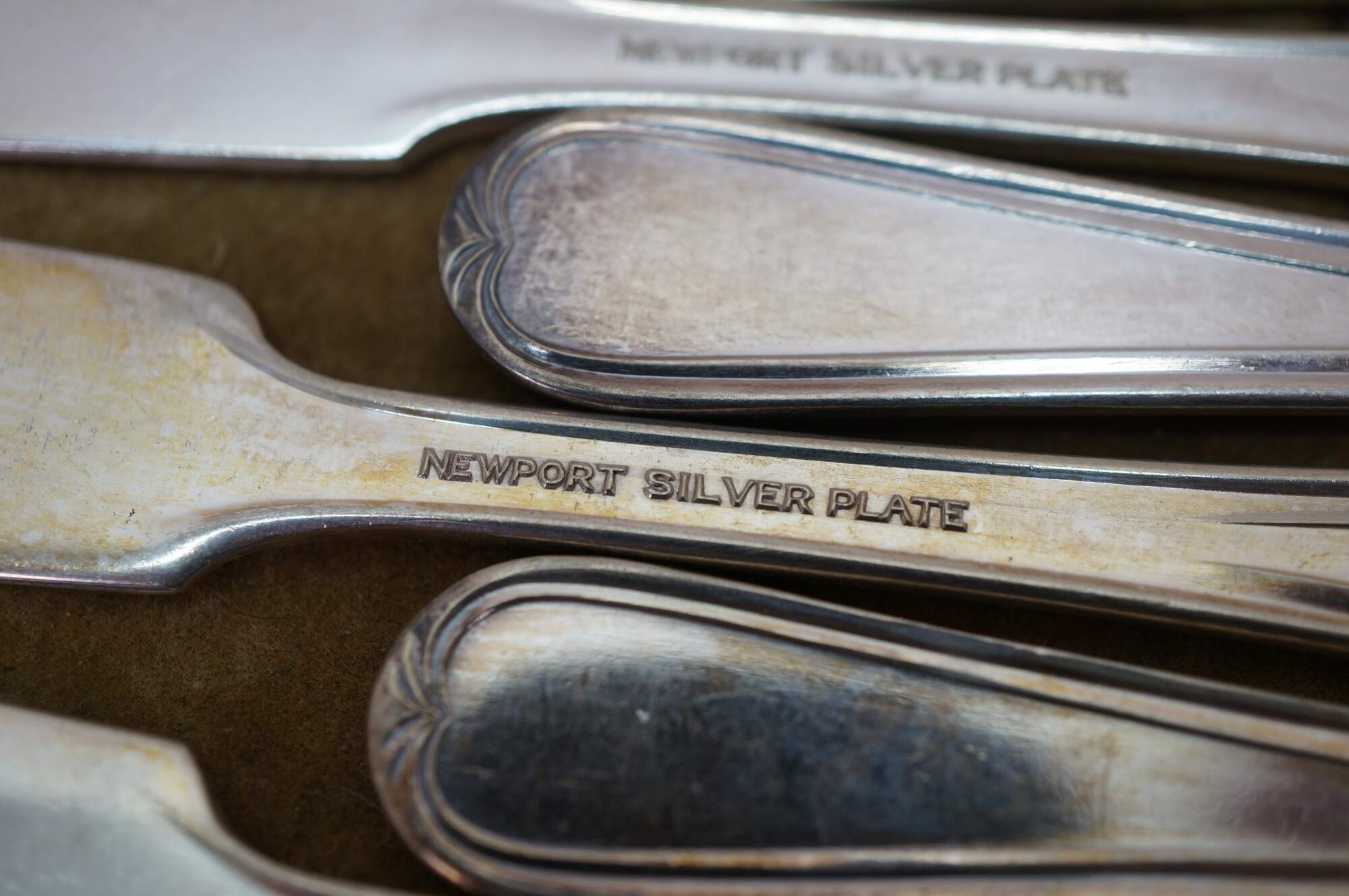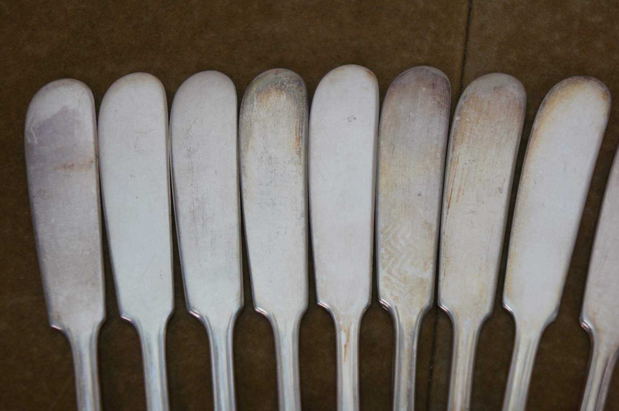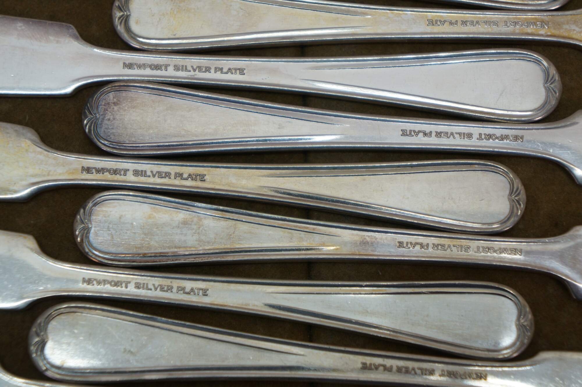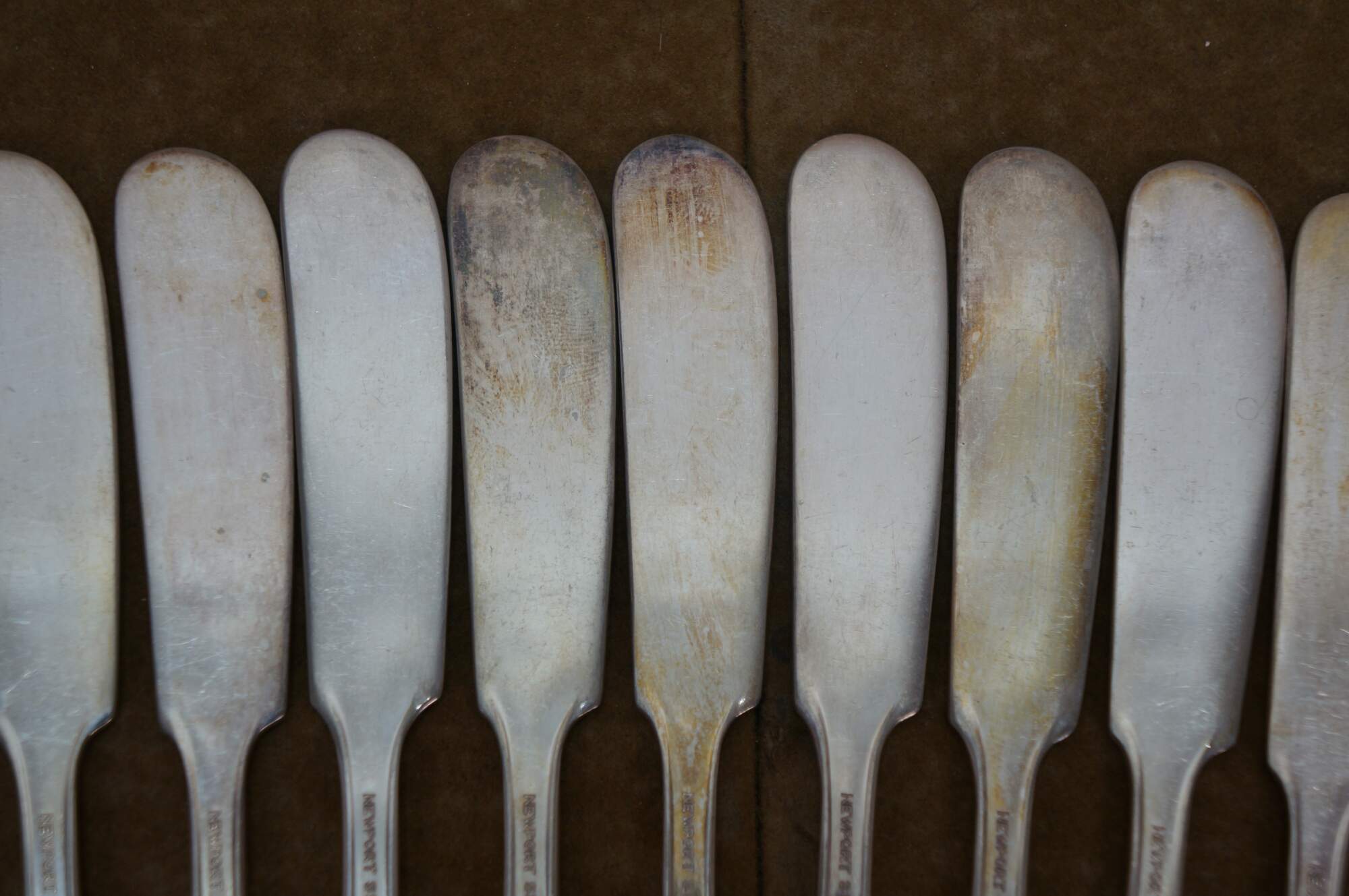 Twelve antique art nouveau Newport silver plated flat handle butter knives / spreaders.