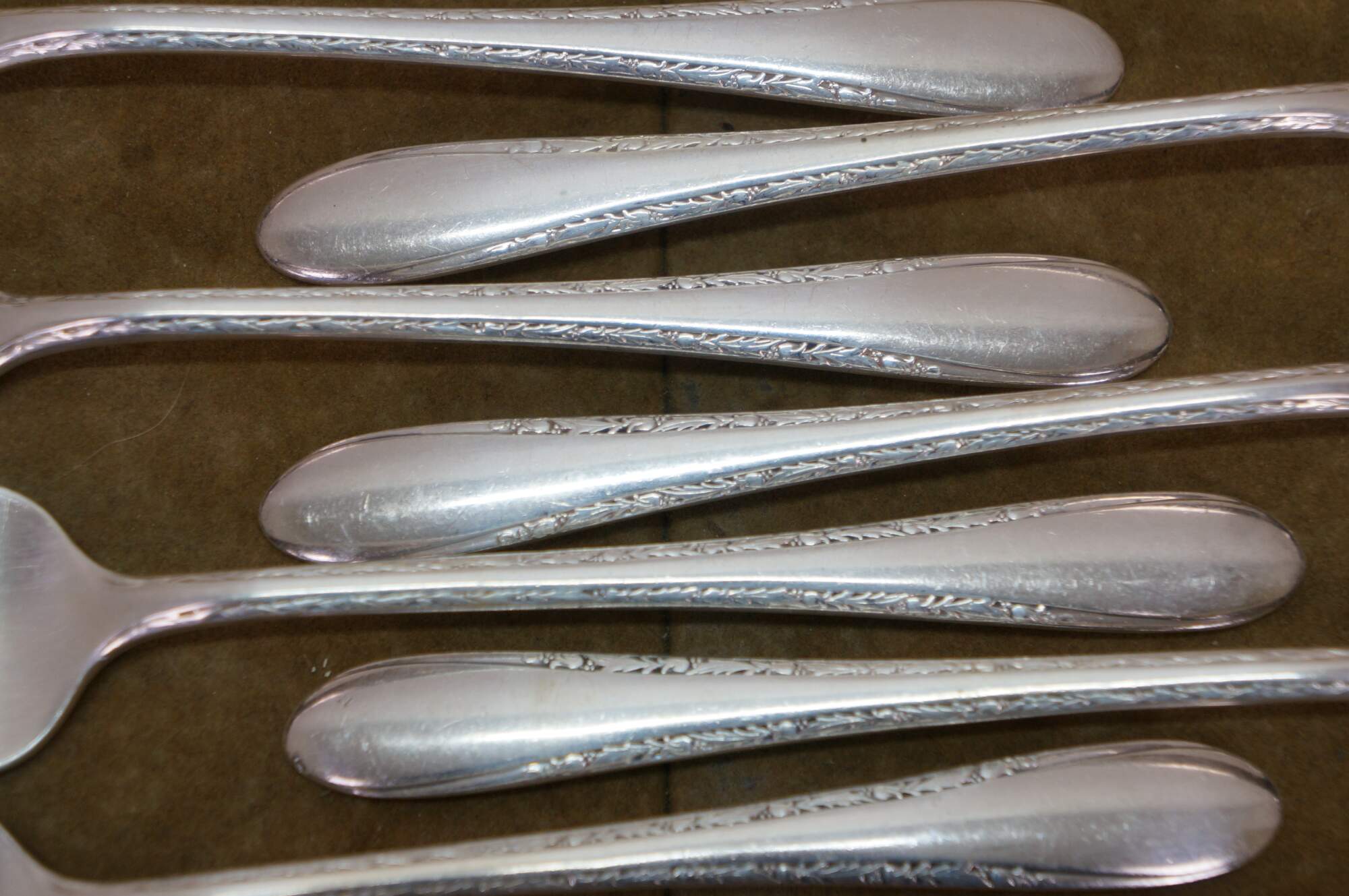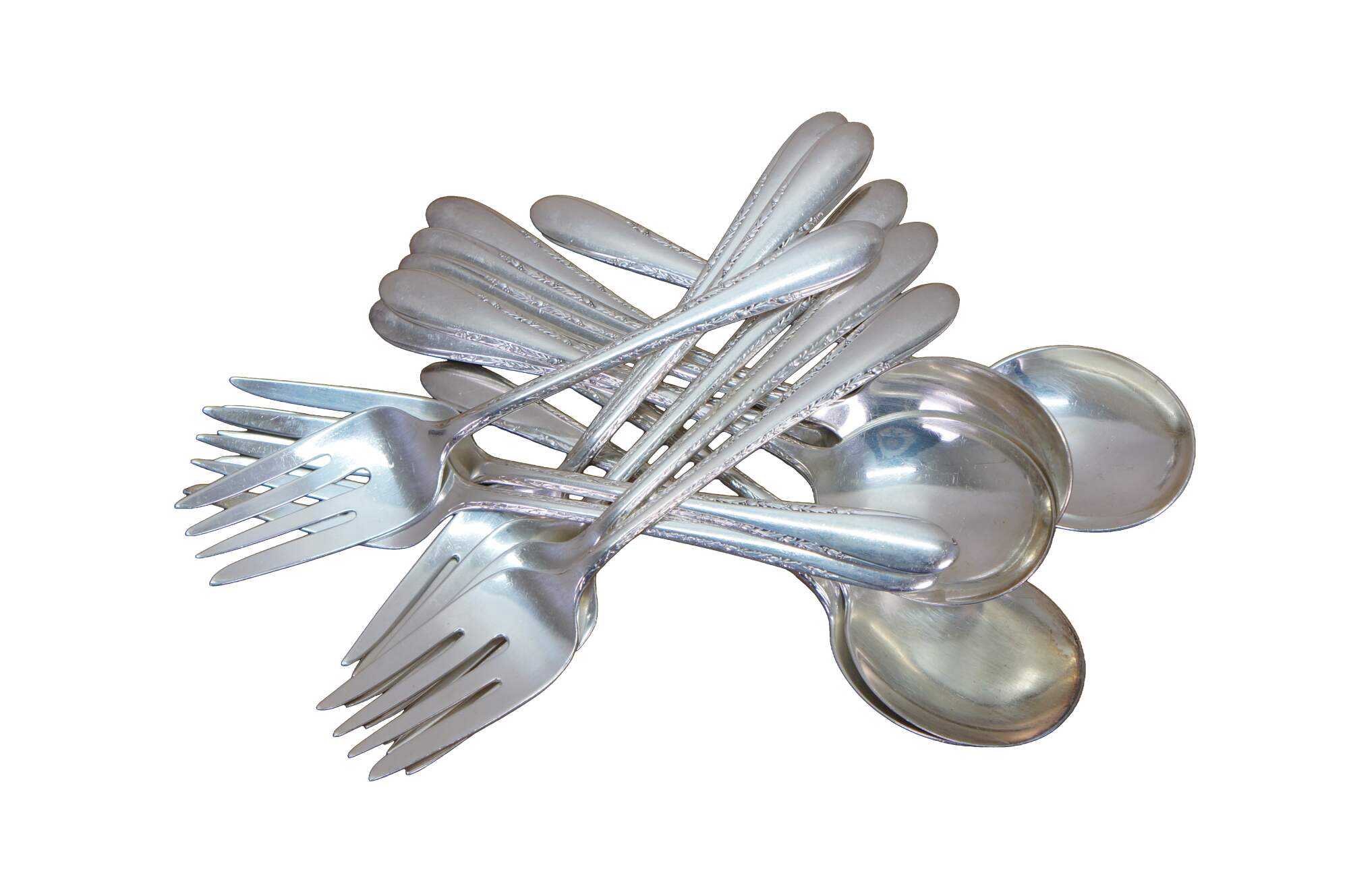 Sixteen circa 1940 Gorham Invitation pattern silver plate spoons and forks.
