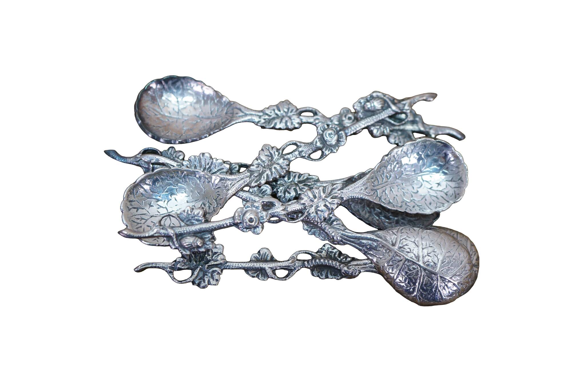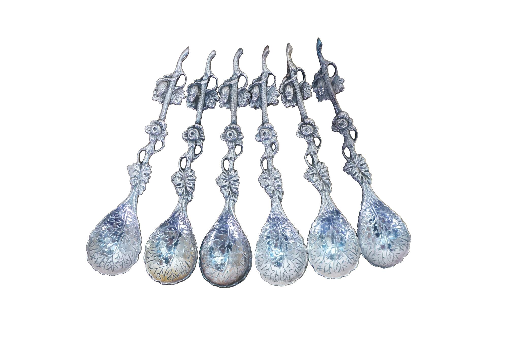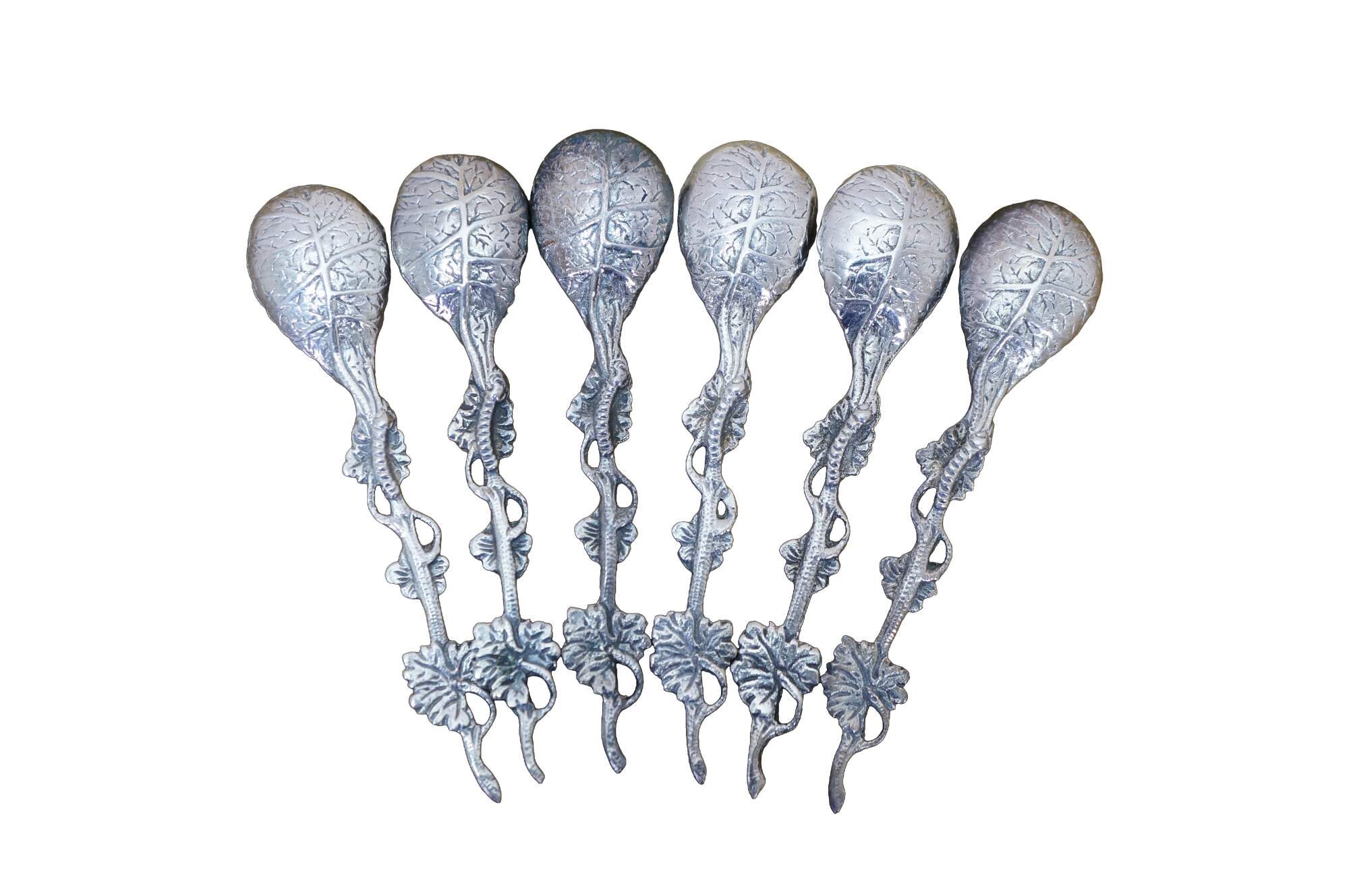 Six antique cast metal floral cabbage tea leaf demitasse spoons.