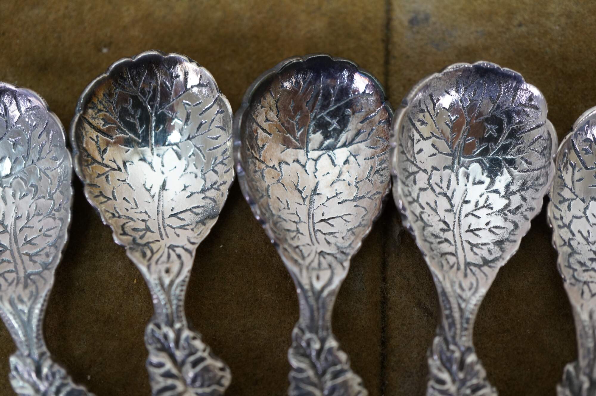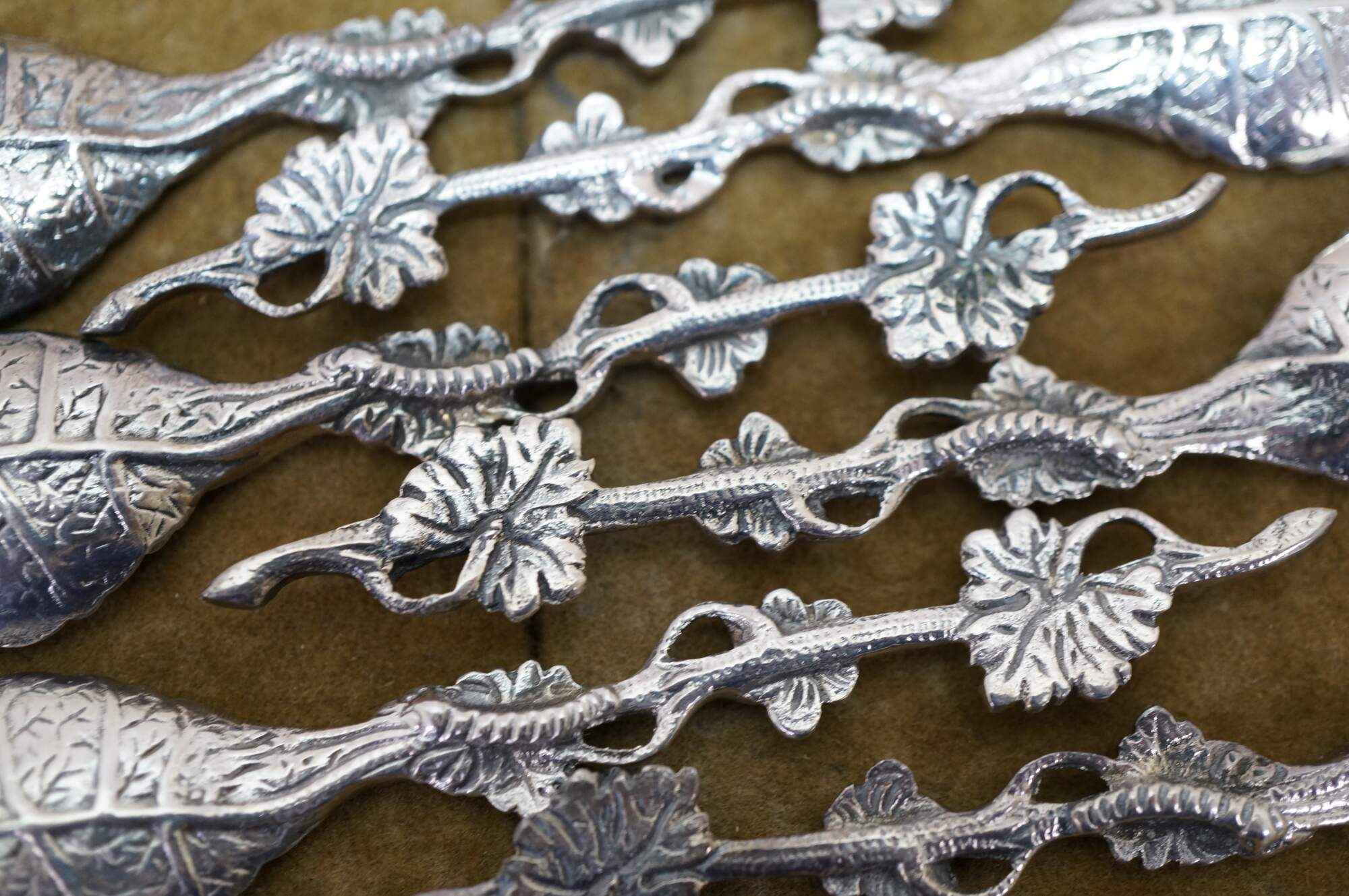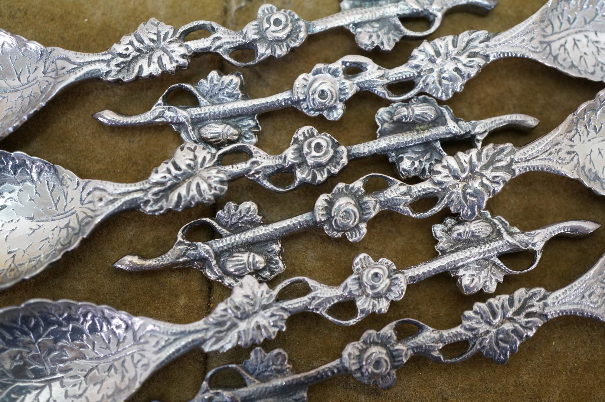 Six antique cast metal floral cabbage tea leaf demitasse spoons.