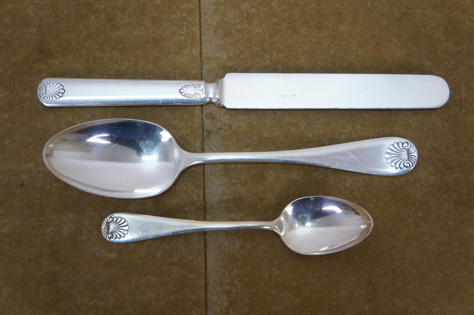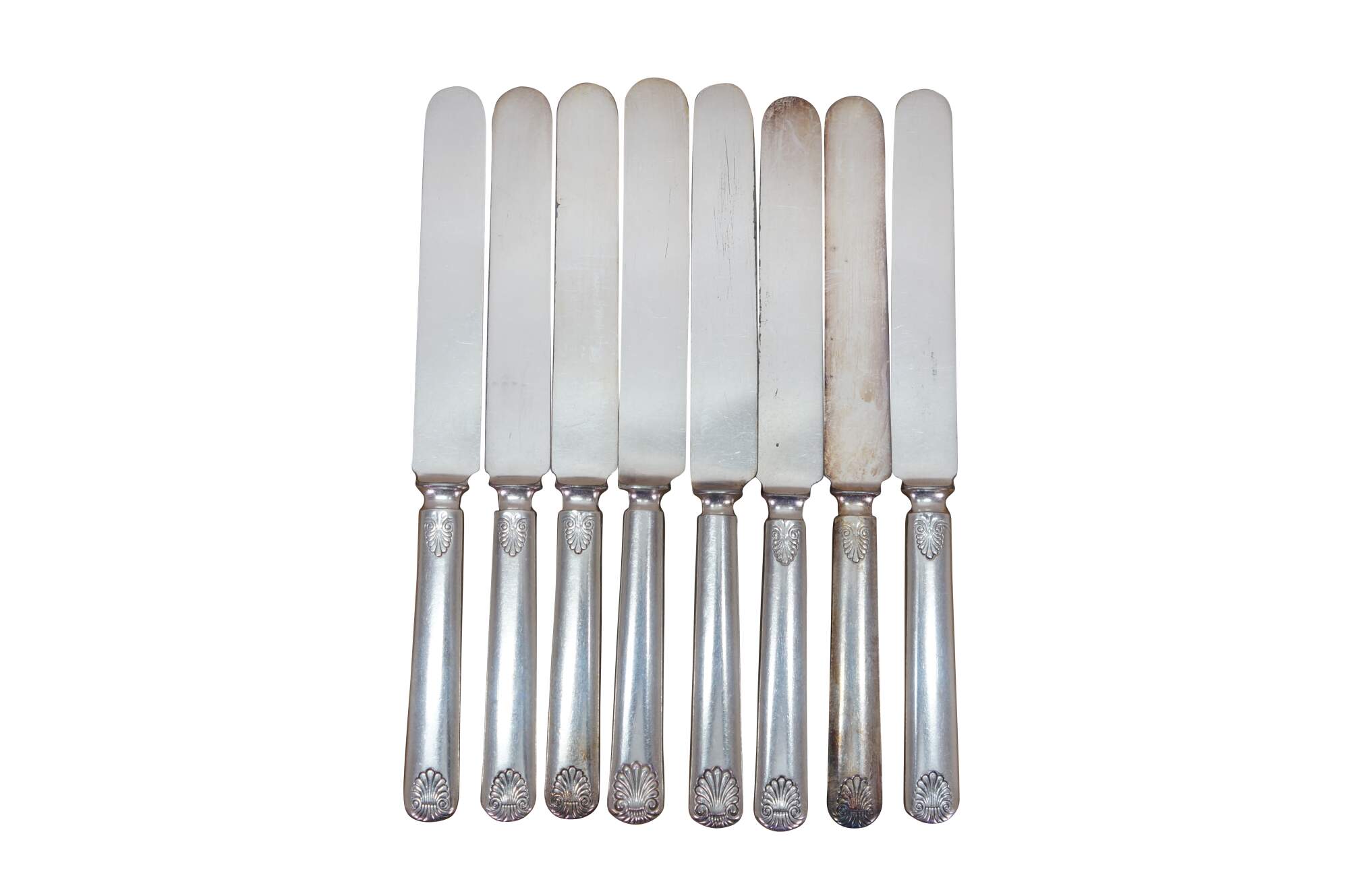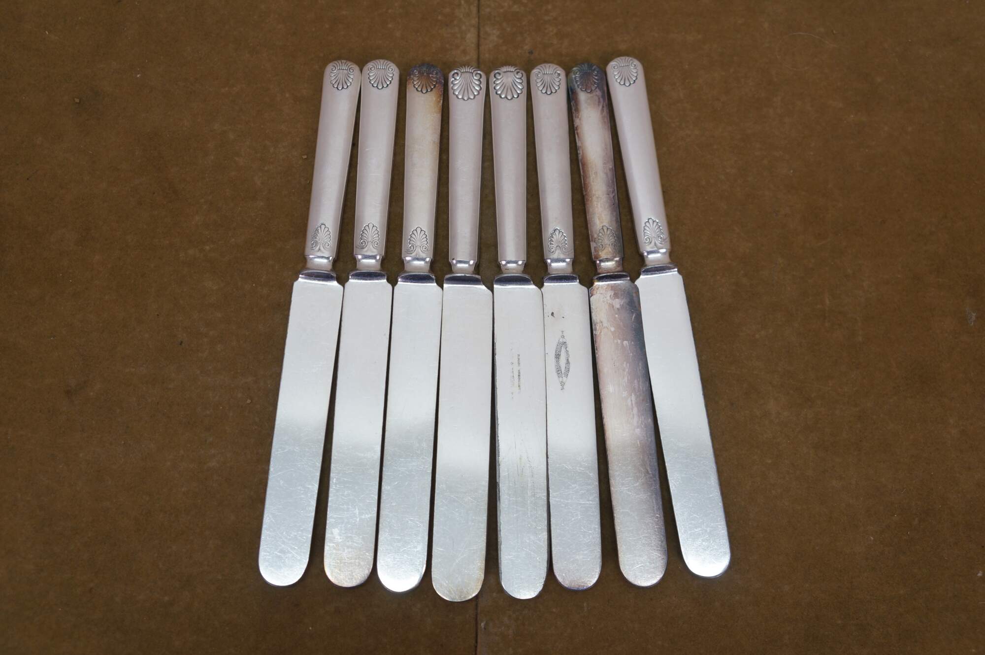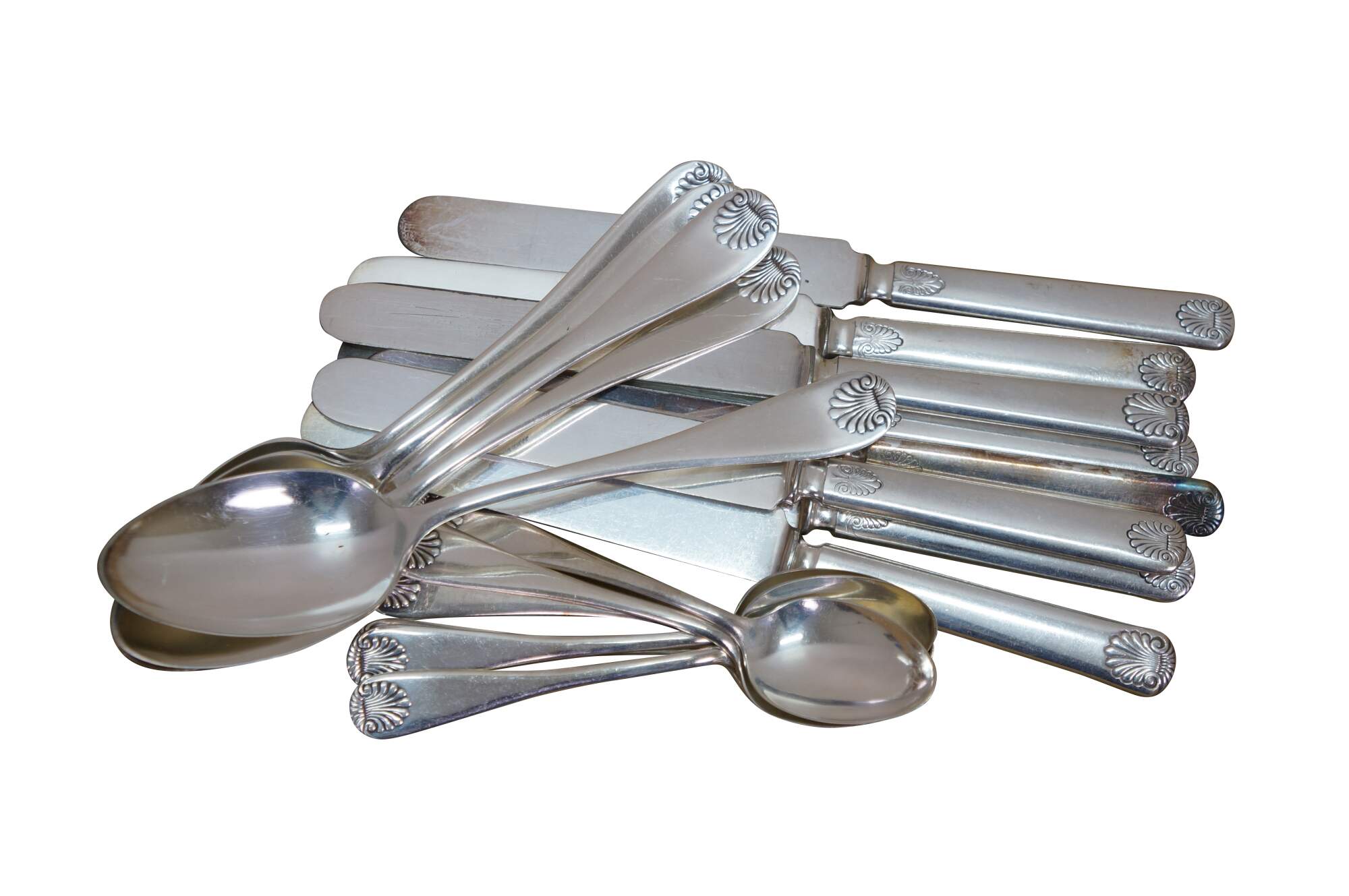 Twenty piece antique WM Rogers & son A1 silver plated shell pattern dinner spoons and knives / spreaders.