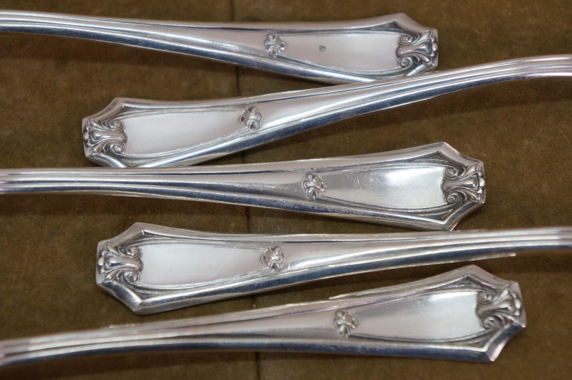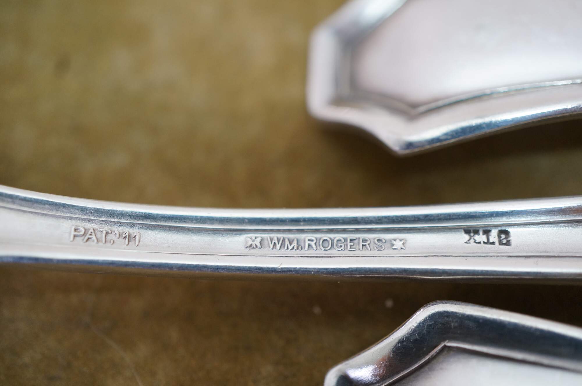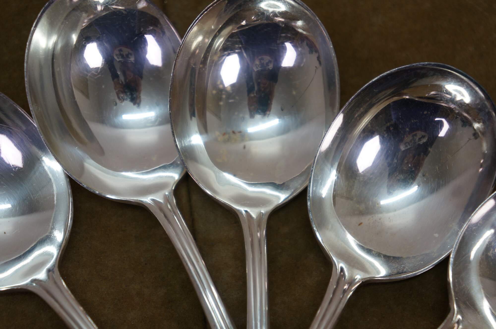 Five antique circa 1911 WM Rogers X12 Fairmount / Carrollton pattern bouillon soup spoons.