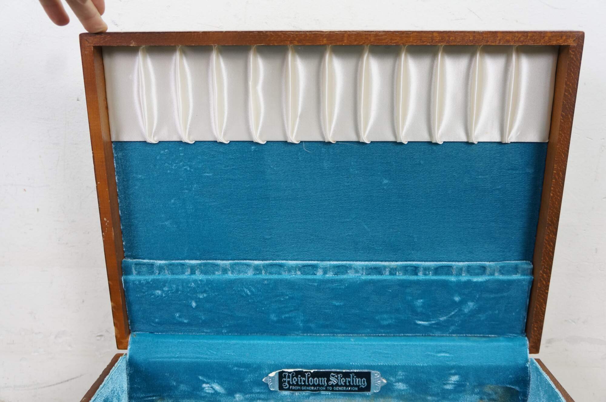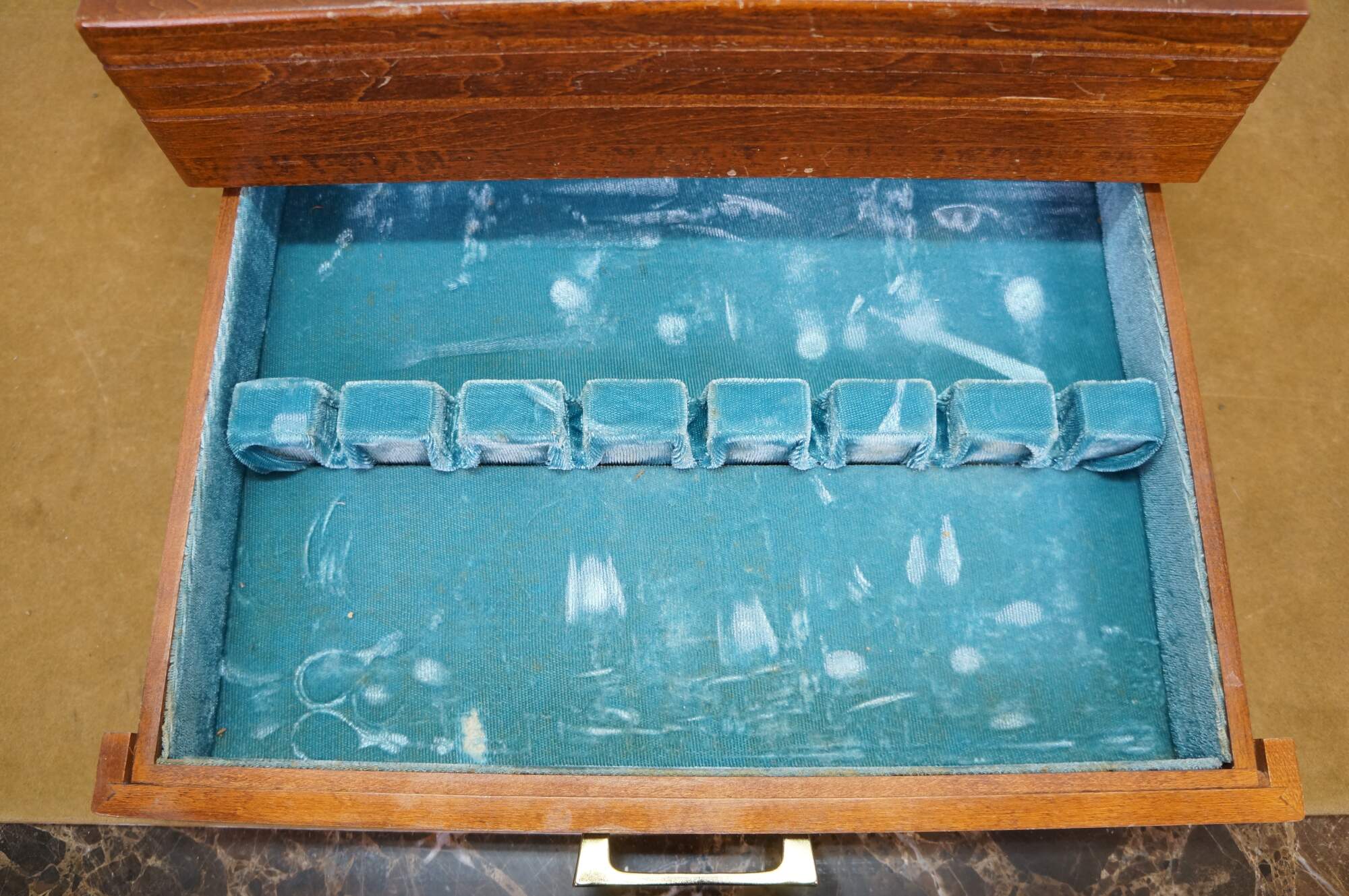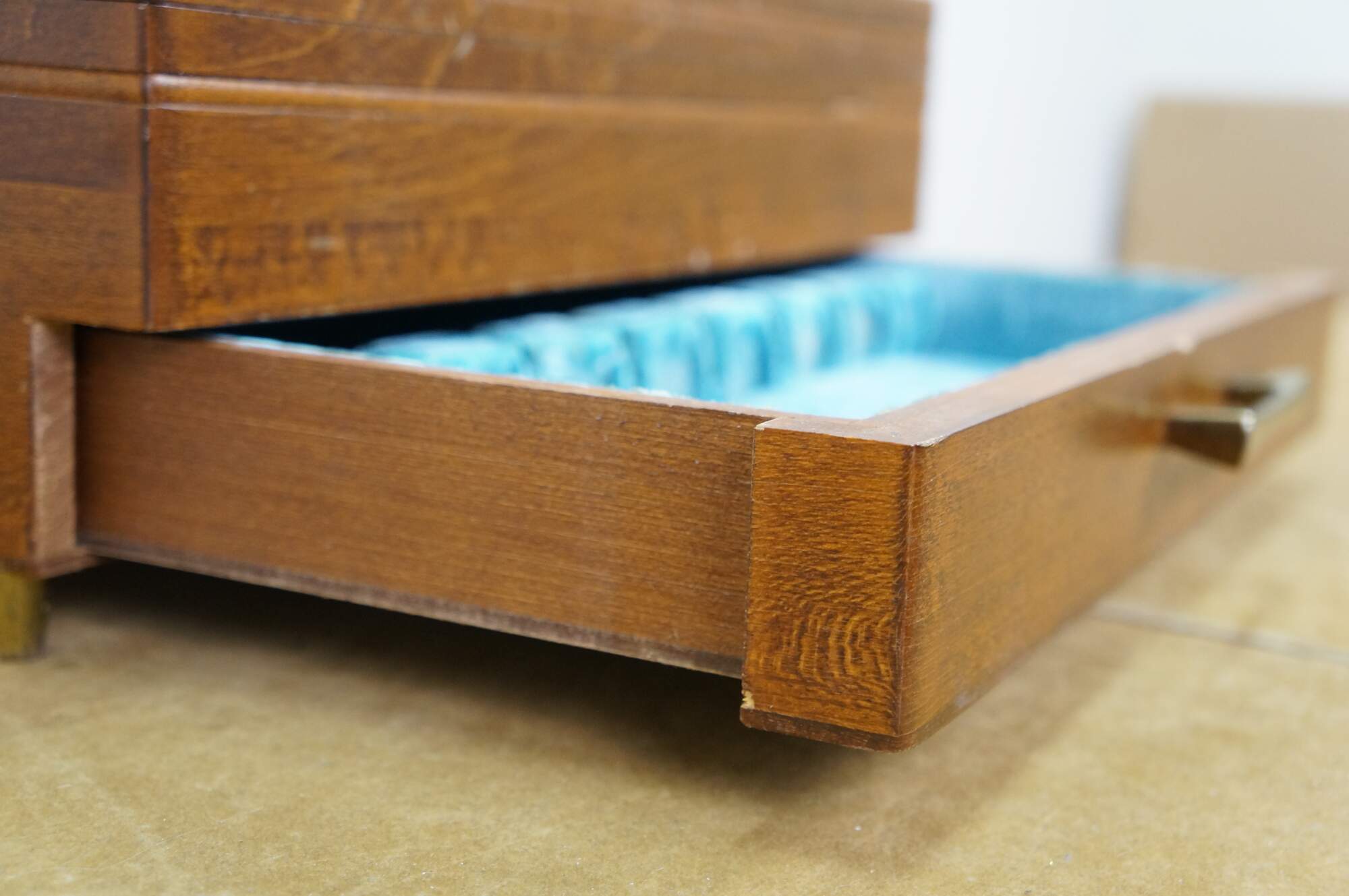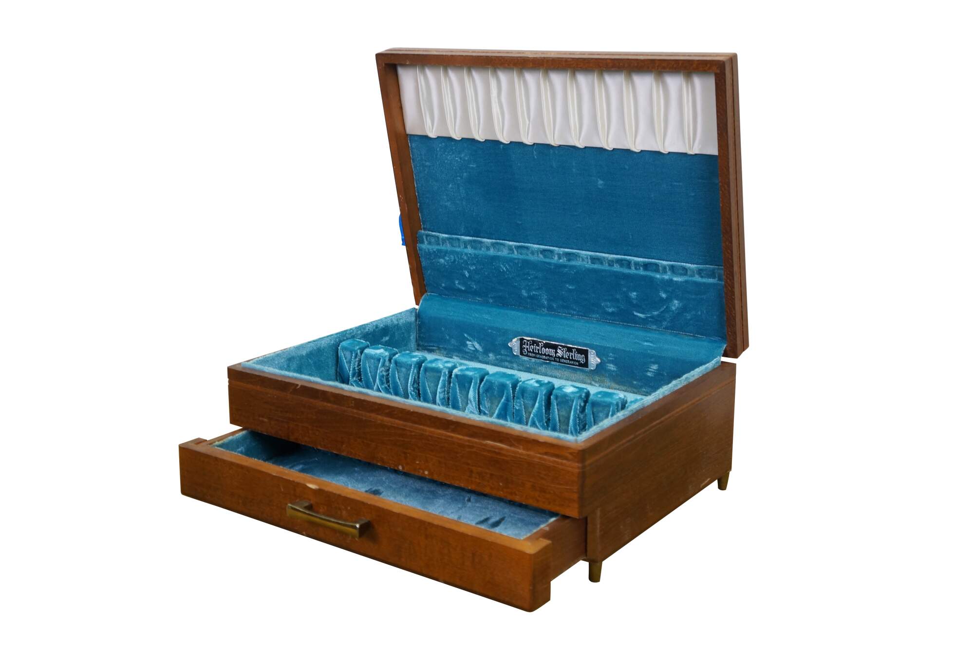 Mid century maple Oneida LTD Heirloom silver flatware cutlery storage box featuring a teal blue lining with upper divided storage area and lower drawer for larger pieces. Originally housed a collection of Sterling Silver in the Heirloom collection.