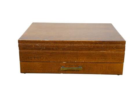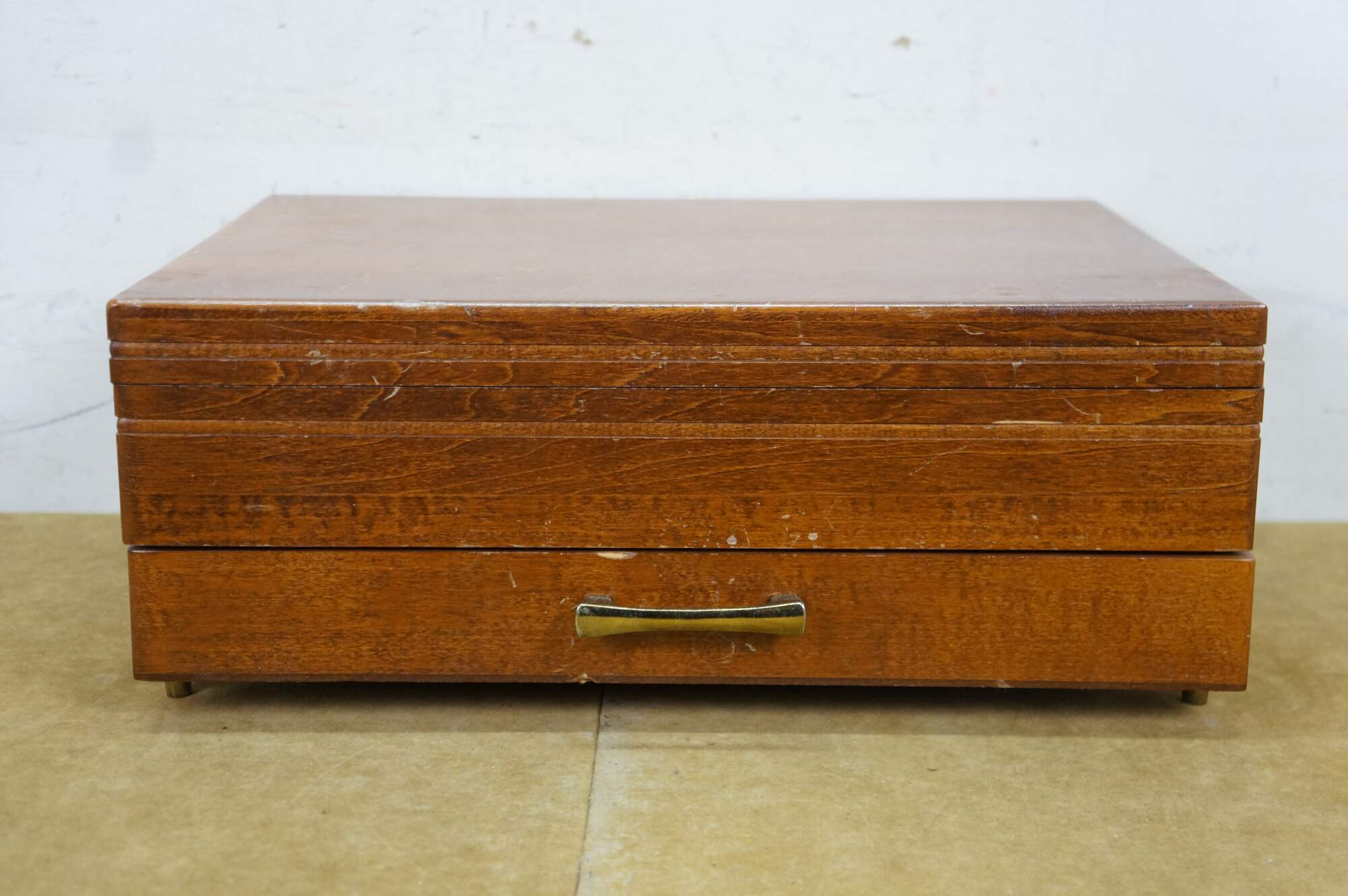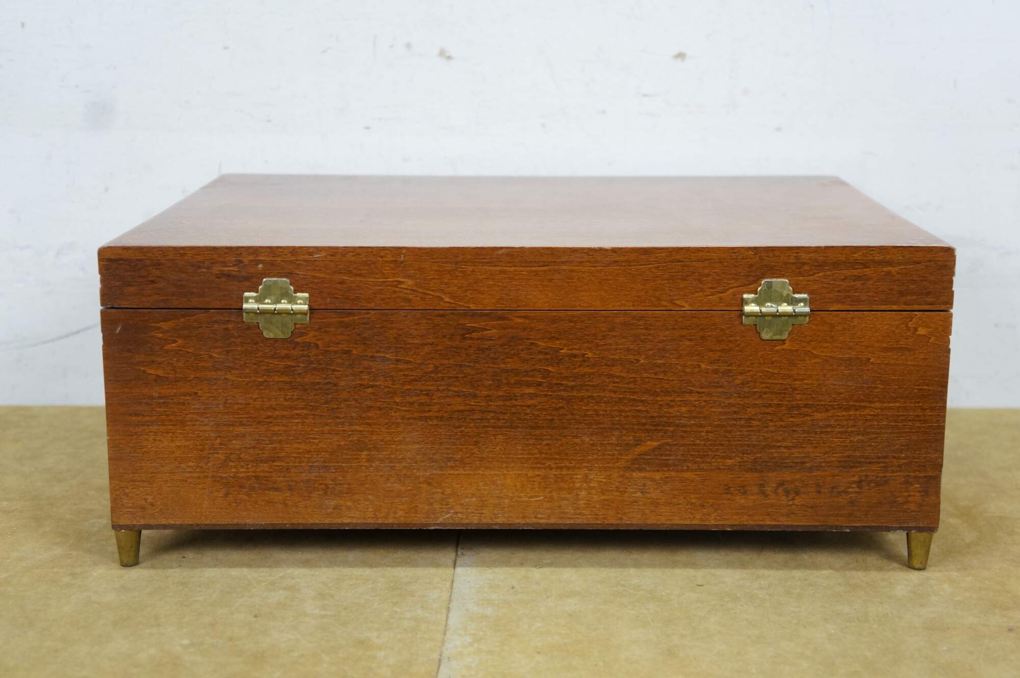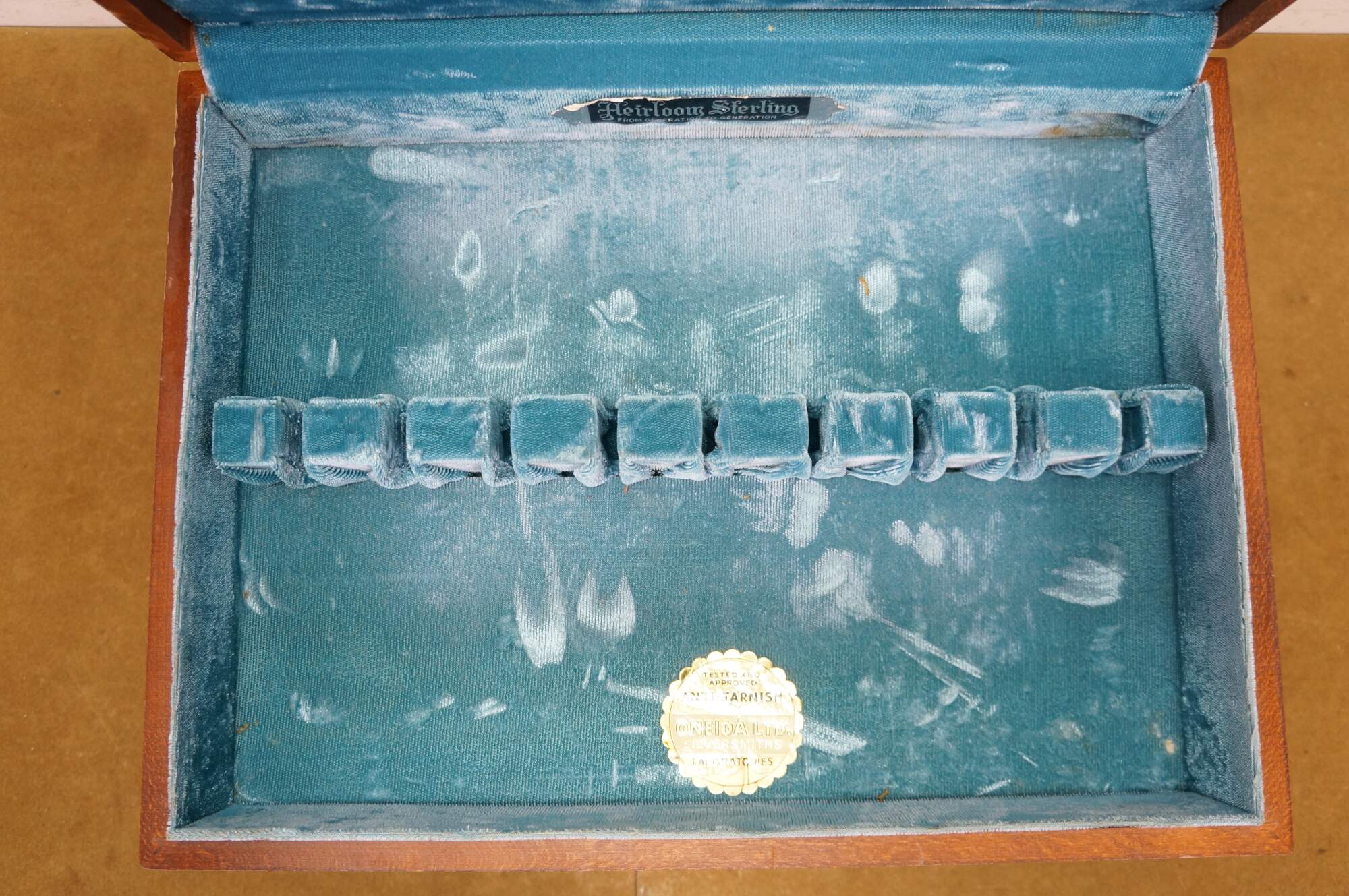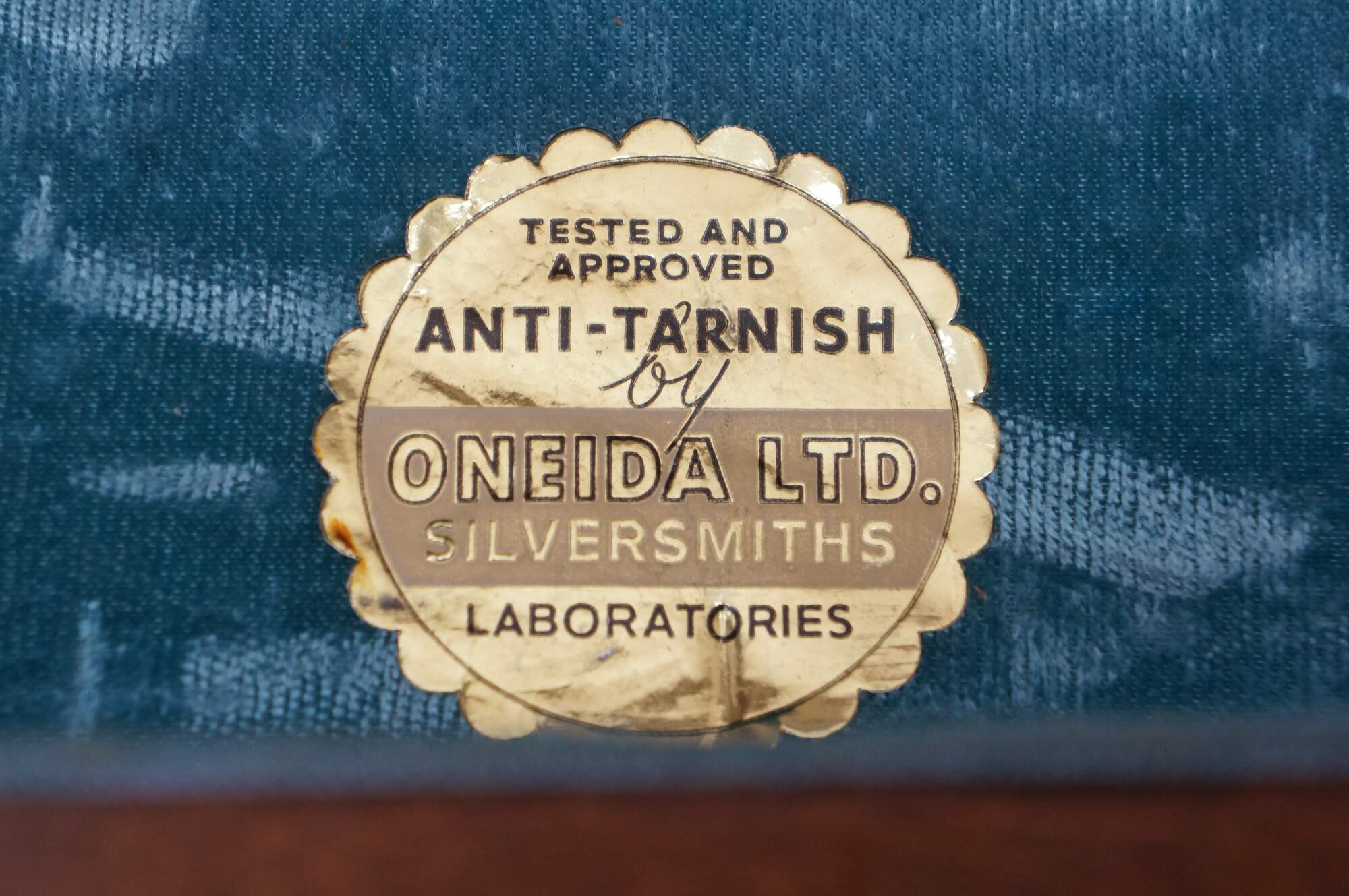 Mid century maple Oneida LTD Heirloom silver flatware cutlery storage box featuring a teal blue lining with upper divided storage area and lower drawer for larger pieces. Originally housed a collection of Sterling Silver in the Heirloom collection.