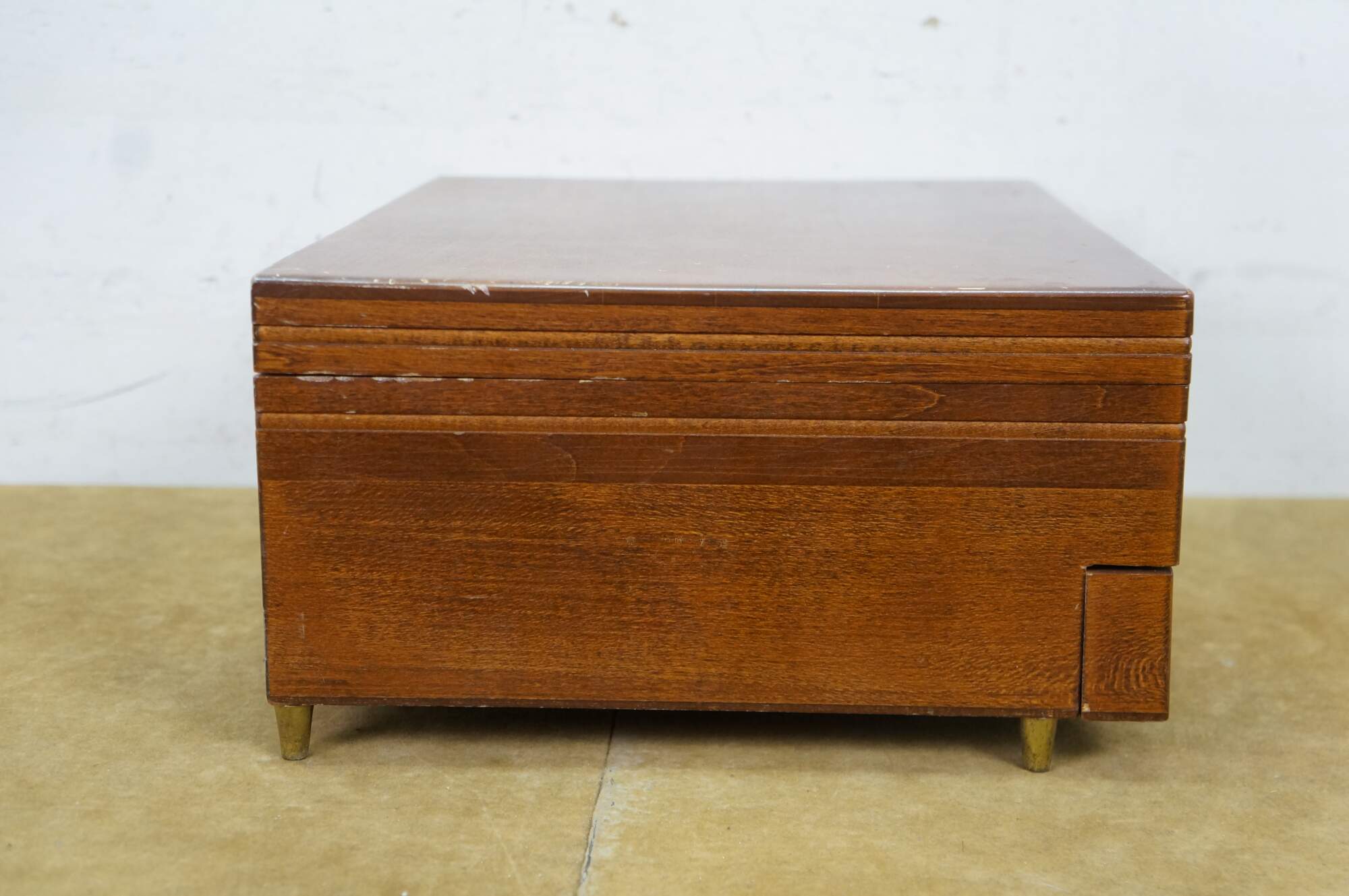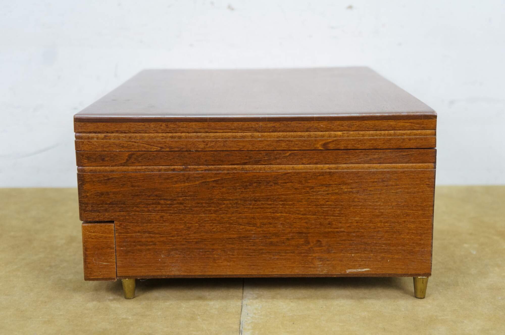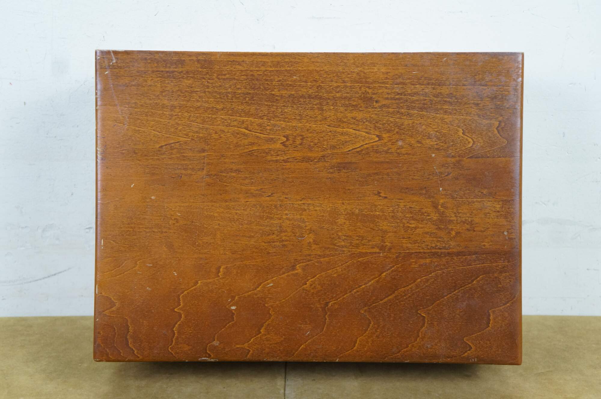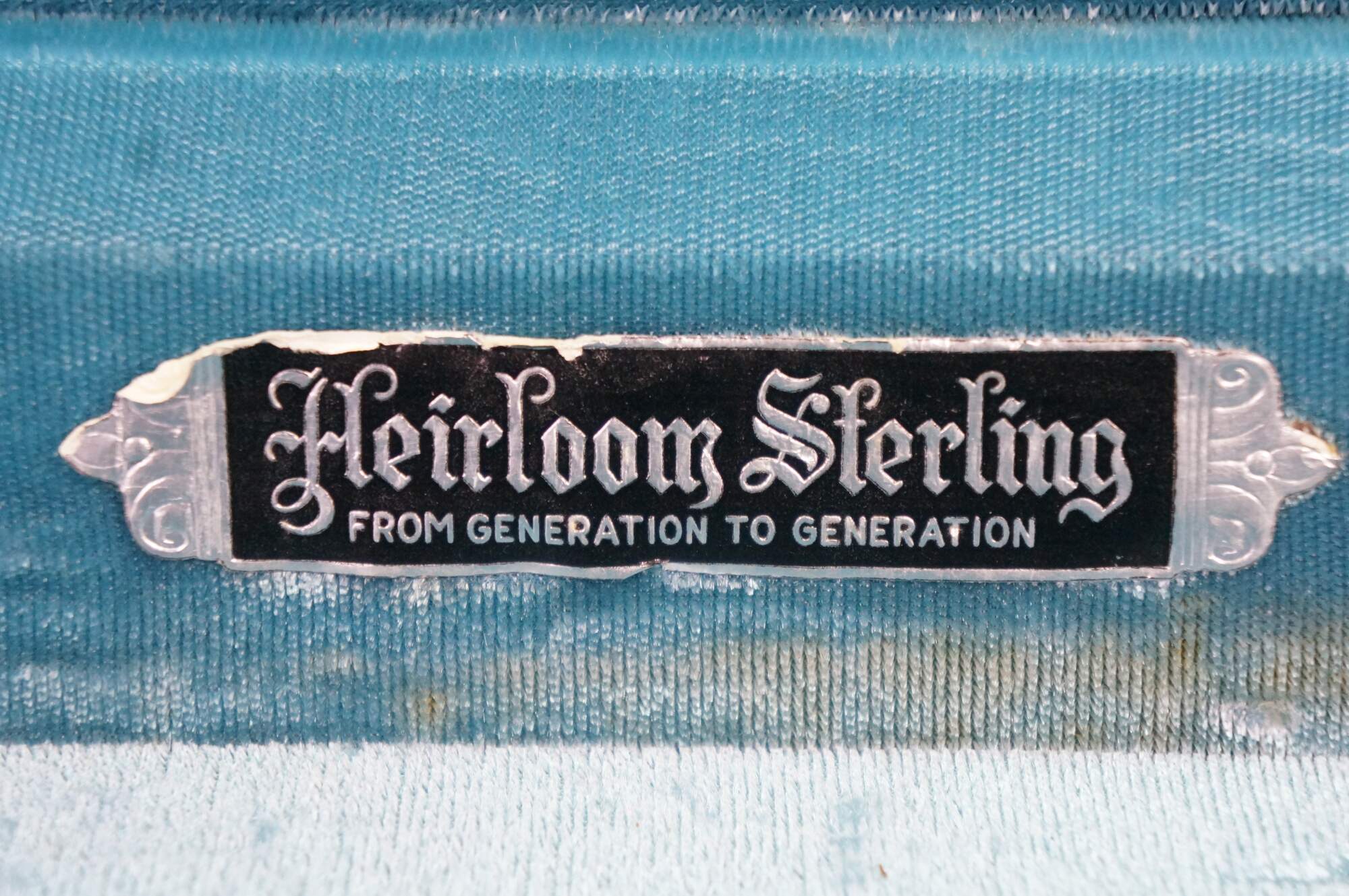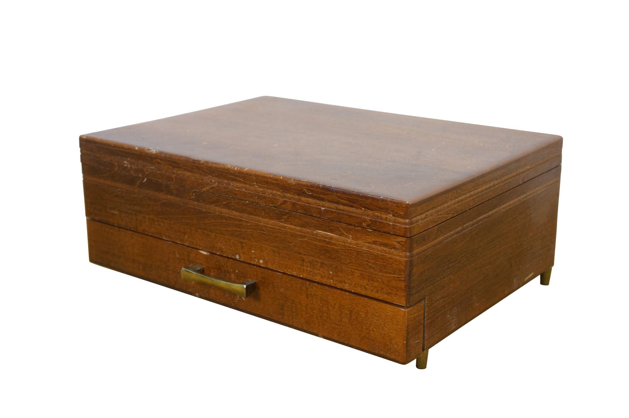 Mid century maple Oneida LTD Heirloom silver flatware cutlery storage box featuring a teal blue lining with upper divided storage area and lower drawer for larger pieces. Originally housed a collection of Sterling Silver in the Heirloom collection.