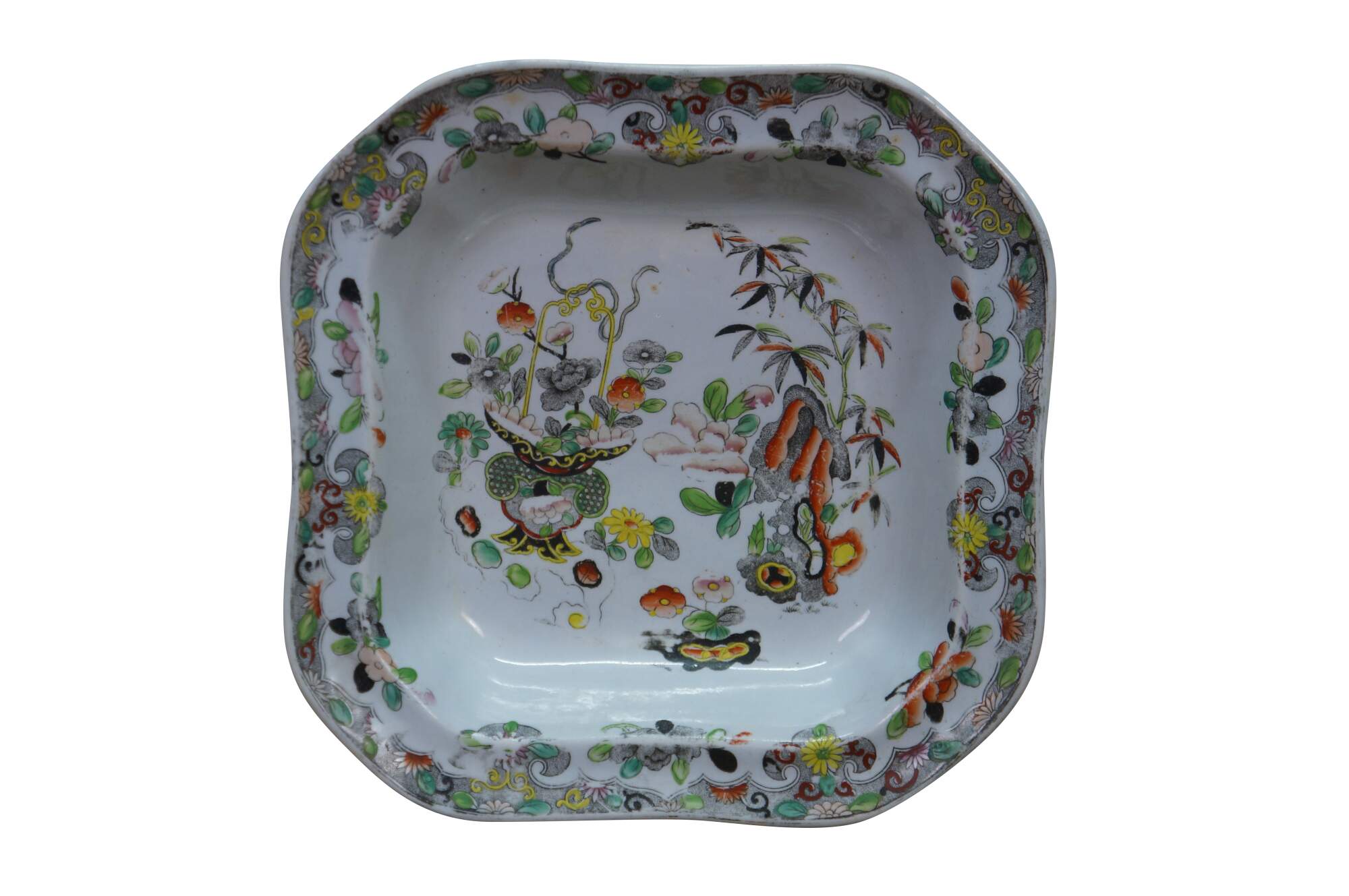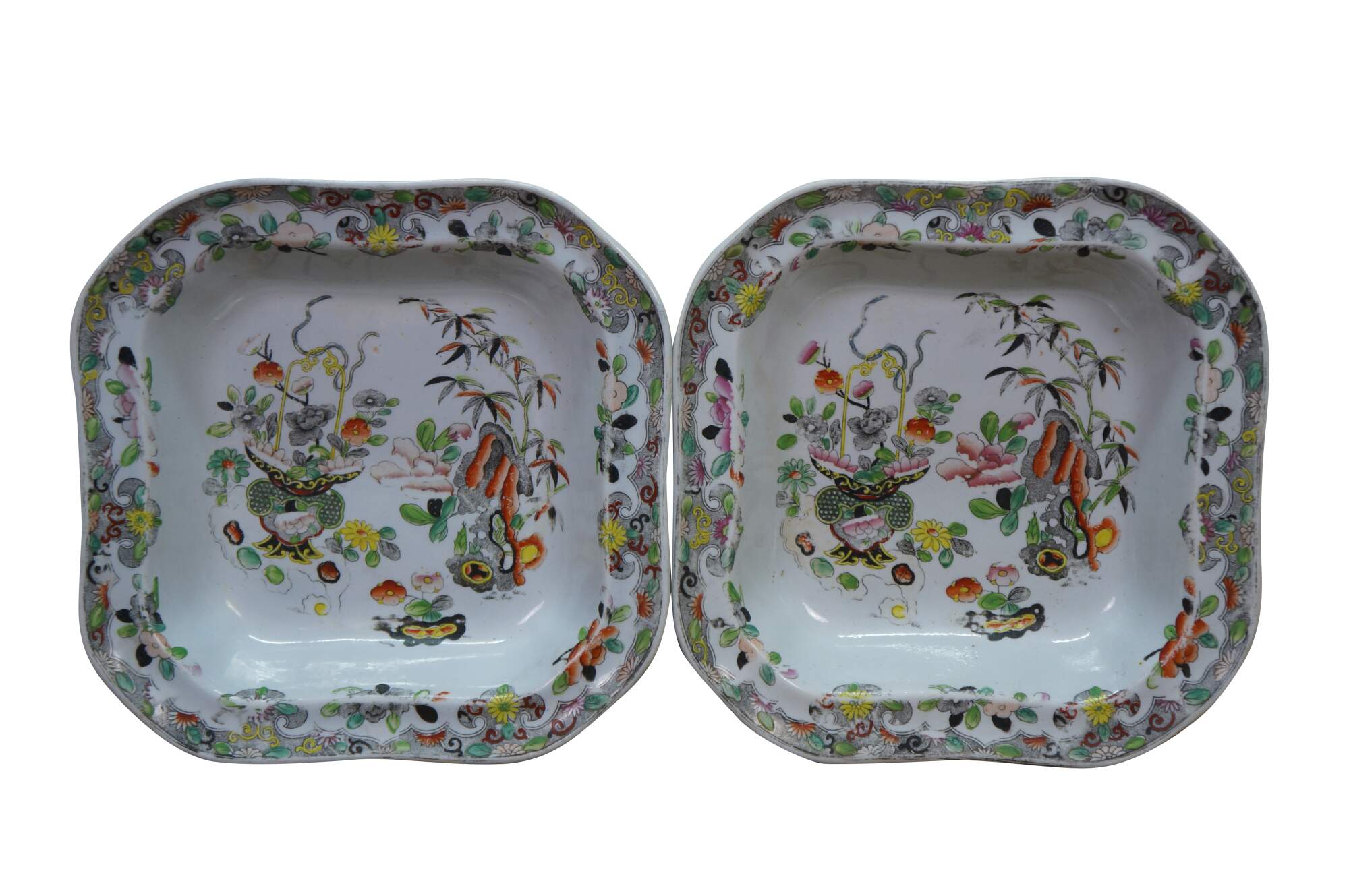 Two antique English Stephen Folch Chinoiserie Square Serving Bowls or trays in the Imari Ironstone Bamboo & Basket pattern with Royal Arms mark, Circa 1825
