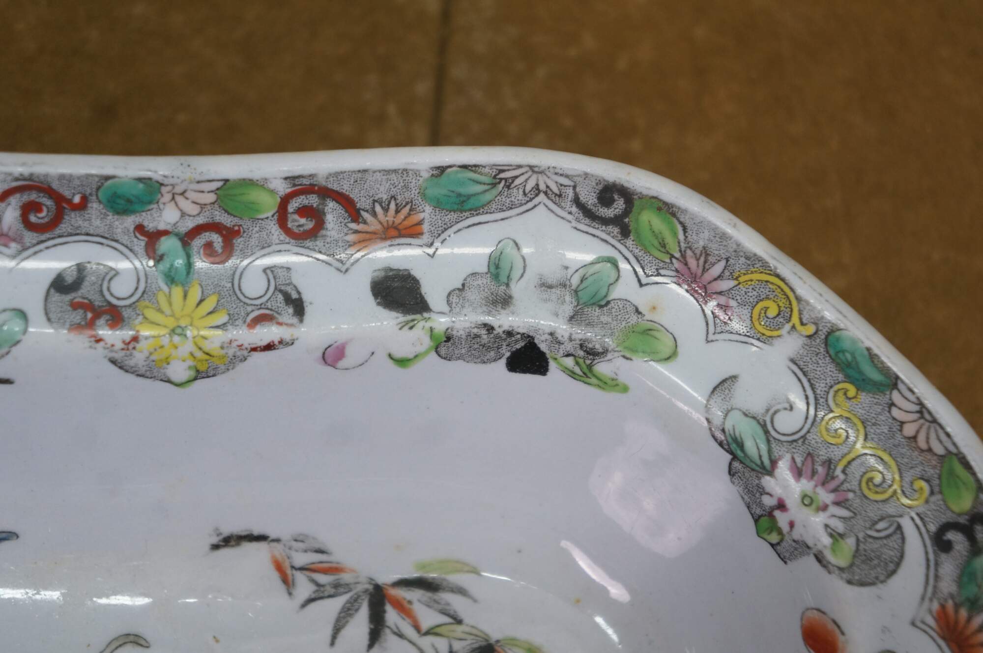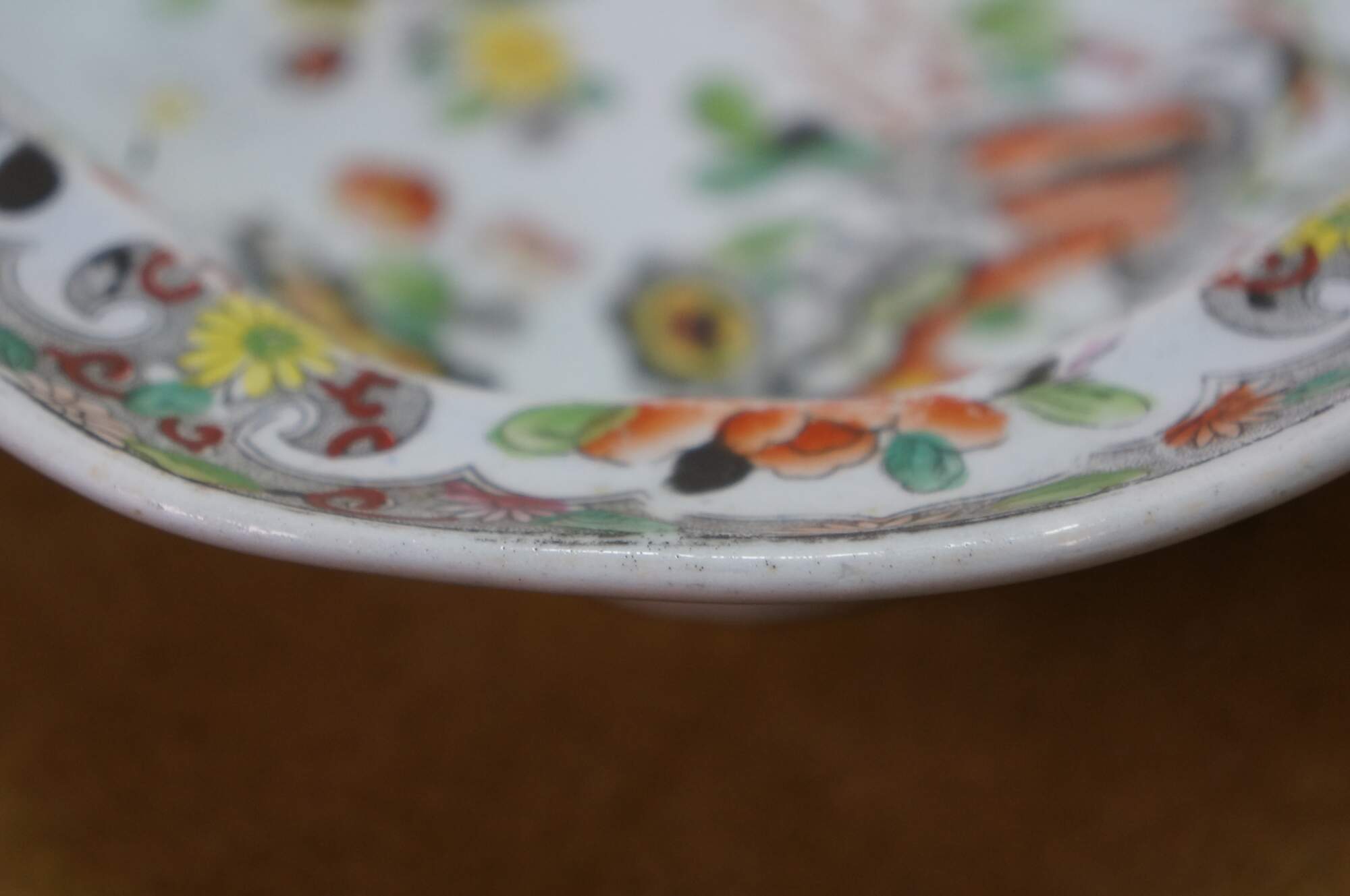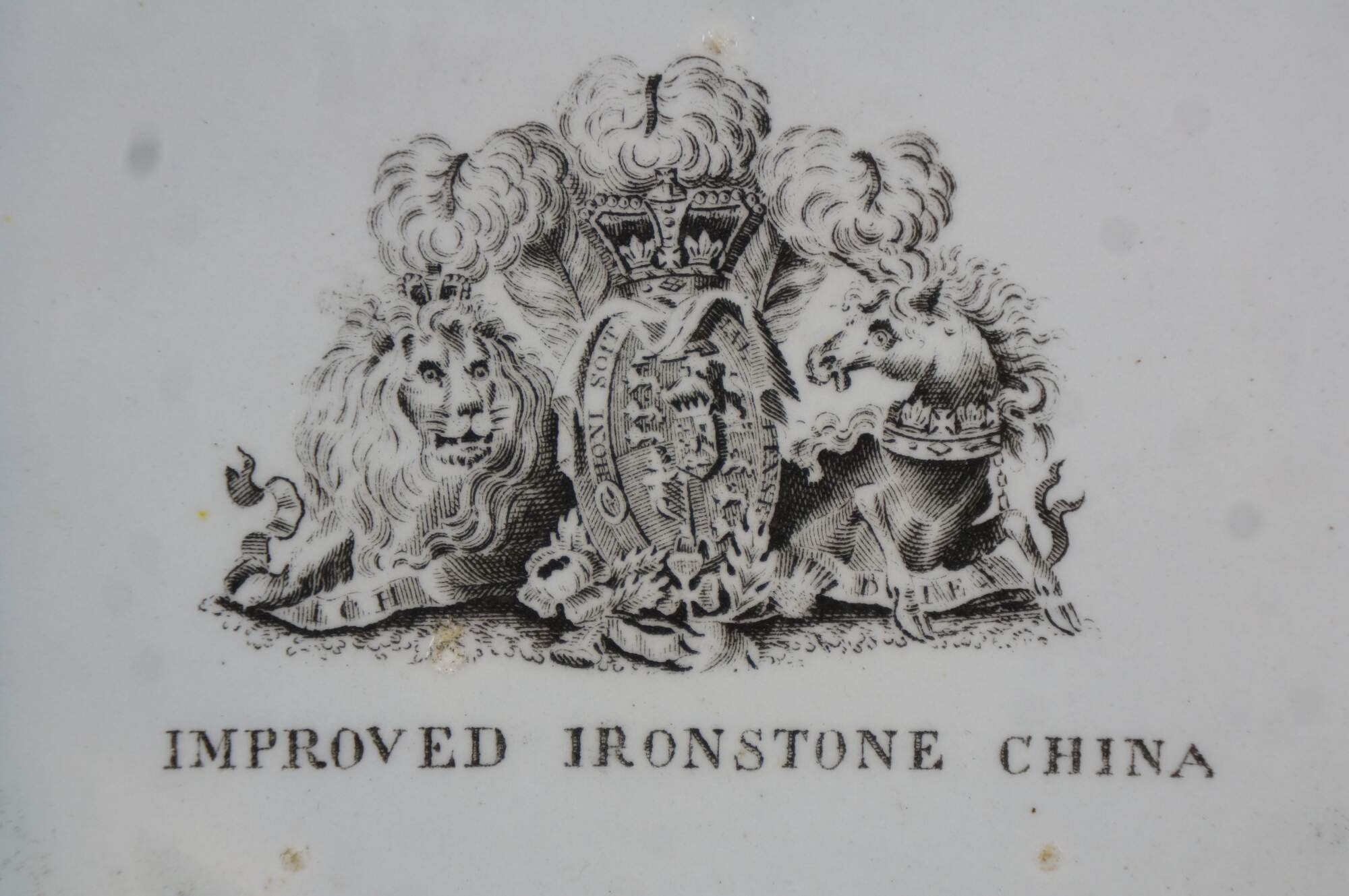 The plate is fully marked on the base with a Royal Arms mark having the Prince of Wales feathers behind and improved ironstone China below, all printed in black. A Plate in this pattern with the same back mark is illustrated on Page 243, plates 186 a & b, of Godden's Guide to Ironstone, by Geoffrey A Godden, published by The Antique Collectors' Club.