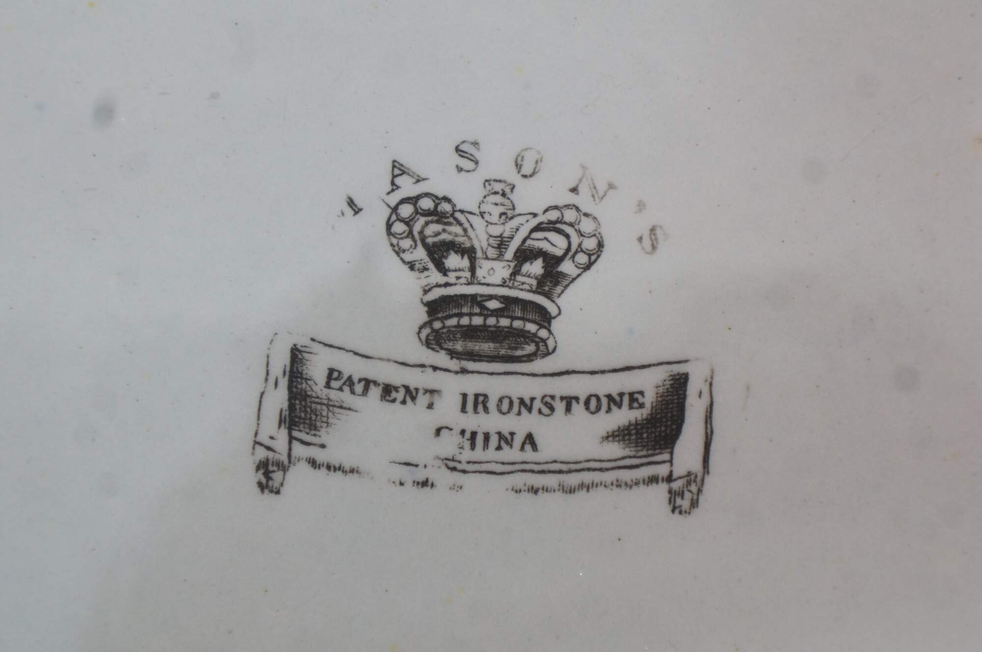 The plate is fully marked on the base with a Royal Arms mark having the Prince of Wales feathers behind and improved ironstone China below, all printed in black. A Plate in this pattern with the same back mark is illustrated on Page 243, plates 186 a & b, of Godden's Guide to Ironstone, by Geoffrey A Godden, published by The Antique Collectors' Club.