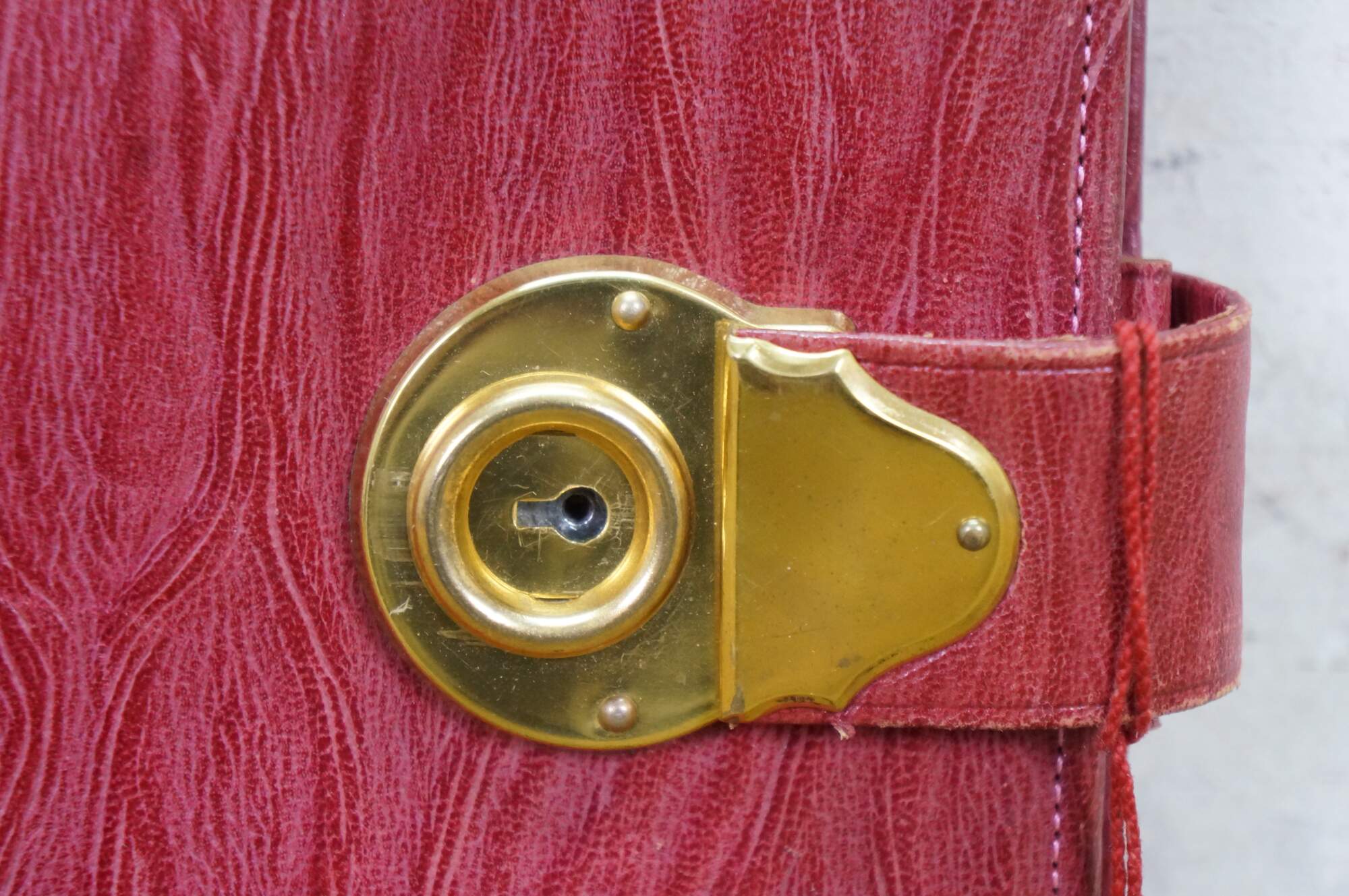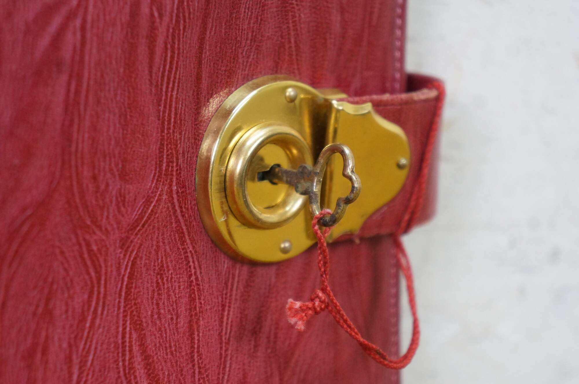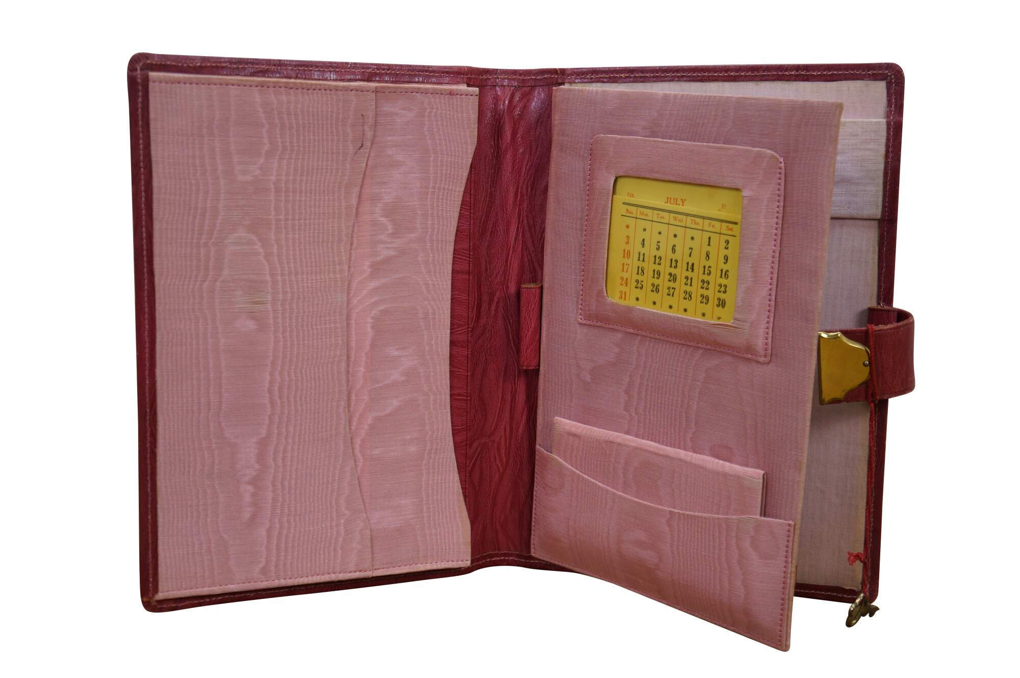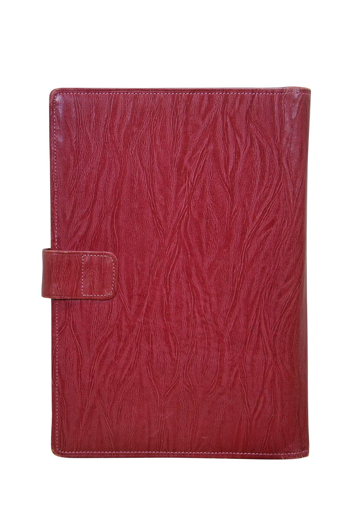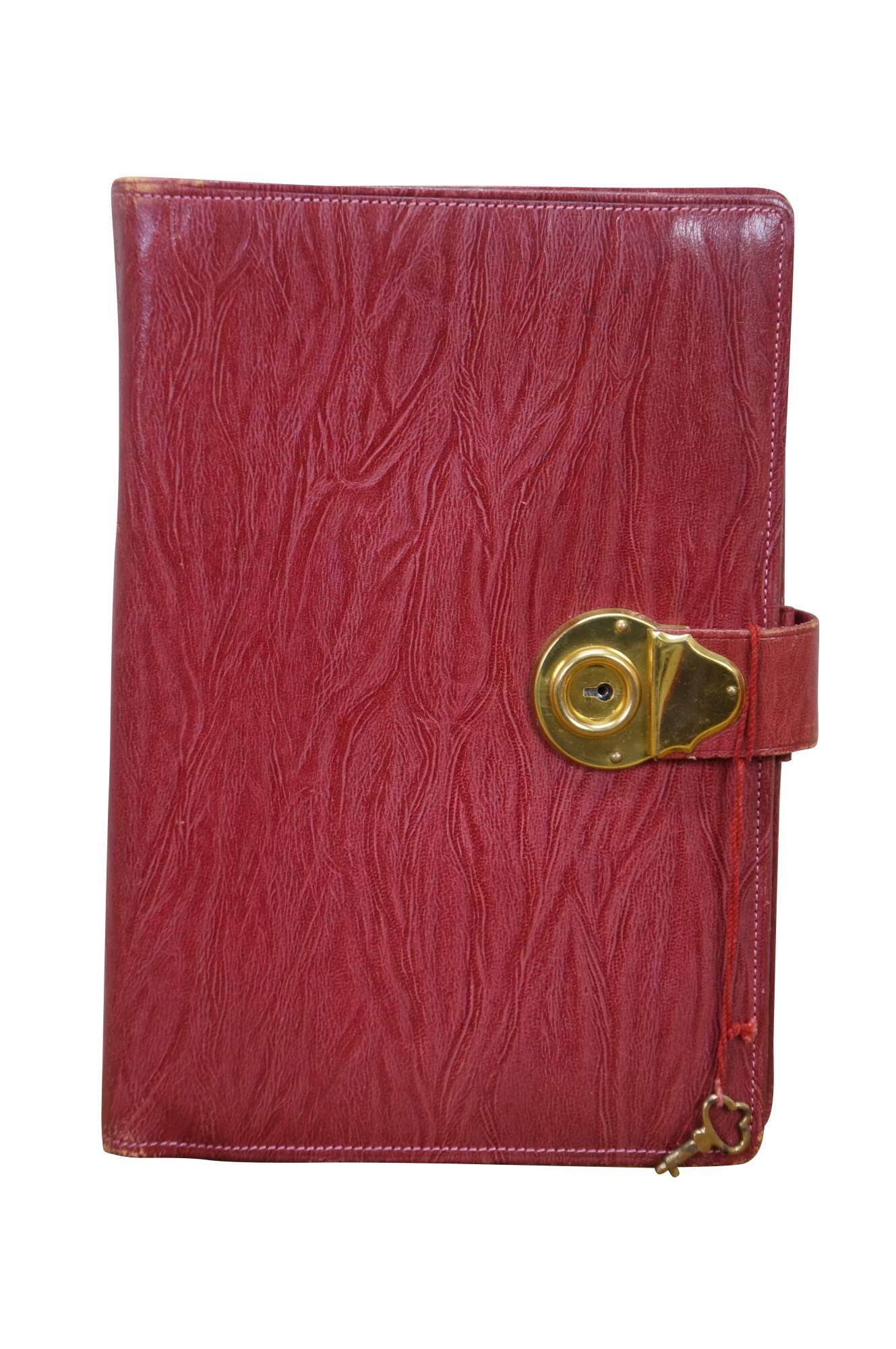 Vintage red leather textured planner with lock and key, circa 1970s. Features a pencil holder, calender sleeve, central divider, notebook and several folder compartments. The case has a functional skeleton lock and key.