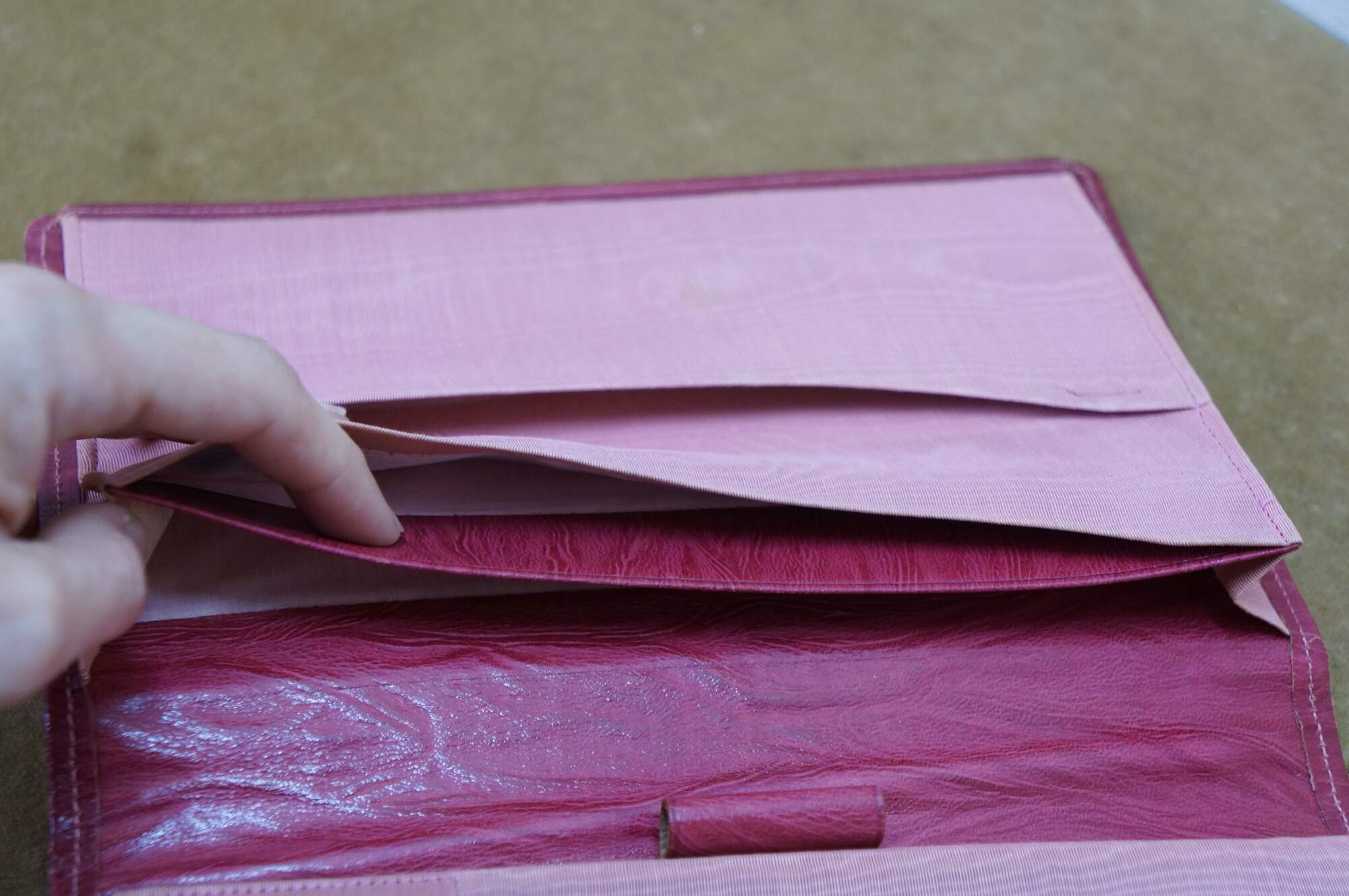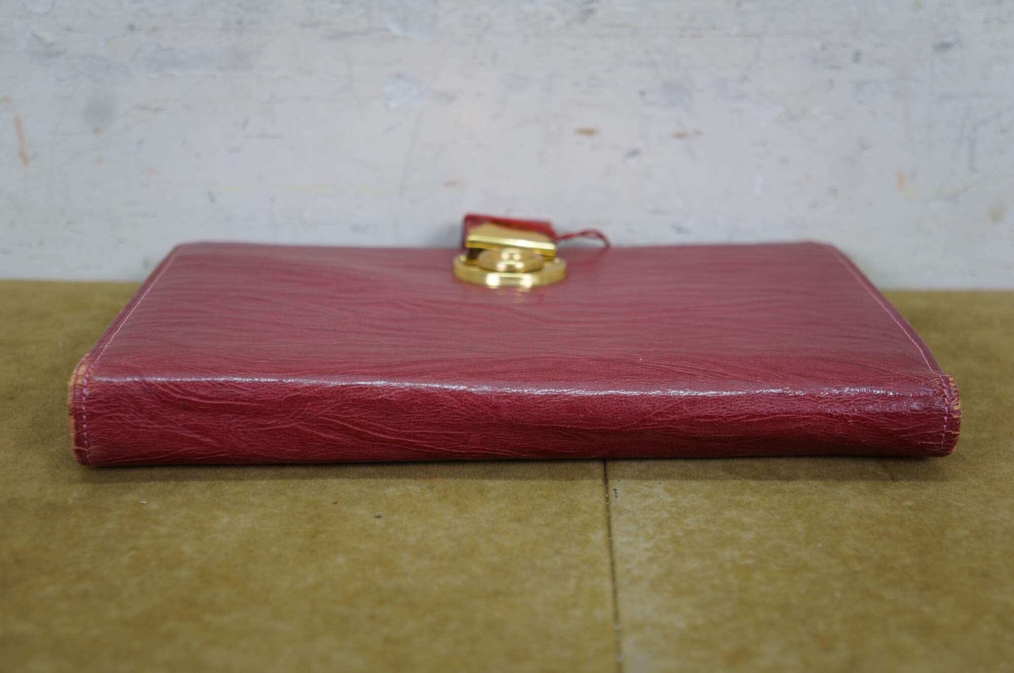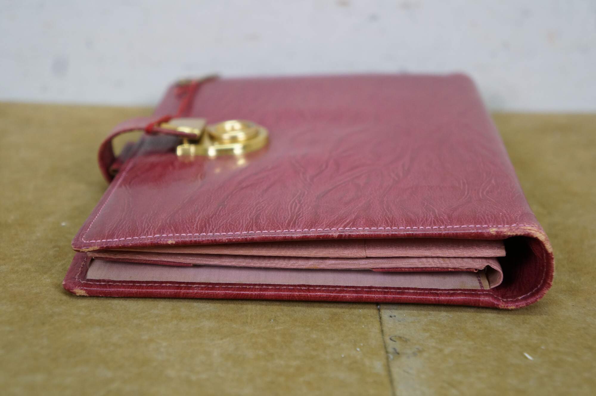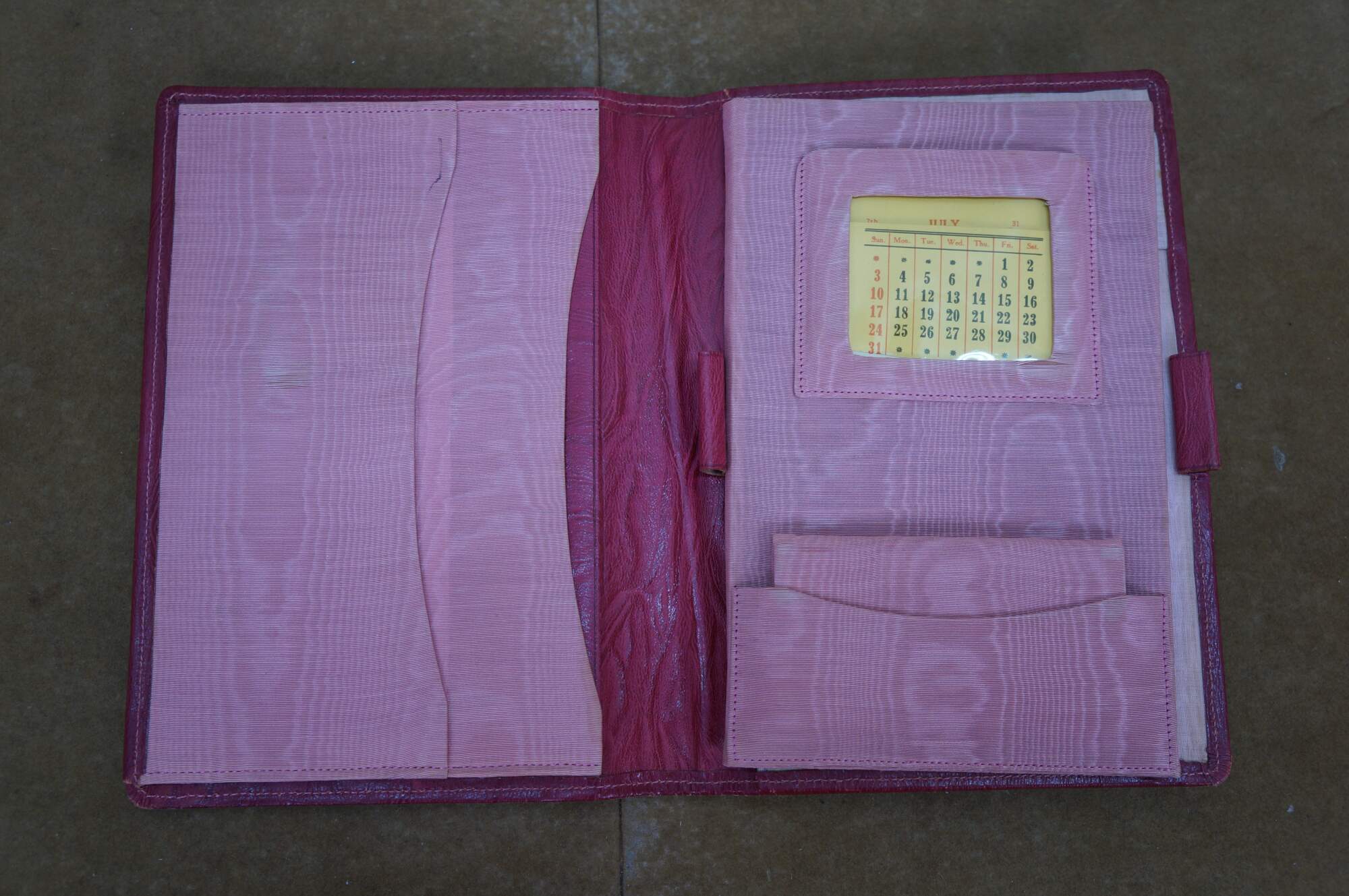 Vintage red leather textured planner with lock and key, circa 1970s. Features a pencil holder, calender sleeve, central divider, notebook and several folder compartments. The case has a functional skeleton lock and key.