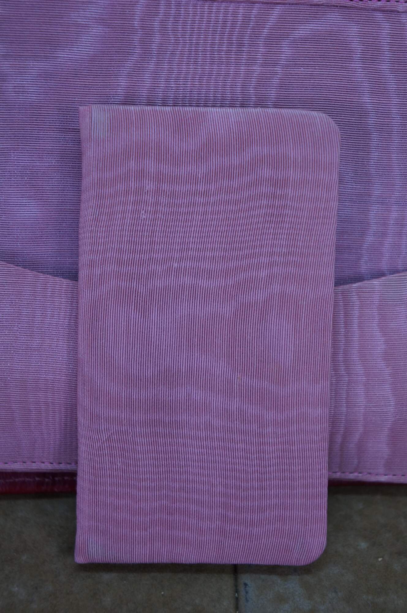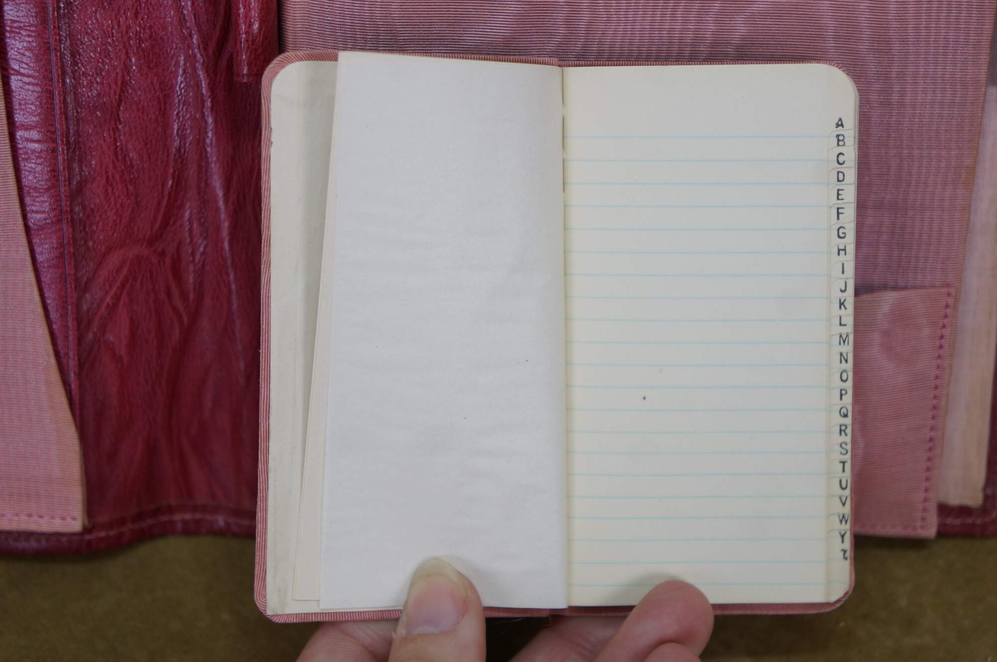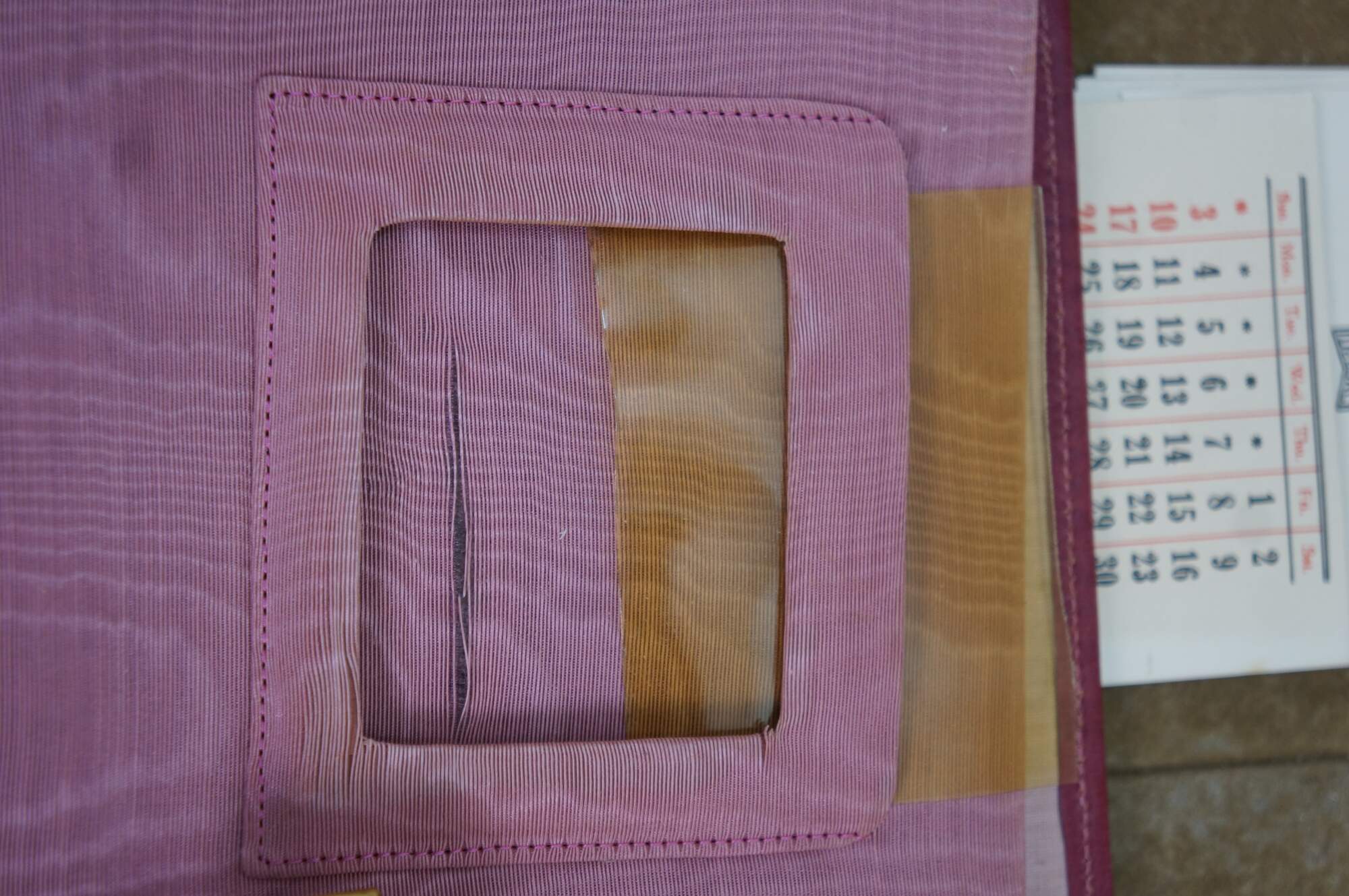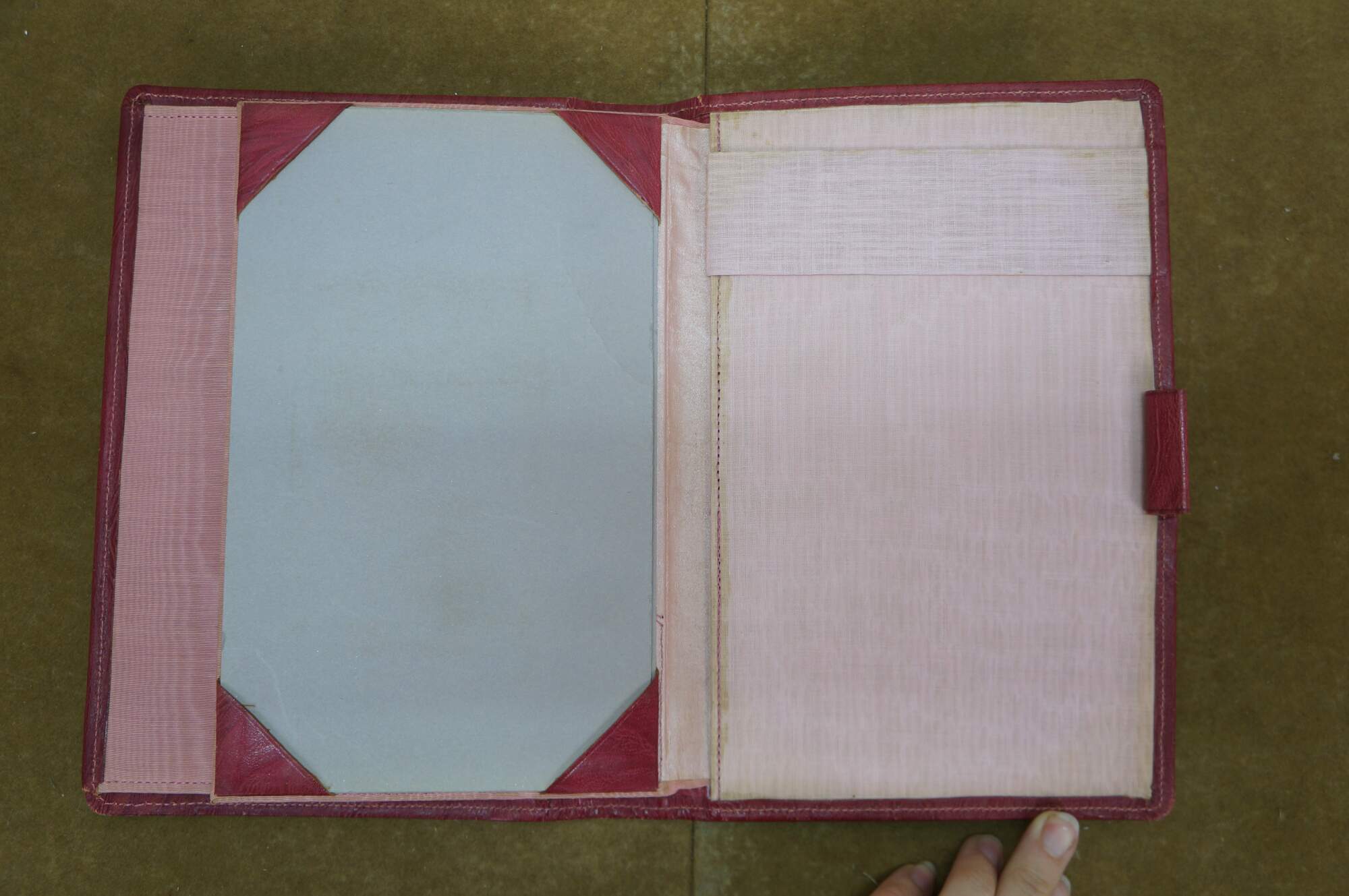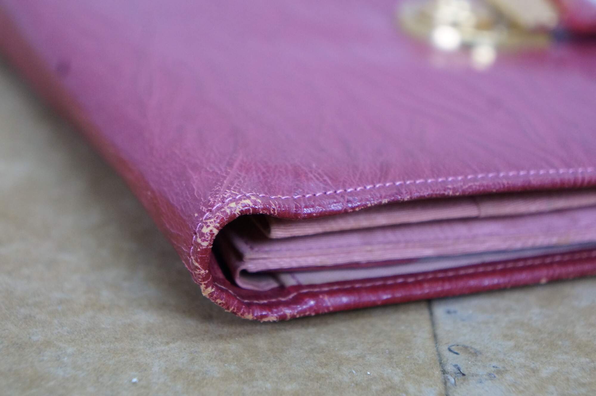 Vintage red leather textured planner with lock and key, circa 1970s. Features a pencil holder, calender sleeve, central divider, notebook and several folder compartments. The case has a functional skeleton lock and key.