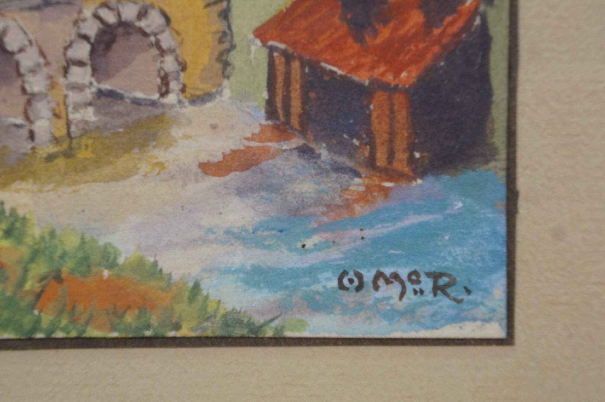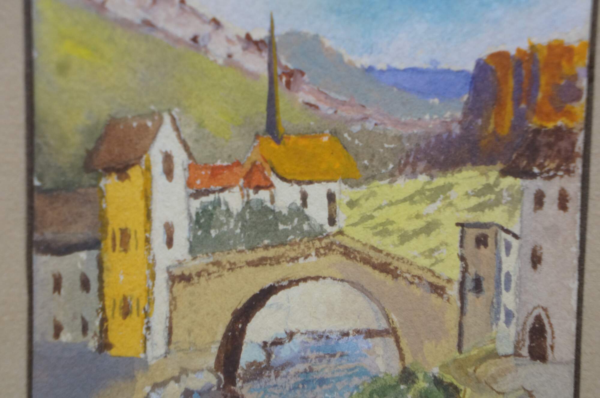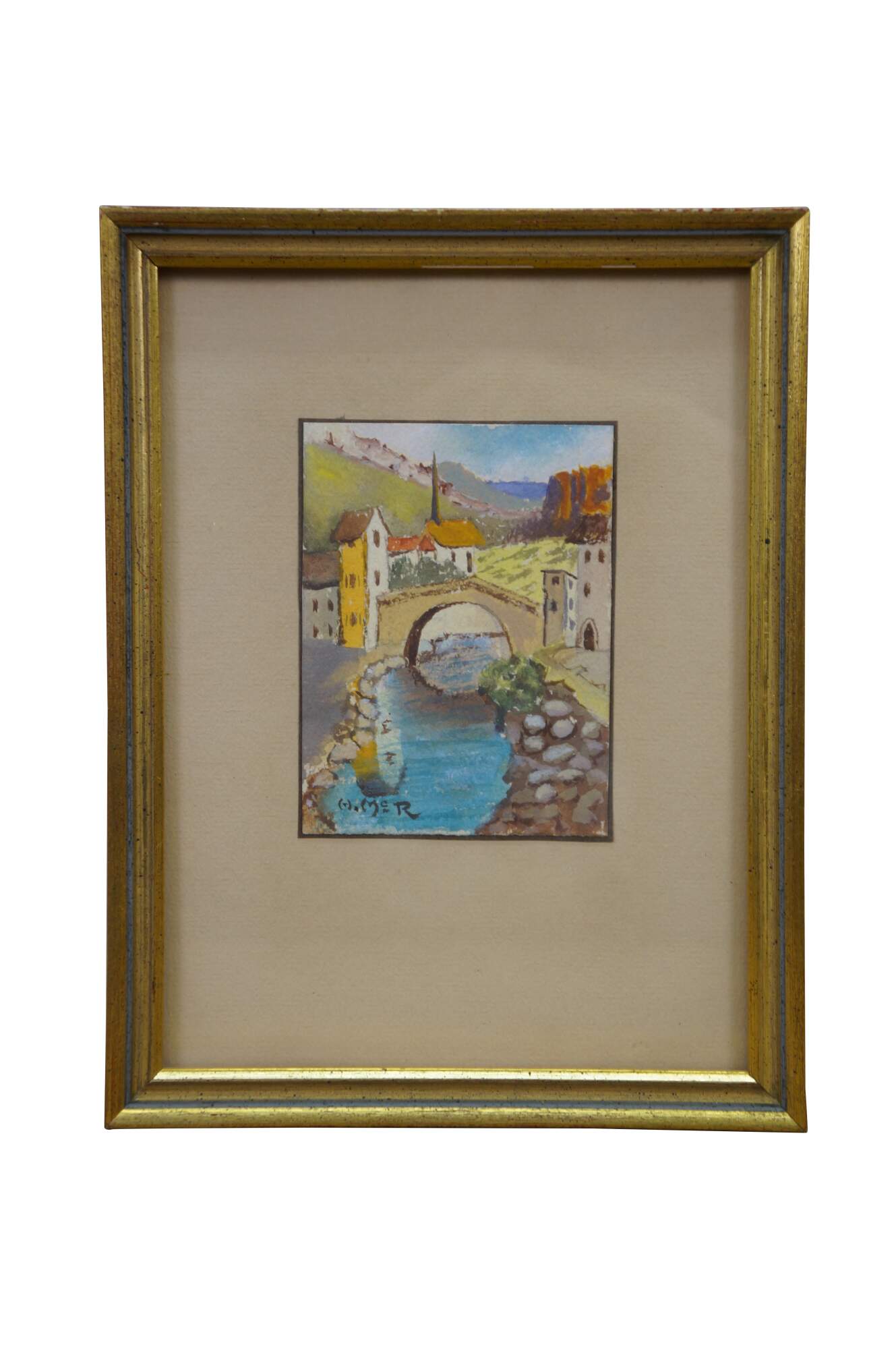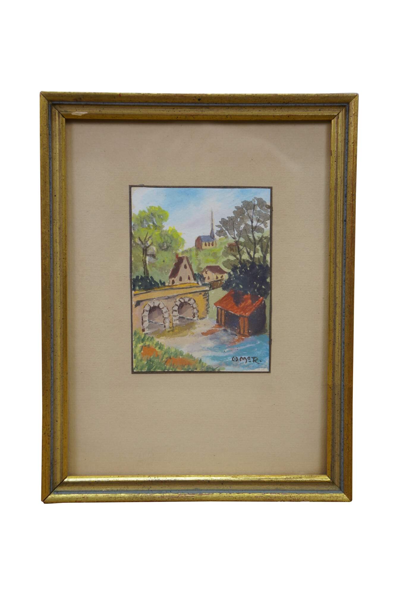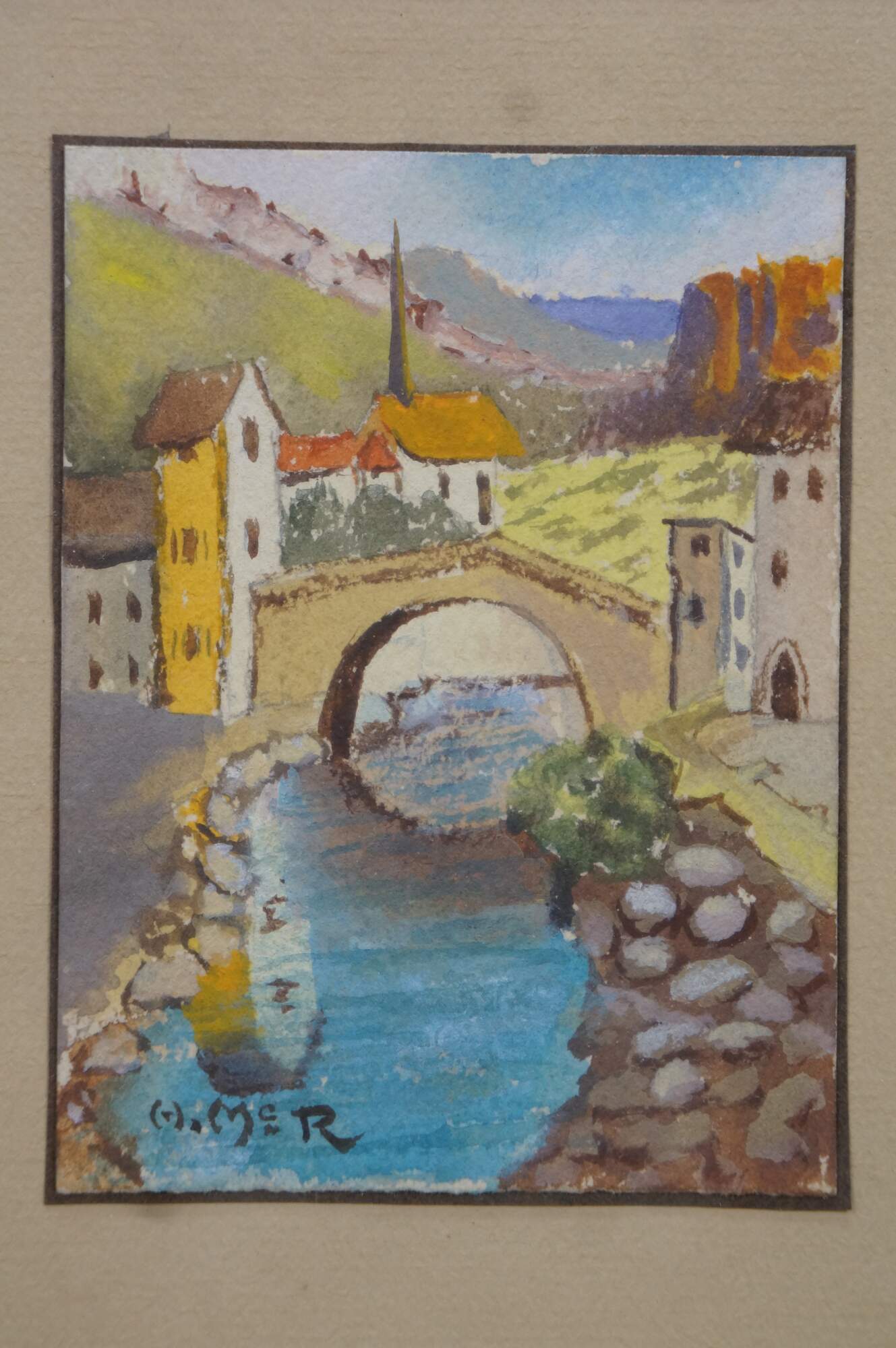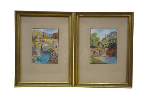 2 Mid Century Still Life Watercolor Paintings by Helen J. McRae of New York. Circa mid-20th Century. Helen had masters in Fine Art. The two paintings highlight cityscape centered around bridges. Signed lower corners. Neatly framed on a beige mat with gold finished frame.