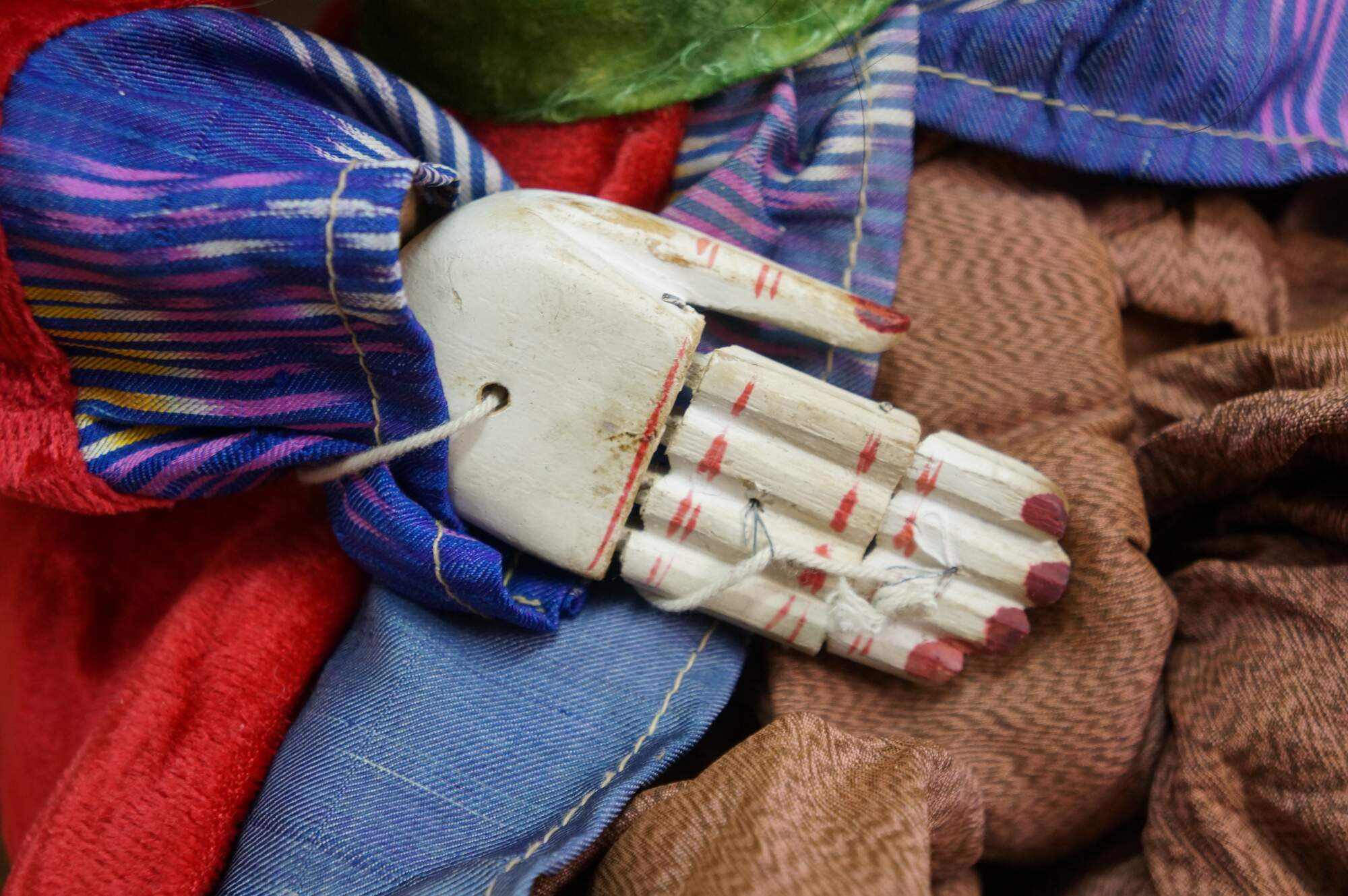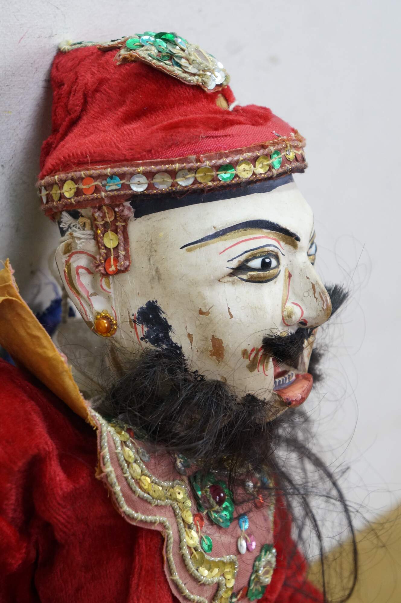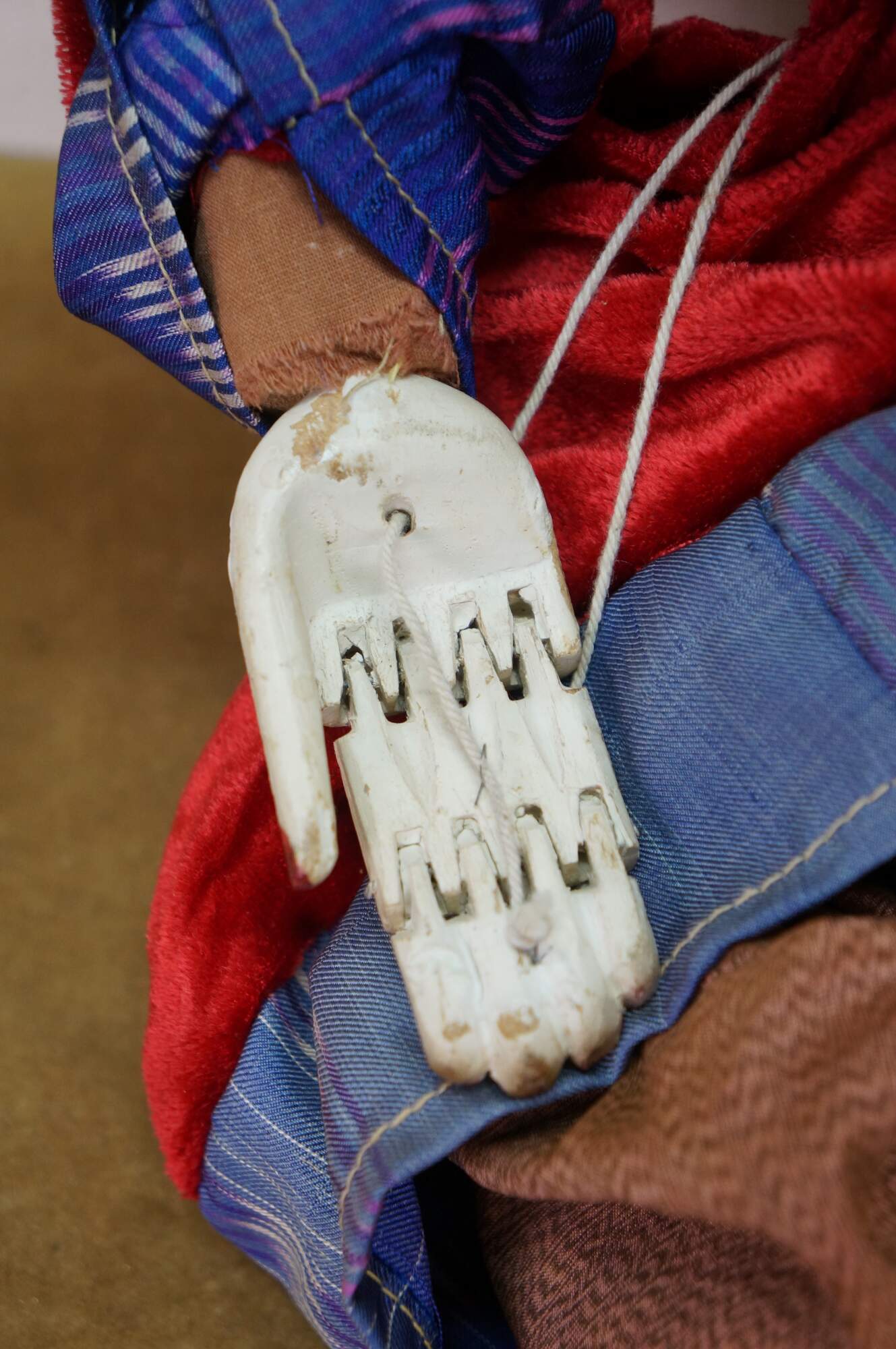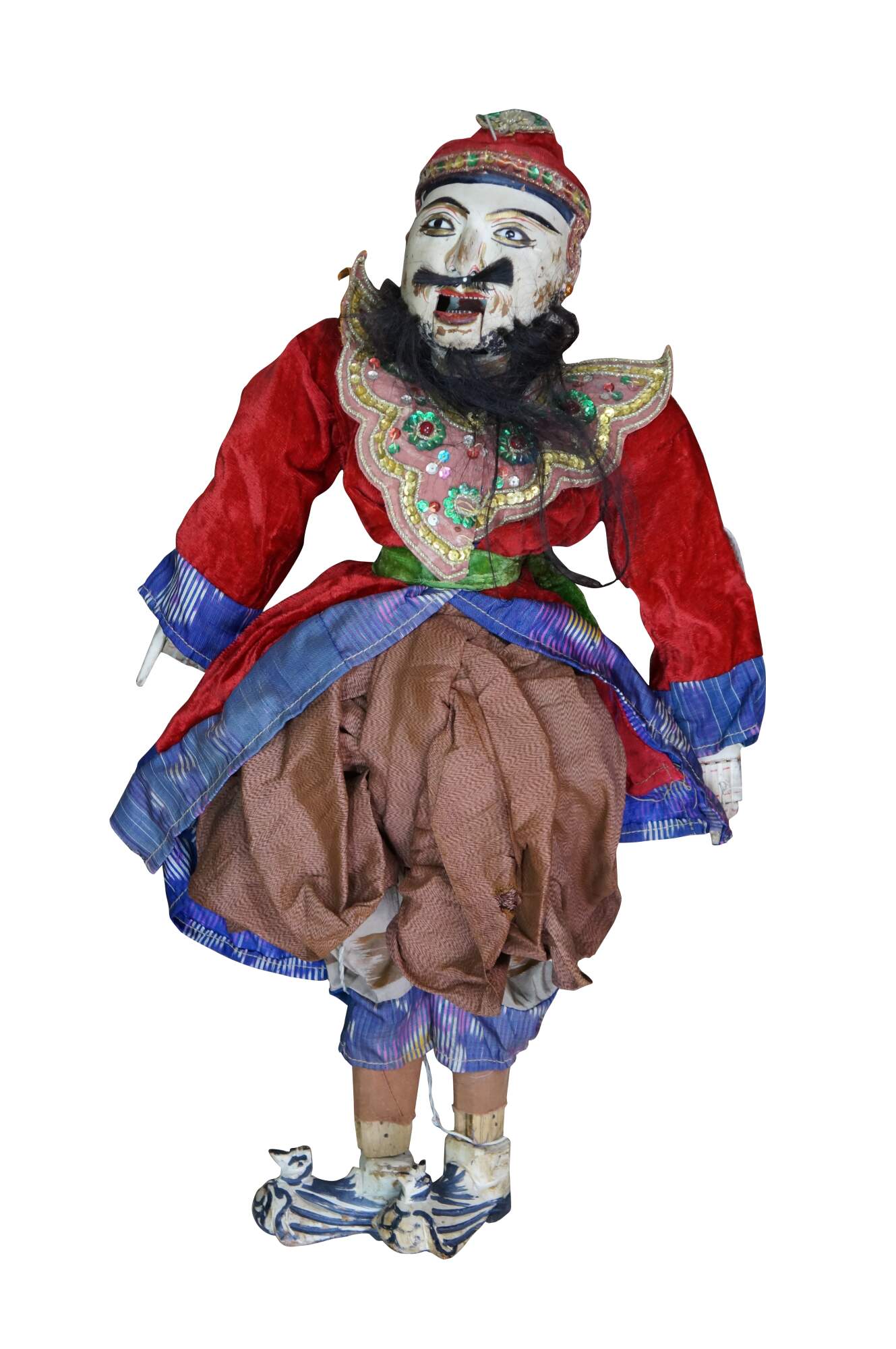 Burmese carved wood marionette of the alchemist Zawgyi, this jointed puppet used in the traditional Burmese puppet theatre (yoke thay) in a story of creation from the Hindu epic the Ramayana, Zawgyi is one of the most difficult parts to perform and only the most experienced puppeteers command this marionette