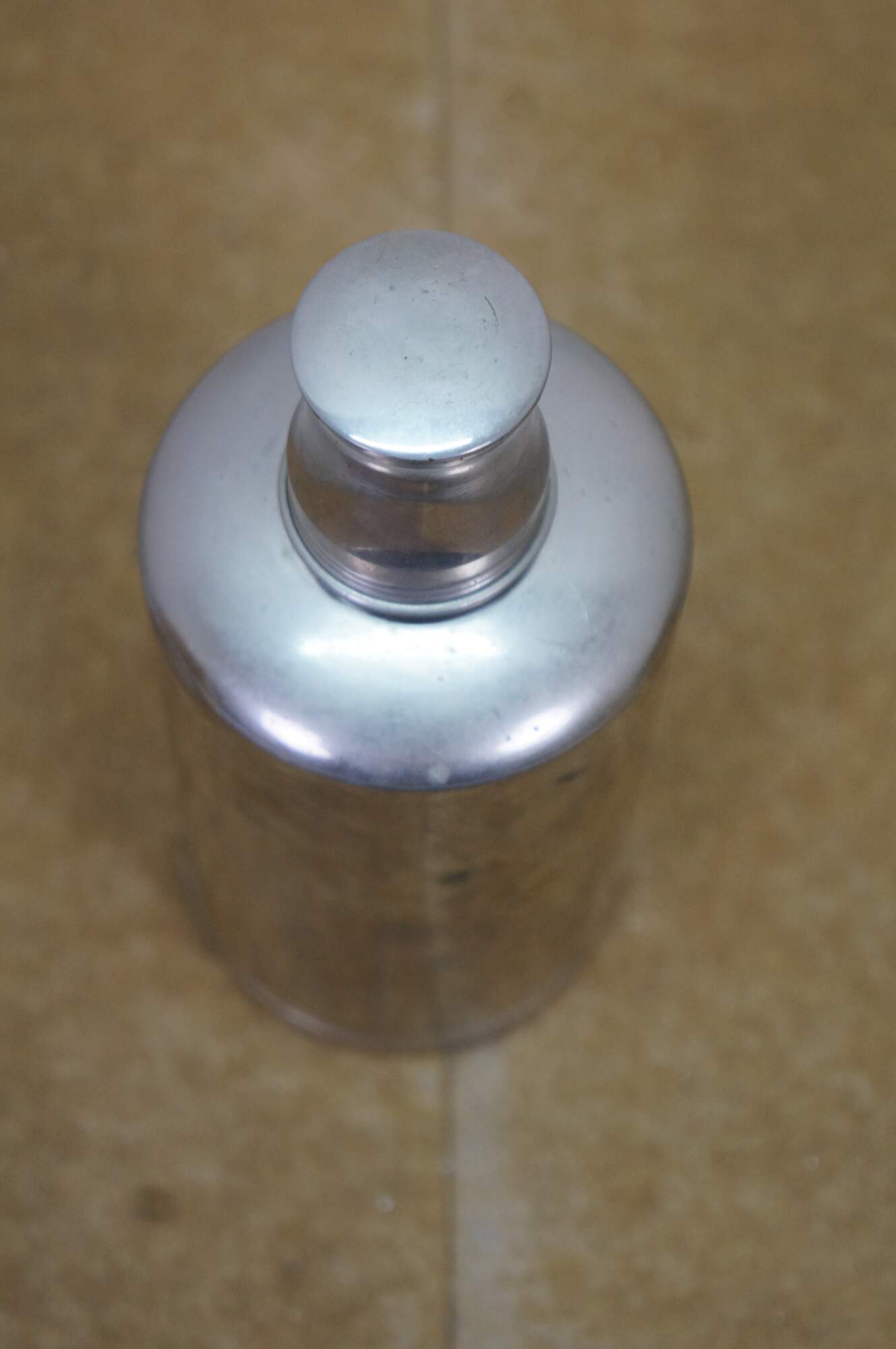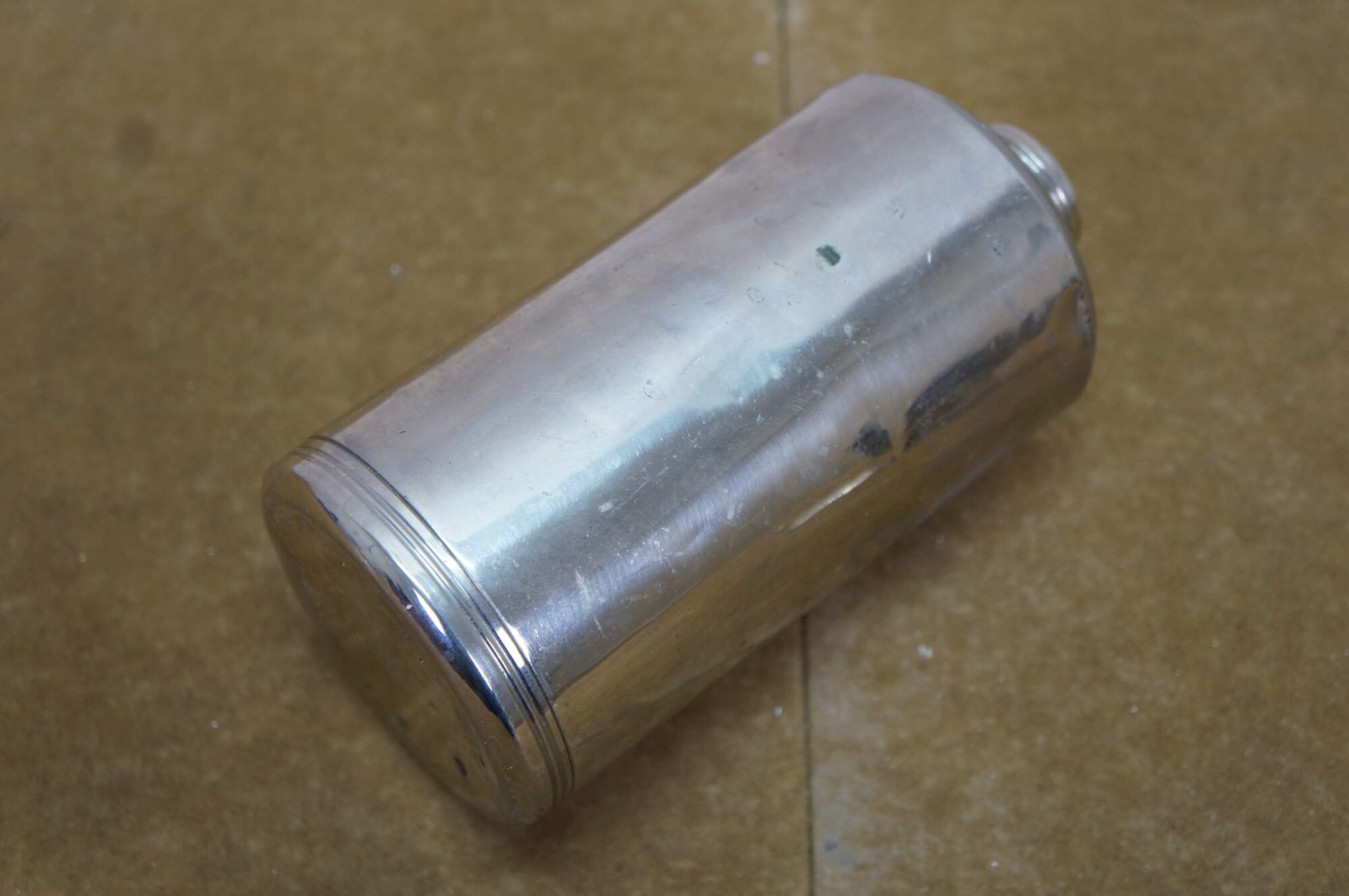 A unique early 20th Century silver plate liquor flask. Features a glass ground stopper and screw on lid / shot glass. Great for use on the go or display at your bar.