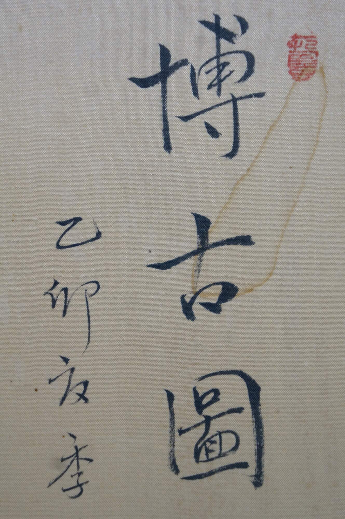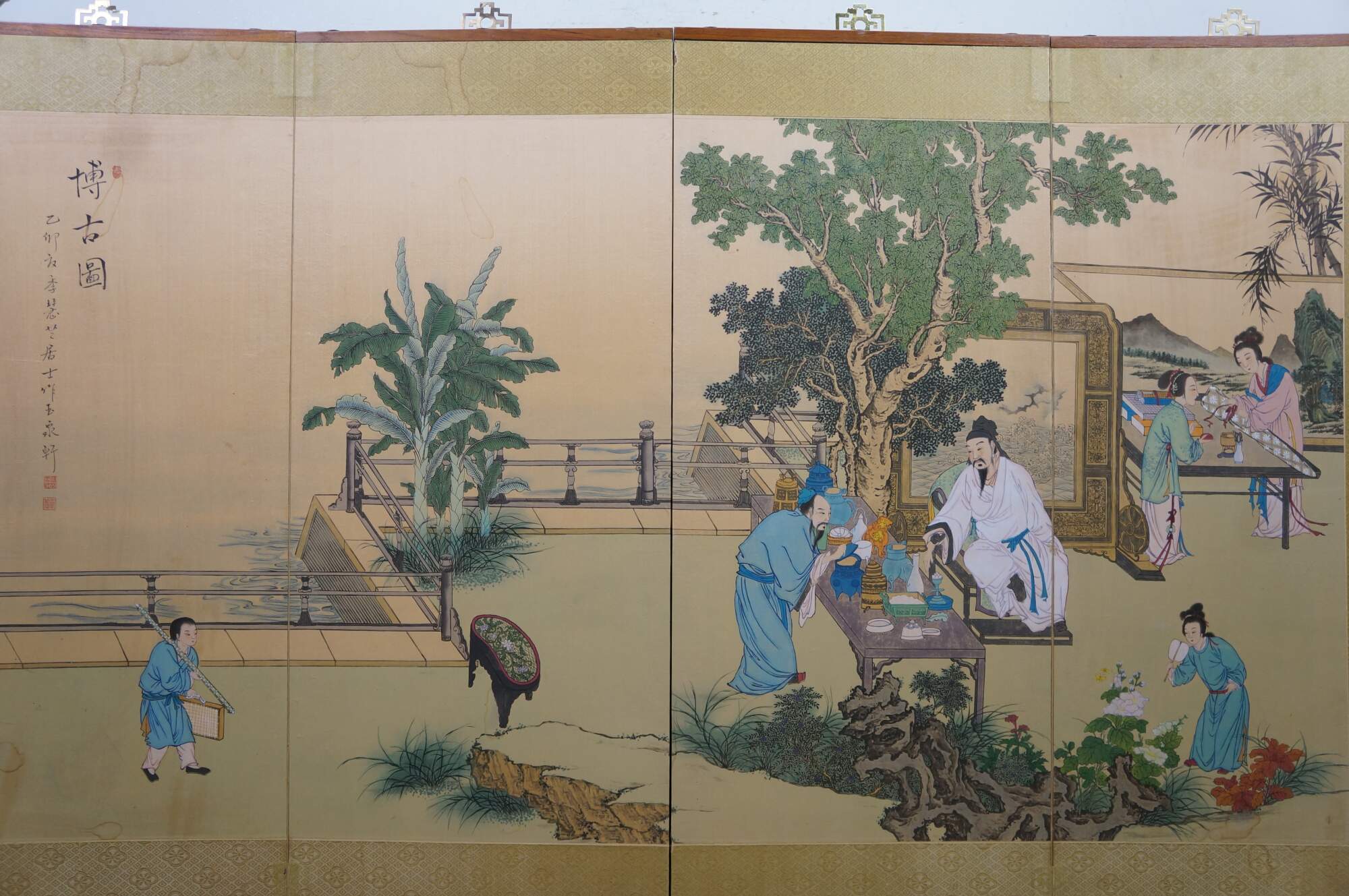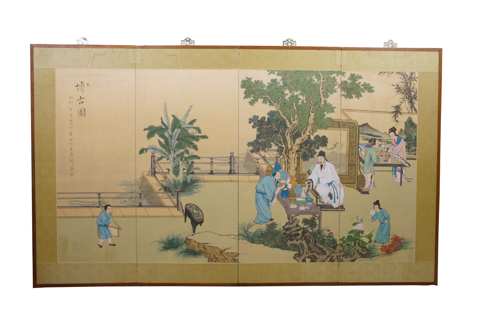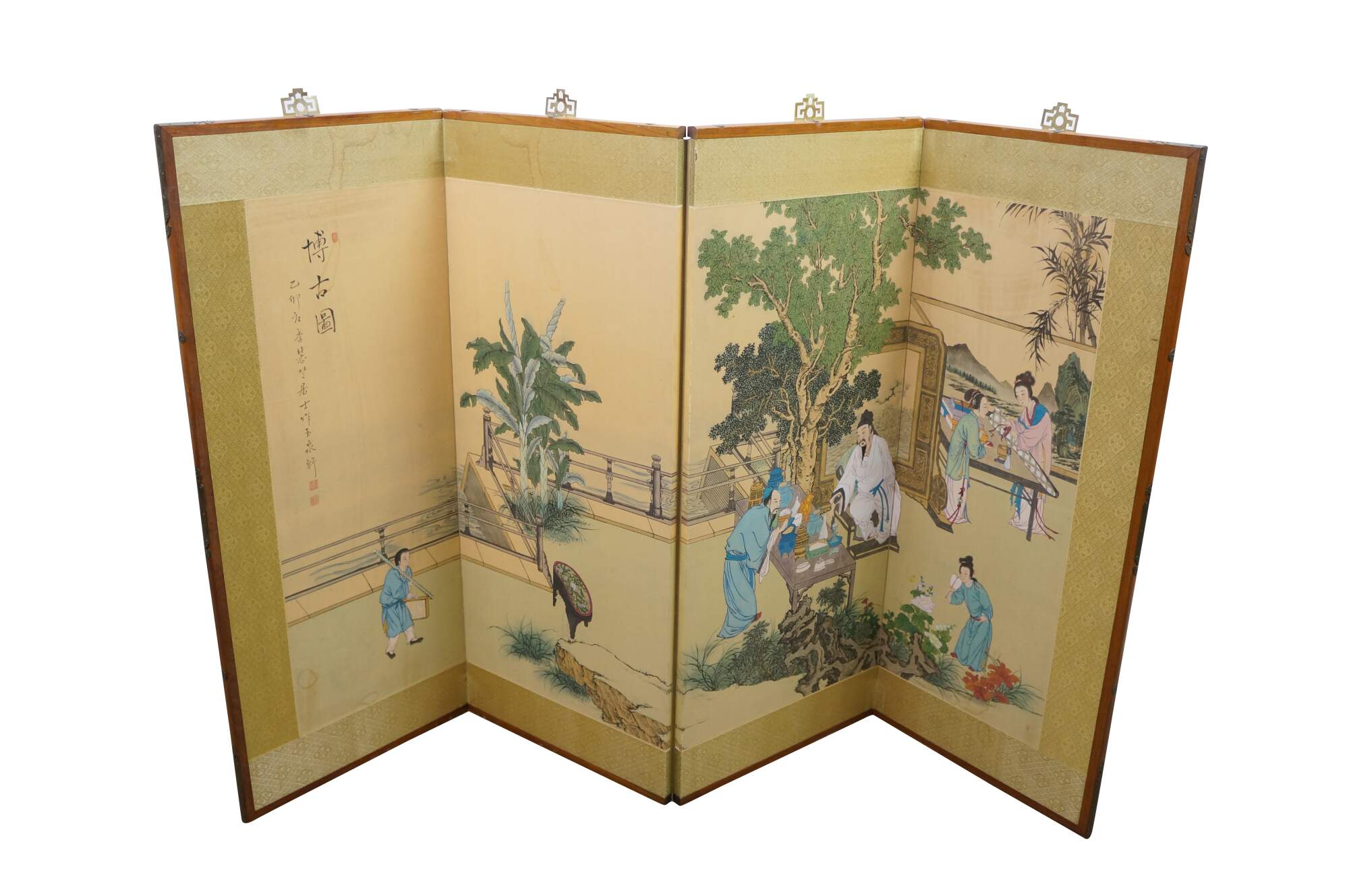 Chinese Hand Painted Silk 4 Panel Folding Screen Scholars Landscape Bógǔ tú 59"