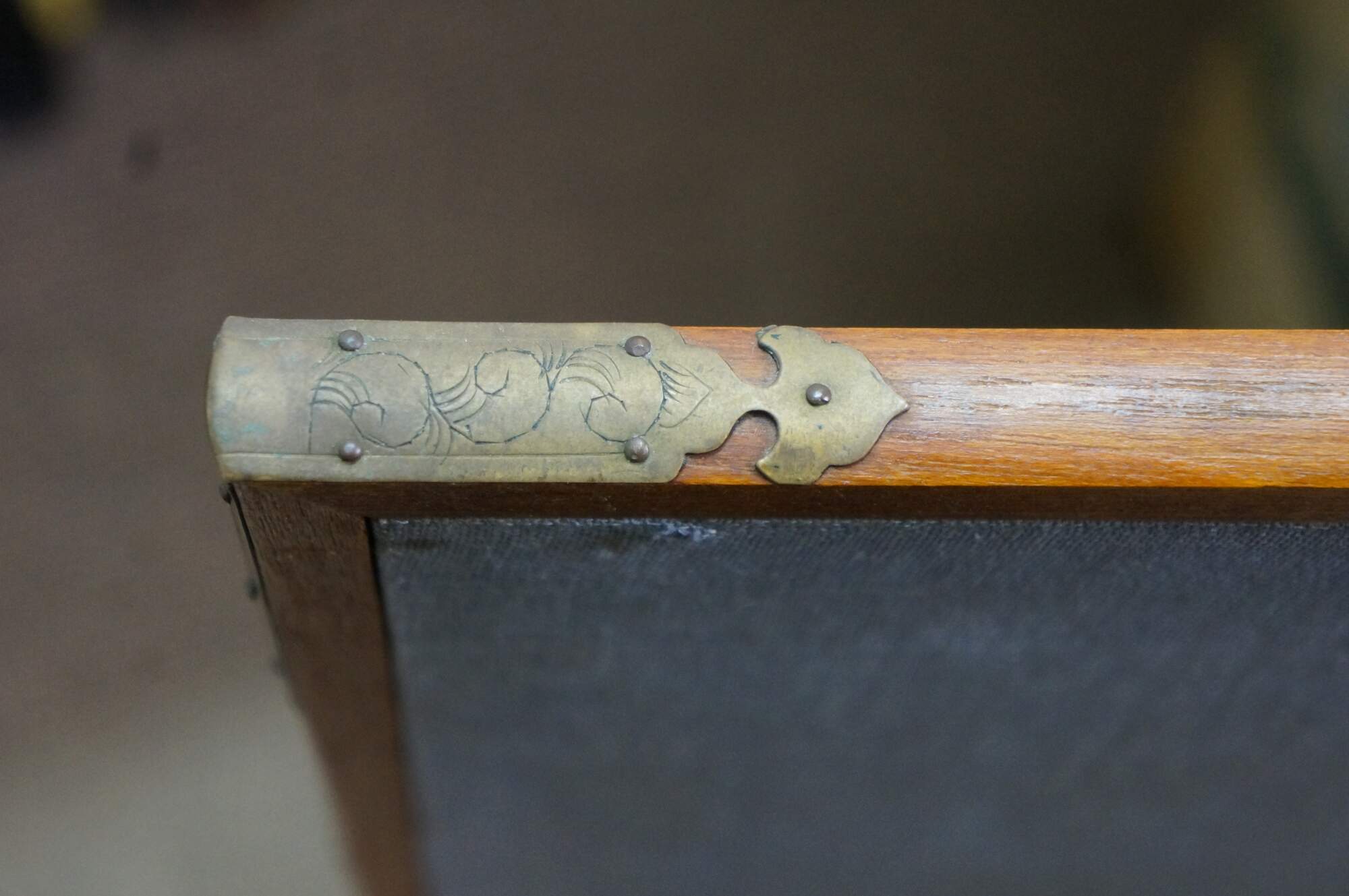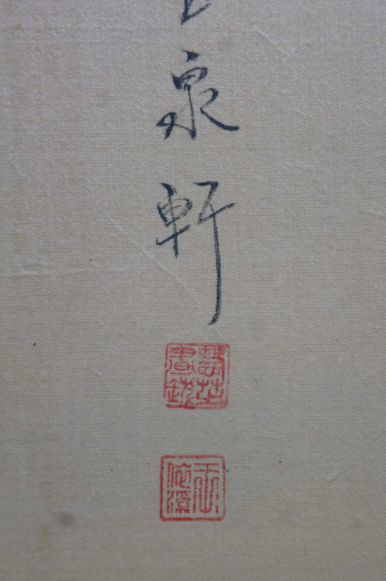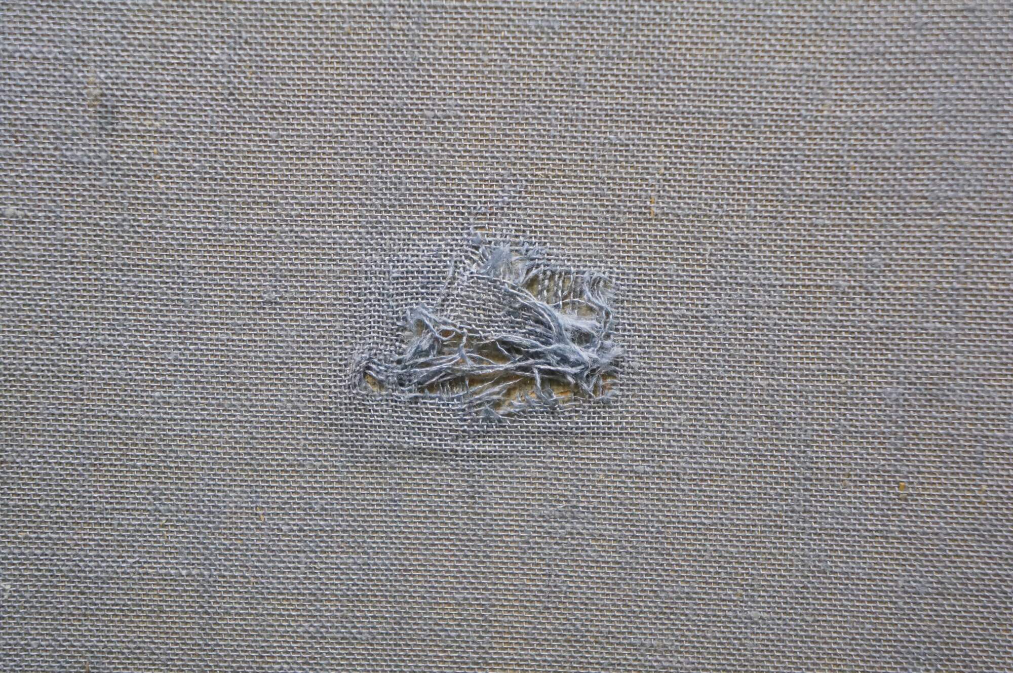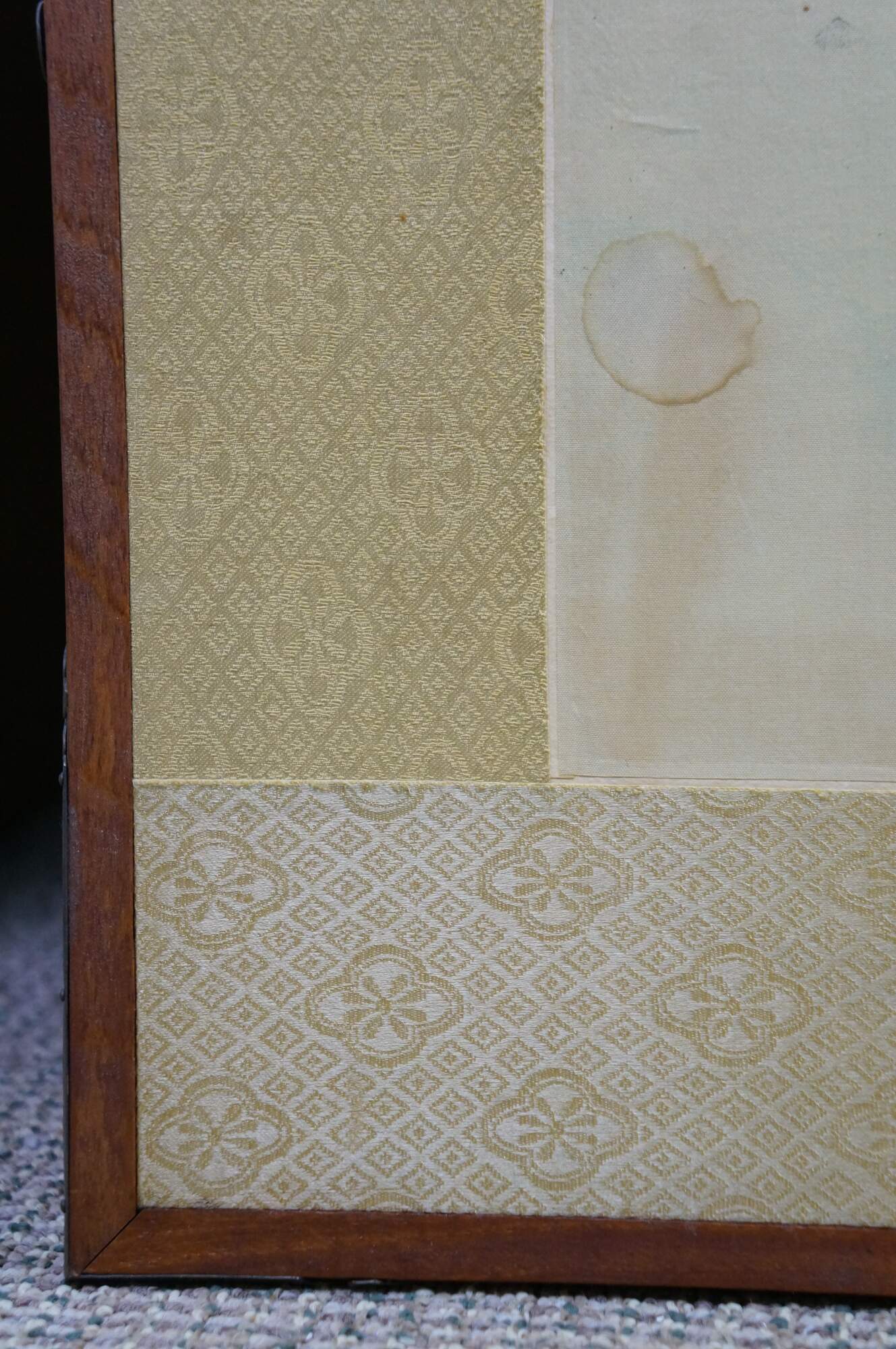 Good Overall; Stains, mostly to the mat but a few on the painting towards the lower side; Fading/staining/frayed spot to back