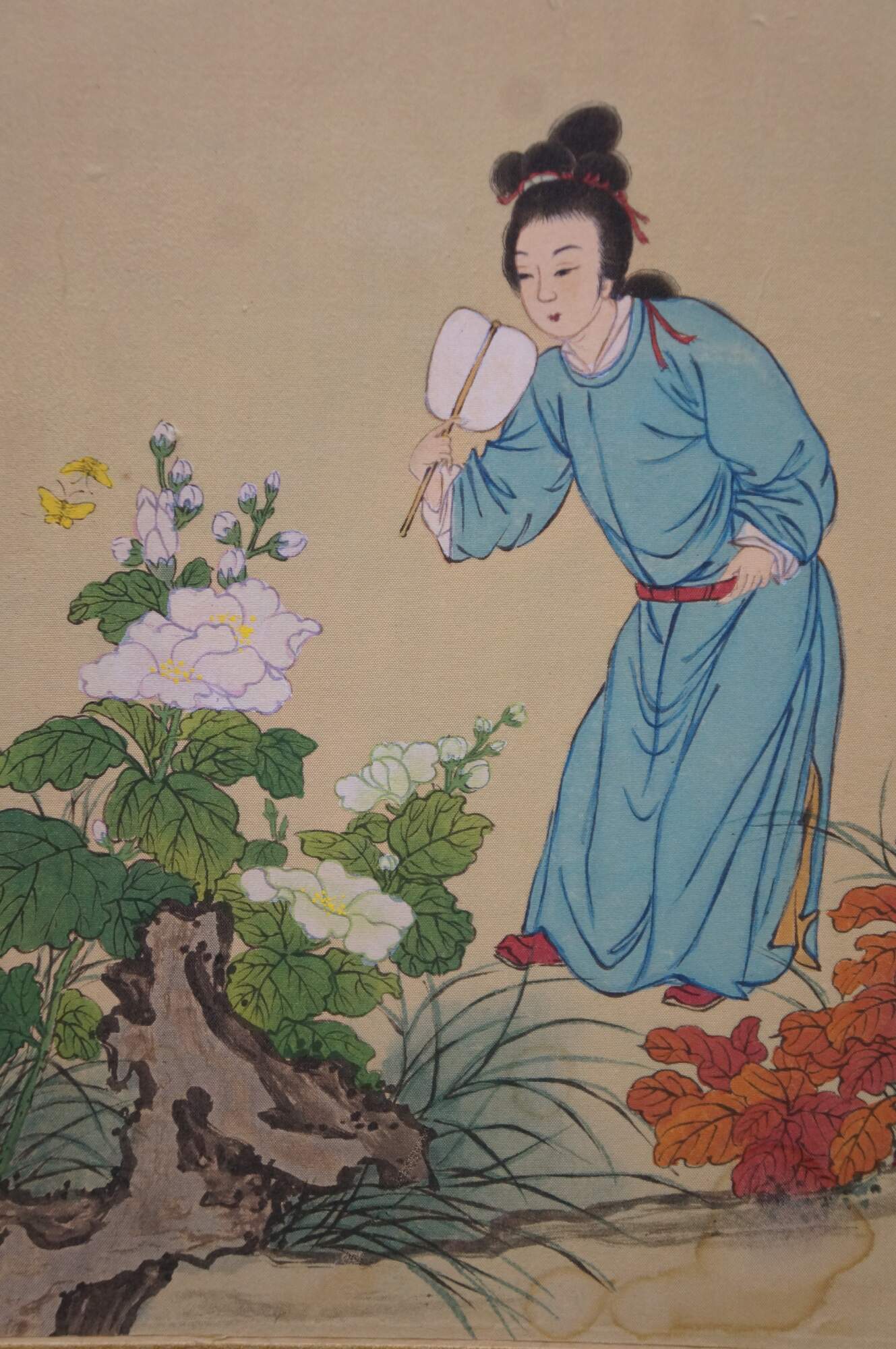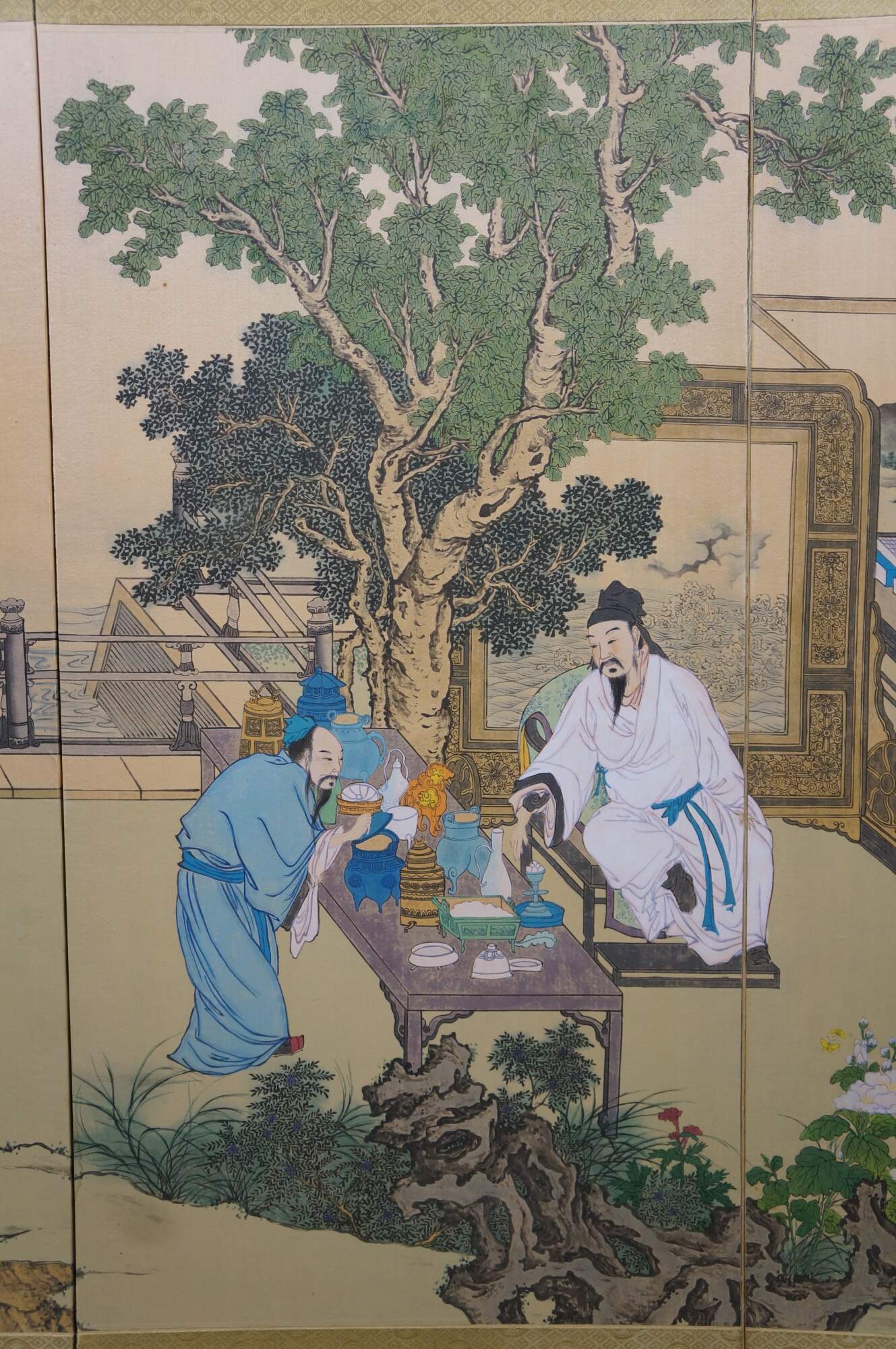 Mid 20th Century Chinese Hand Painted Silk Folding Screen. Titled Bógǔ tú which translates to pictures of antiquities. The screen depicts a gathering of scholars by the water. Antiquities and paintings can be seen displayed throughout in a natural landscape setting with foliage and flowers. The screen has brass brackets along the back for hanging.