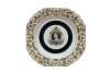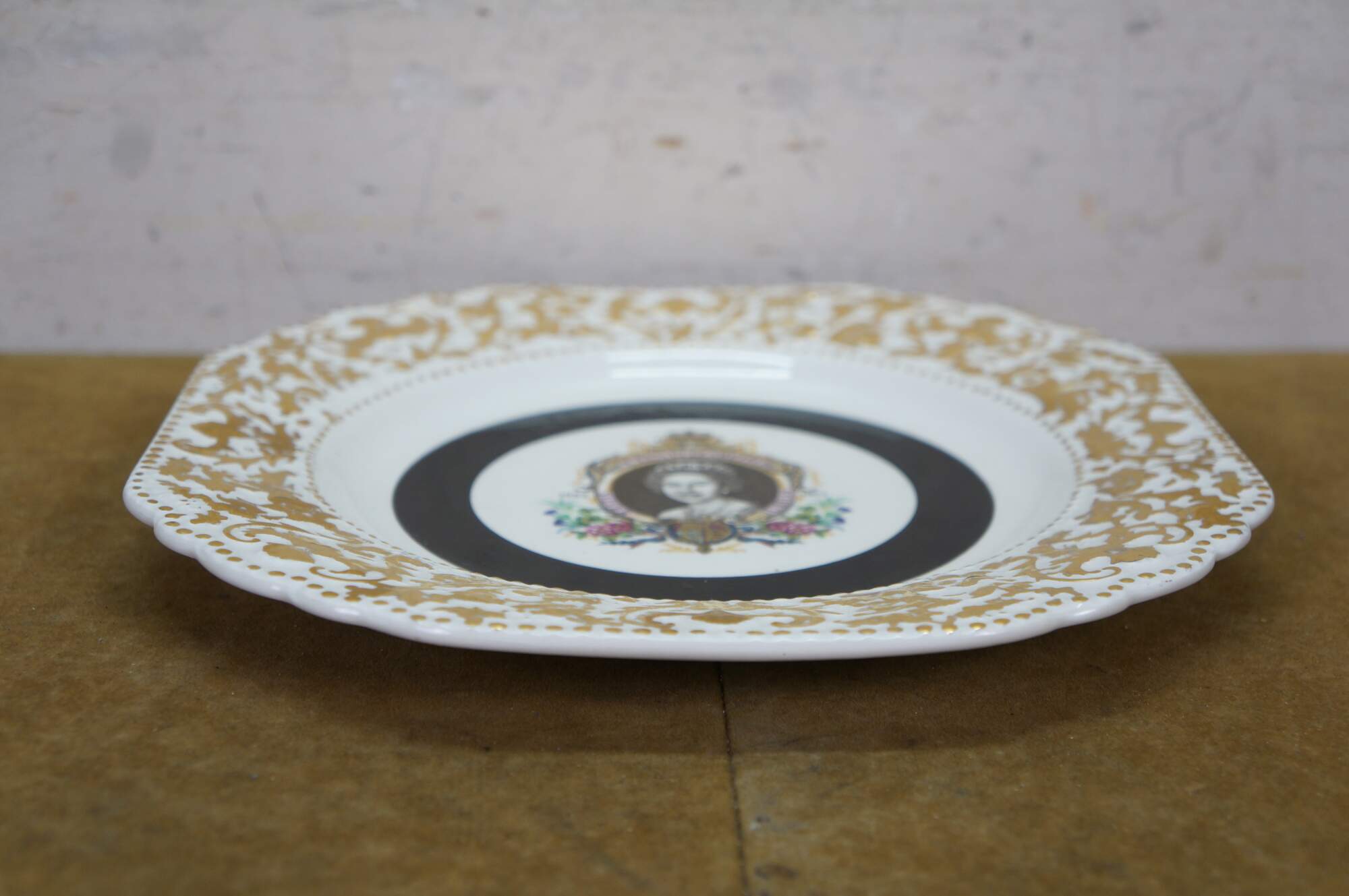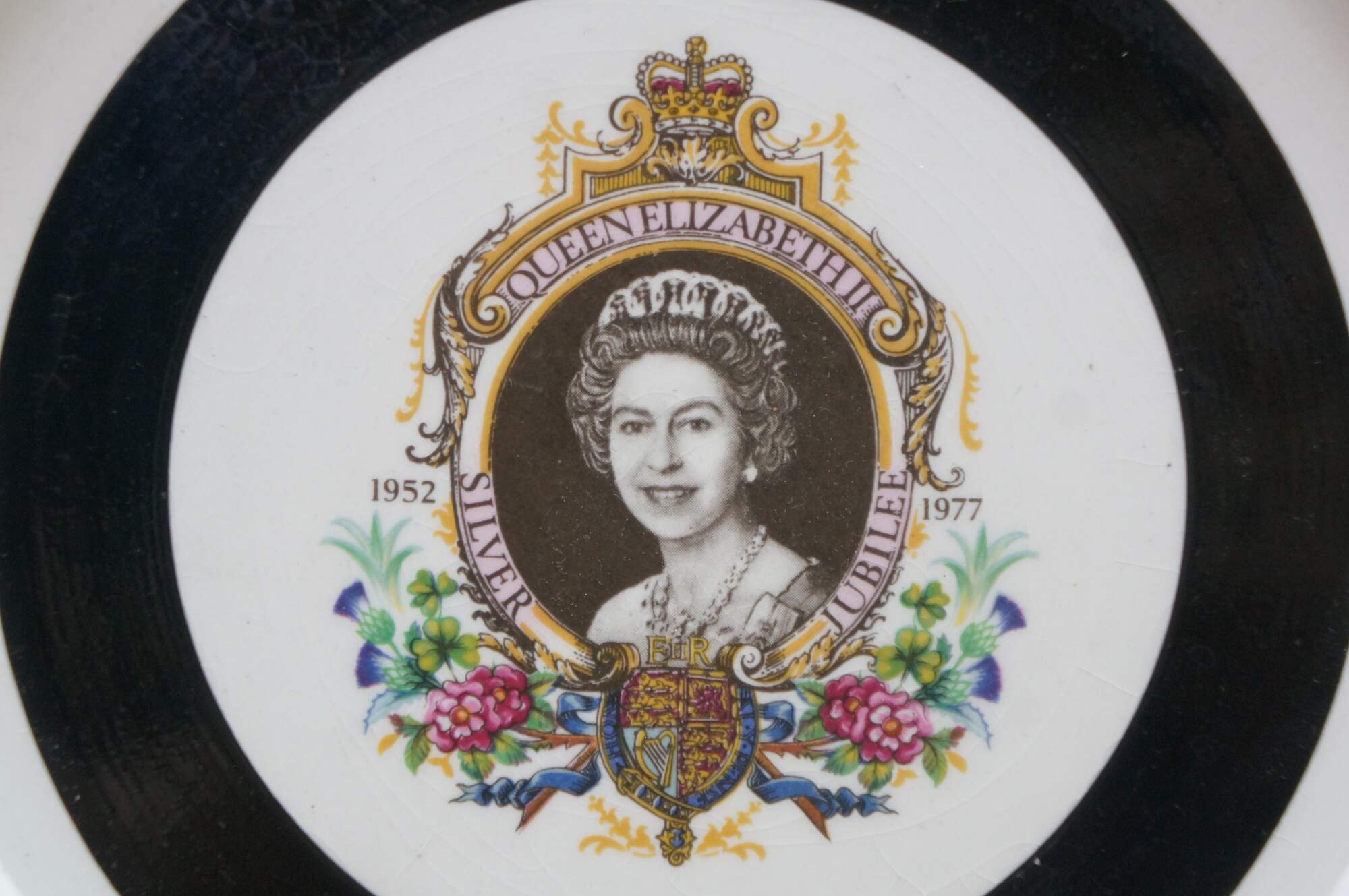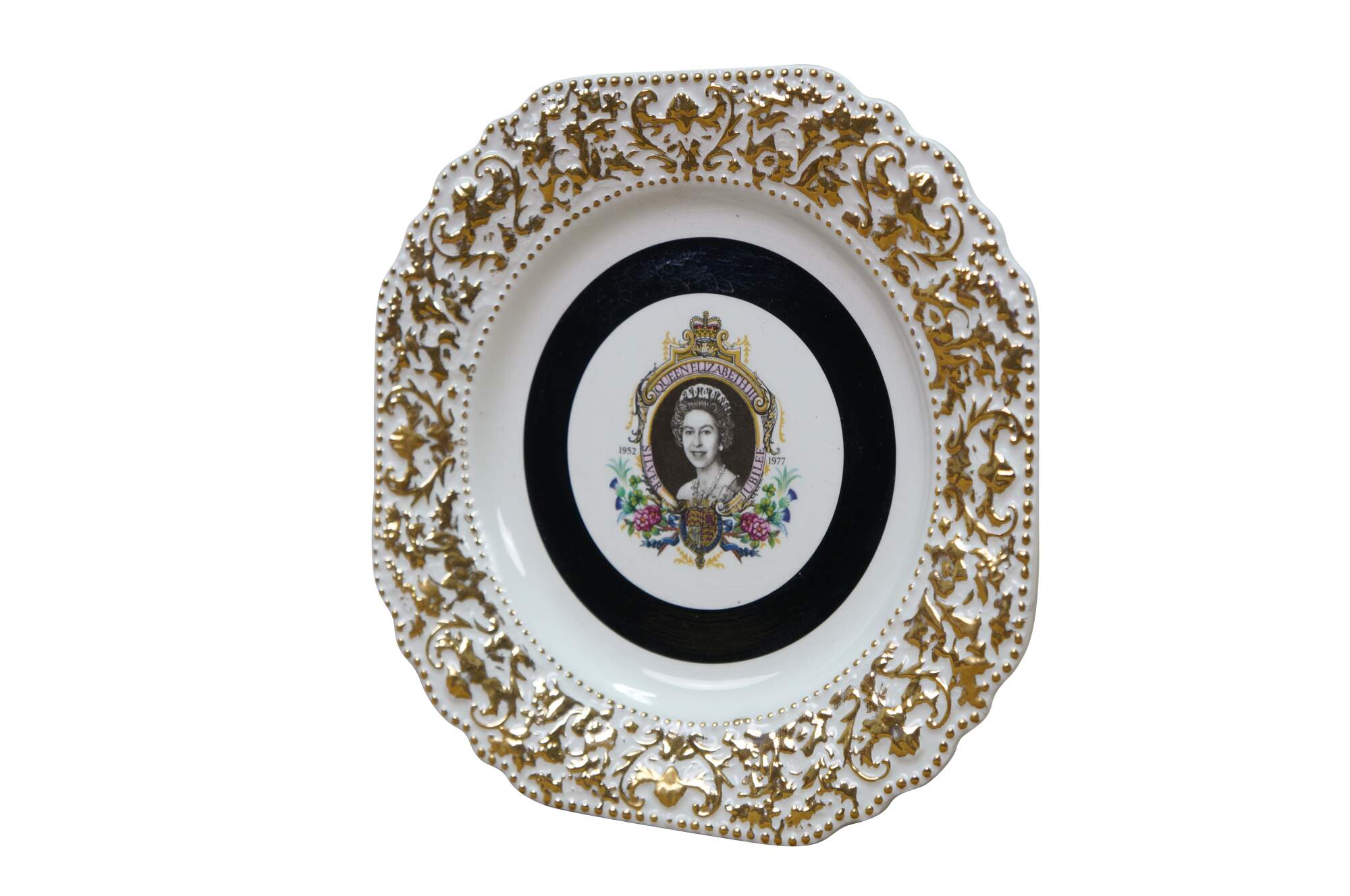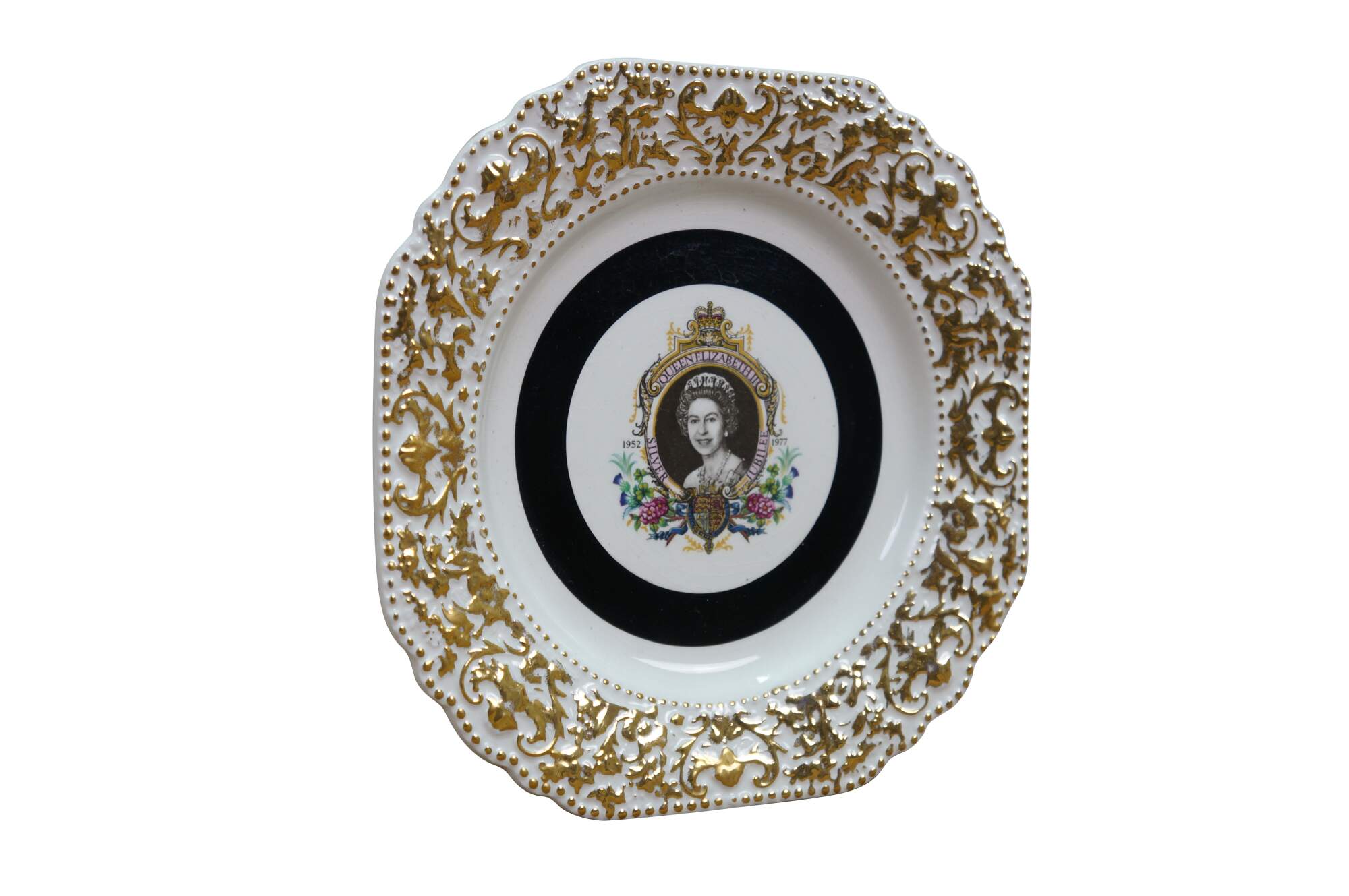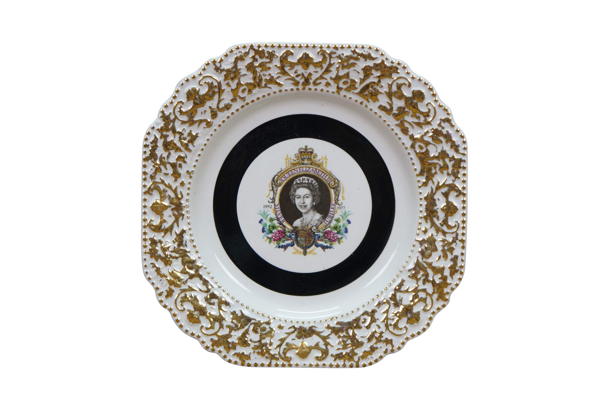1977 Queen Elizabeth II Silver Jubilee commemorative plate. Mady by Lord Nelson Pottery. It features a portrait of Queen Elizabeth II to celebrate her 25th anniversary on the throne (1952–1977). The plate is decorated with a black center band and intricate gold-colored ornamentation around the rim.