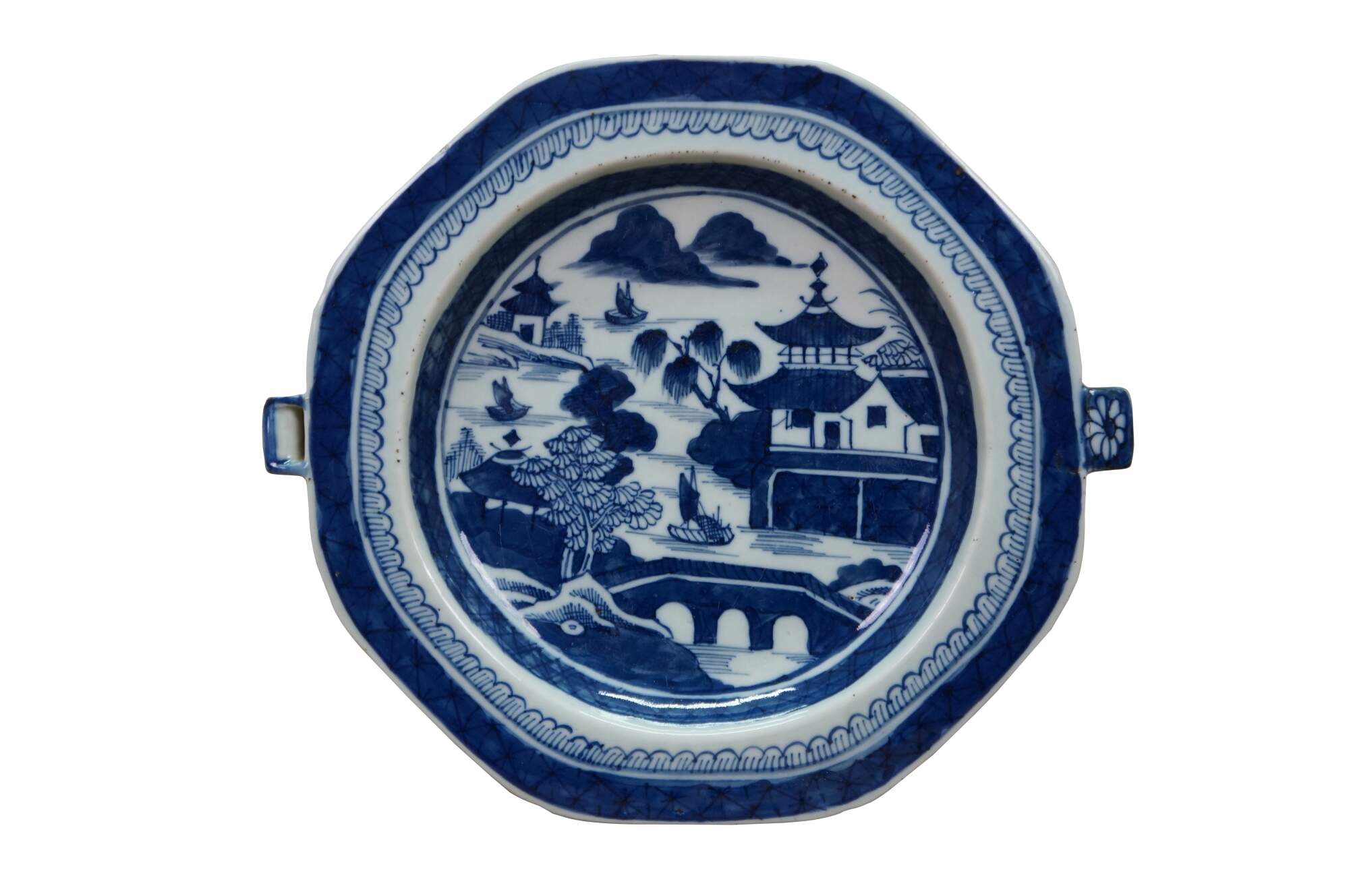 Intriguing set of three antique 19th Century chinese export Canton servings dishes. Made from porcelain with traditional blue and white landscape design. Includes one oval platter, a round inset dish and an octagonal platter with handles along the side. Each is beautifully designed with chinoiserie pagoda landscapes. Perfect for display or serving.