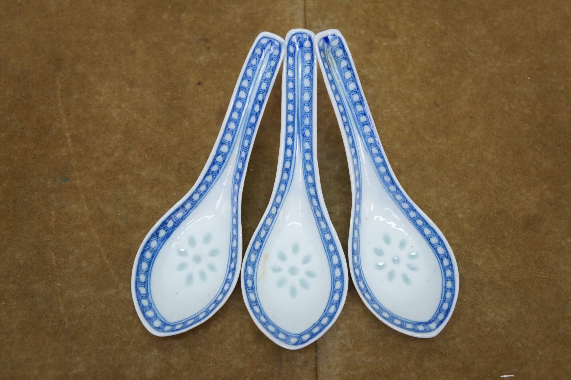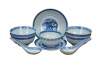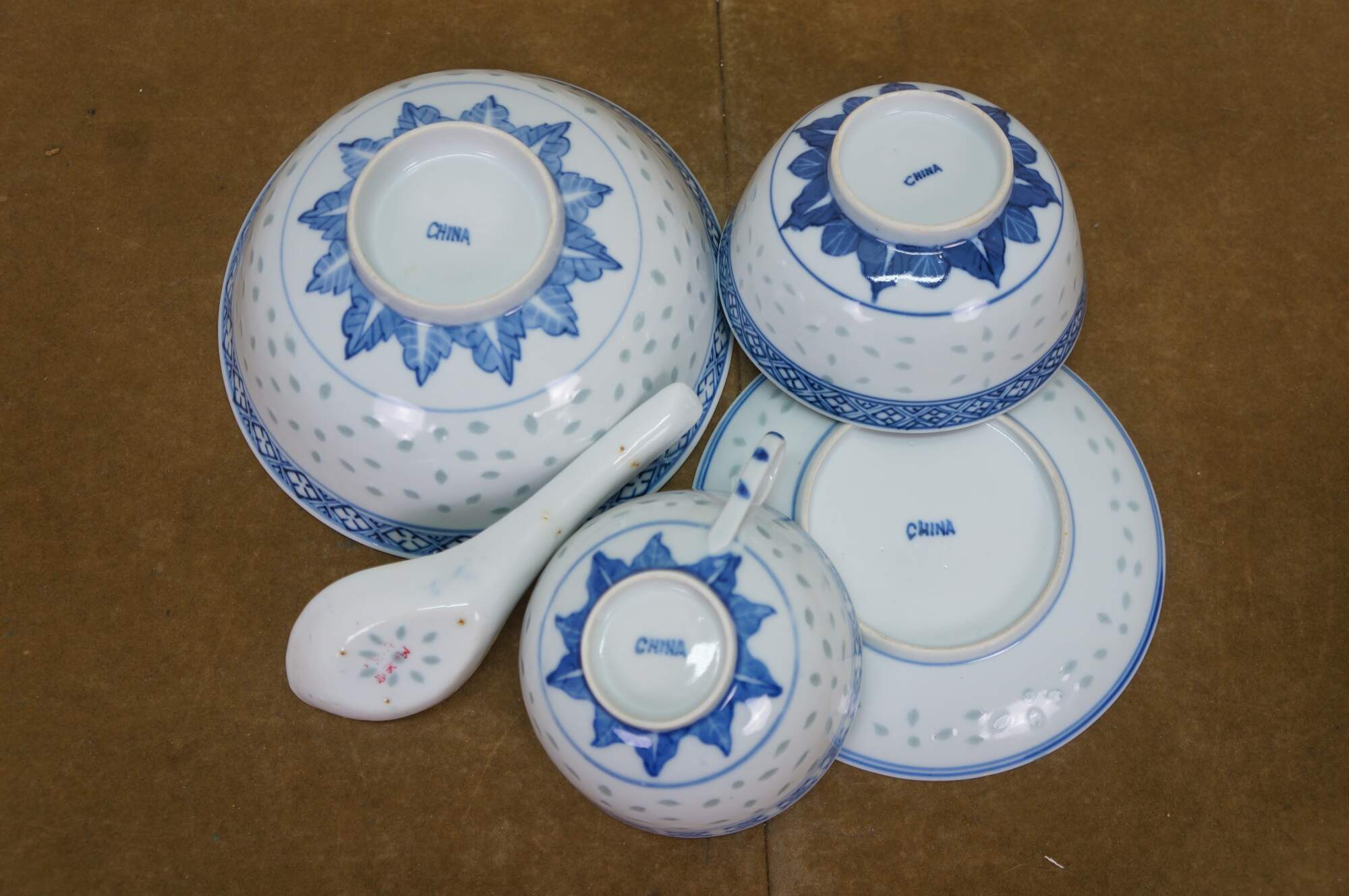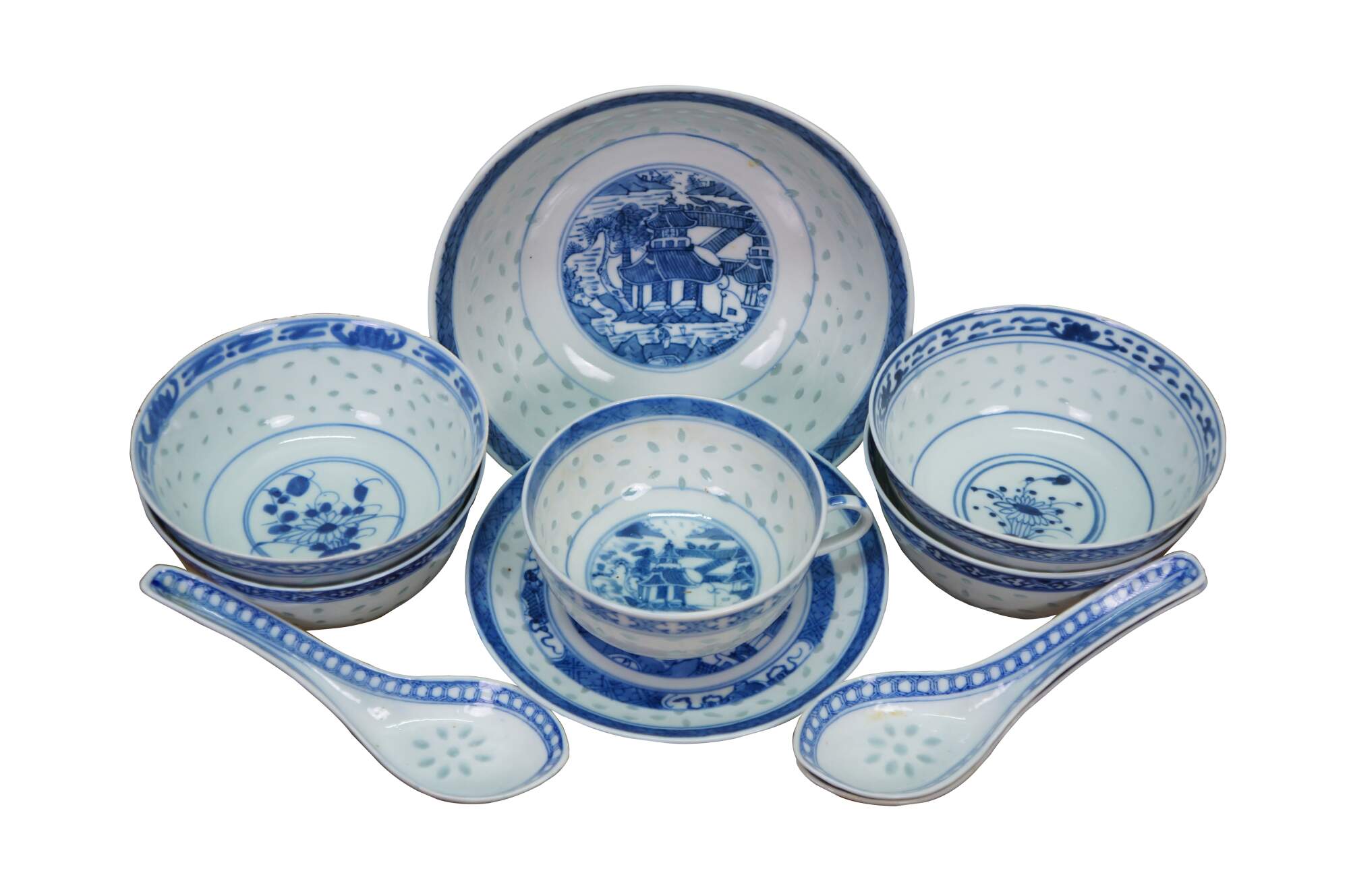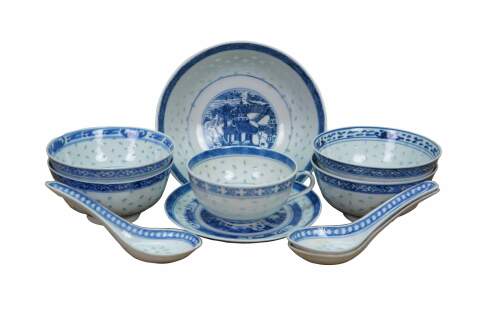 Chinese porcelain dishes feature a traditional blue and white design with a "rice grain" or "rice eye" translucent pattern. The set includes bowls, saucers, a teacup, and spoons, commonly produced in Jingdezhen, China.