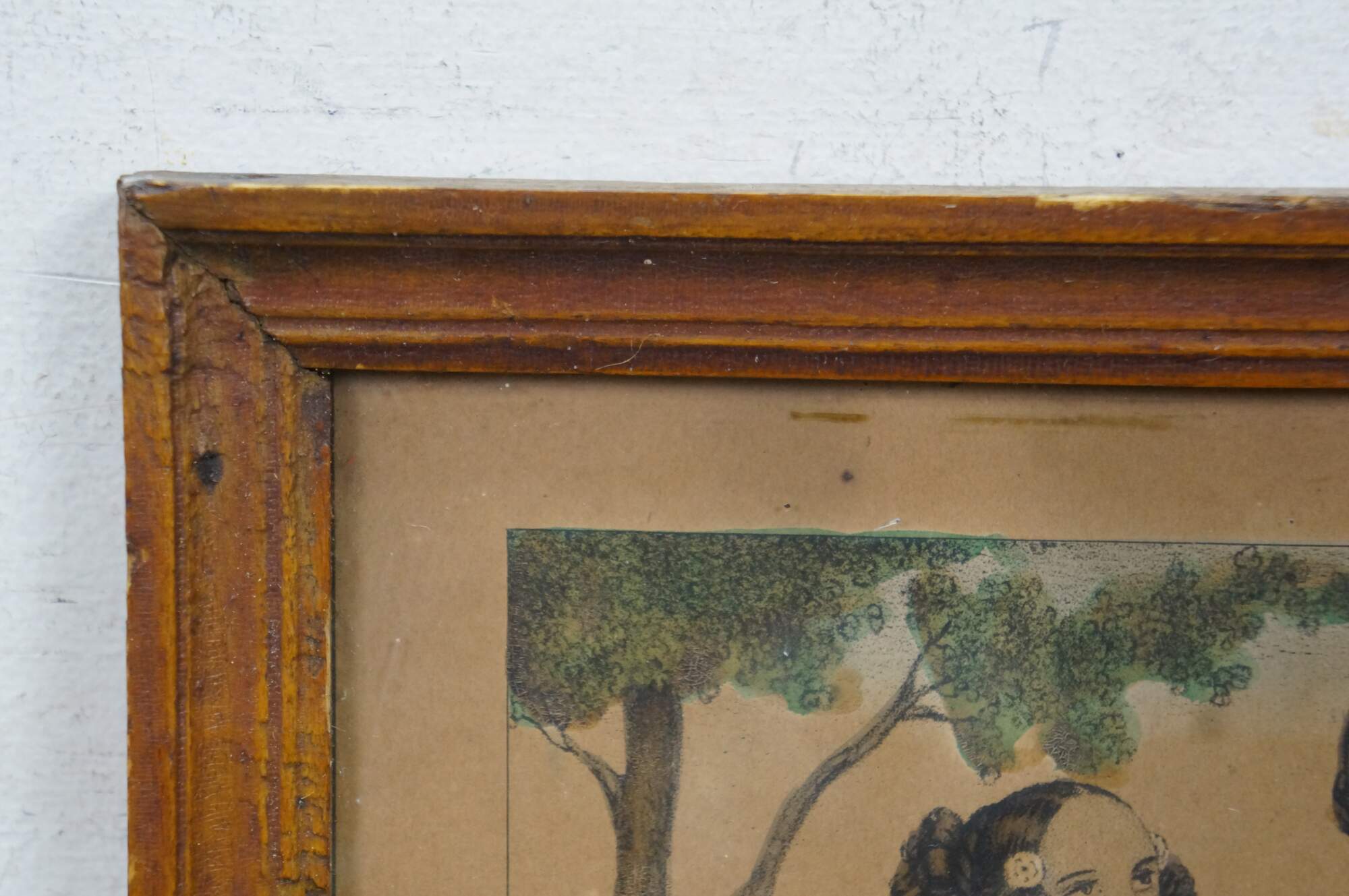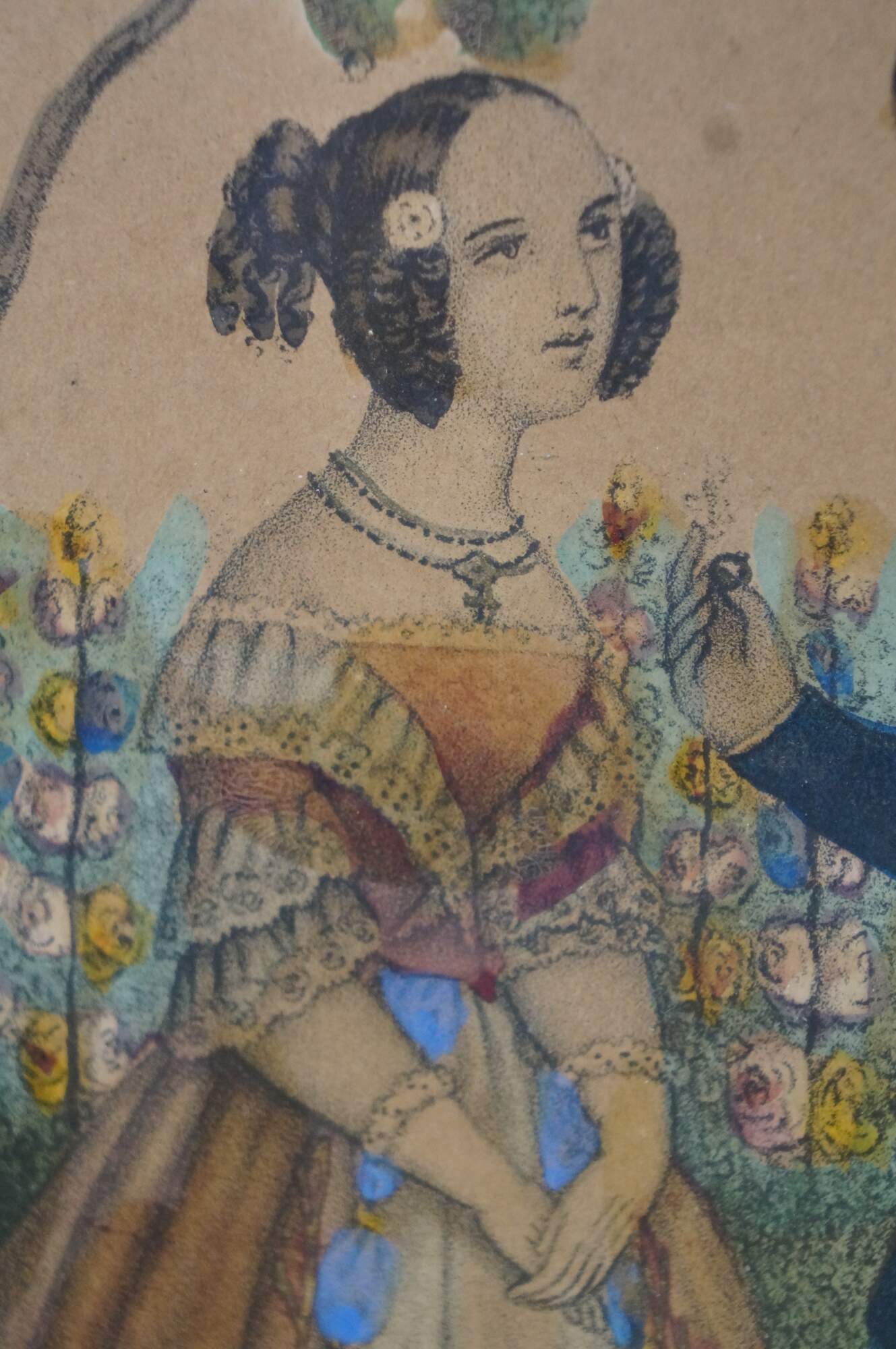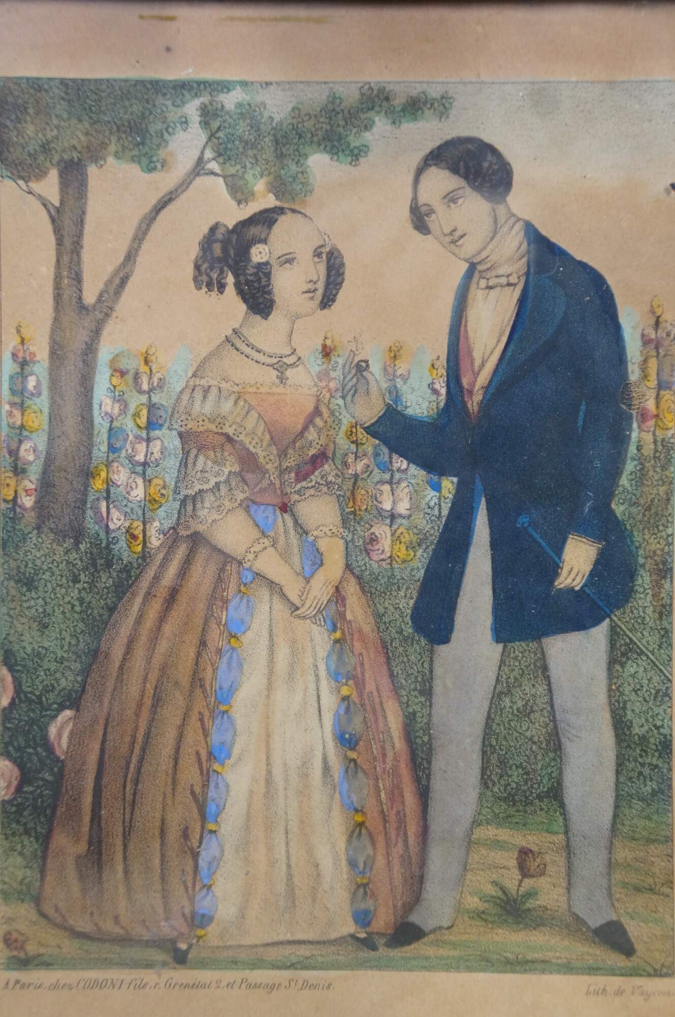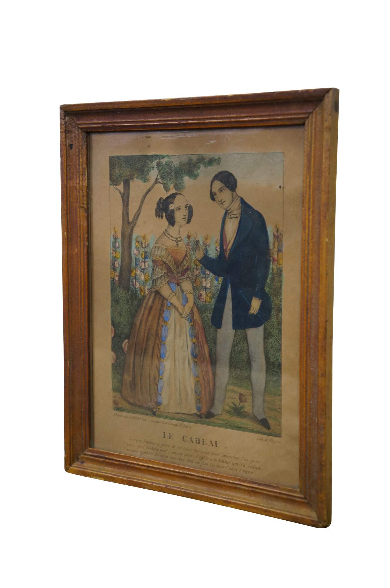Mid 19th Century Hand Colored Lithograph. Titled Le Cadeau which translated to gift. The artwork shows a well dressed couple in a park surrounded by flowers. The man is proposing to the woman and presenting a ring in his right hand. This lithograph comes from a prominent printing house Led by François-Benjamin Vayron.