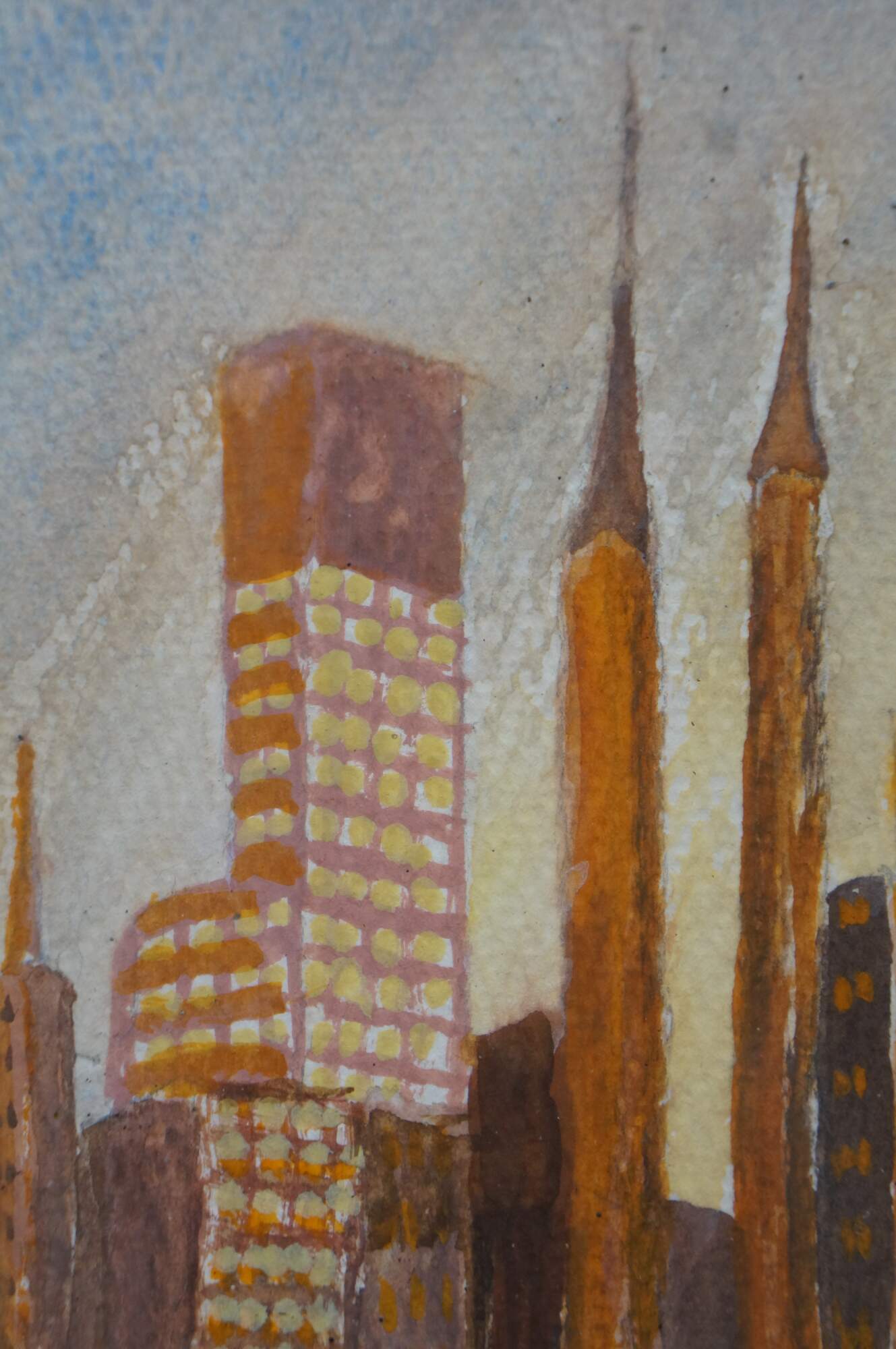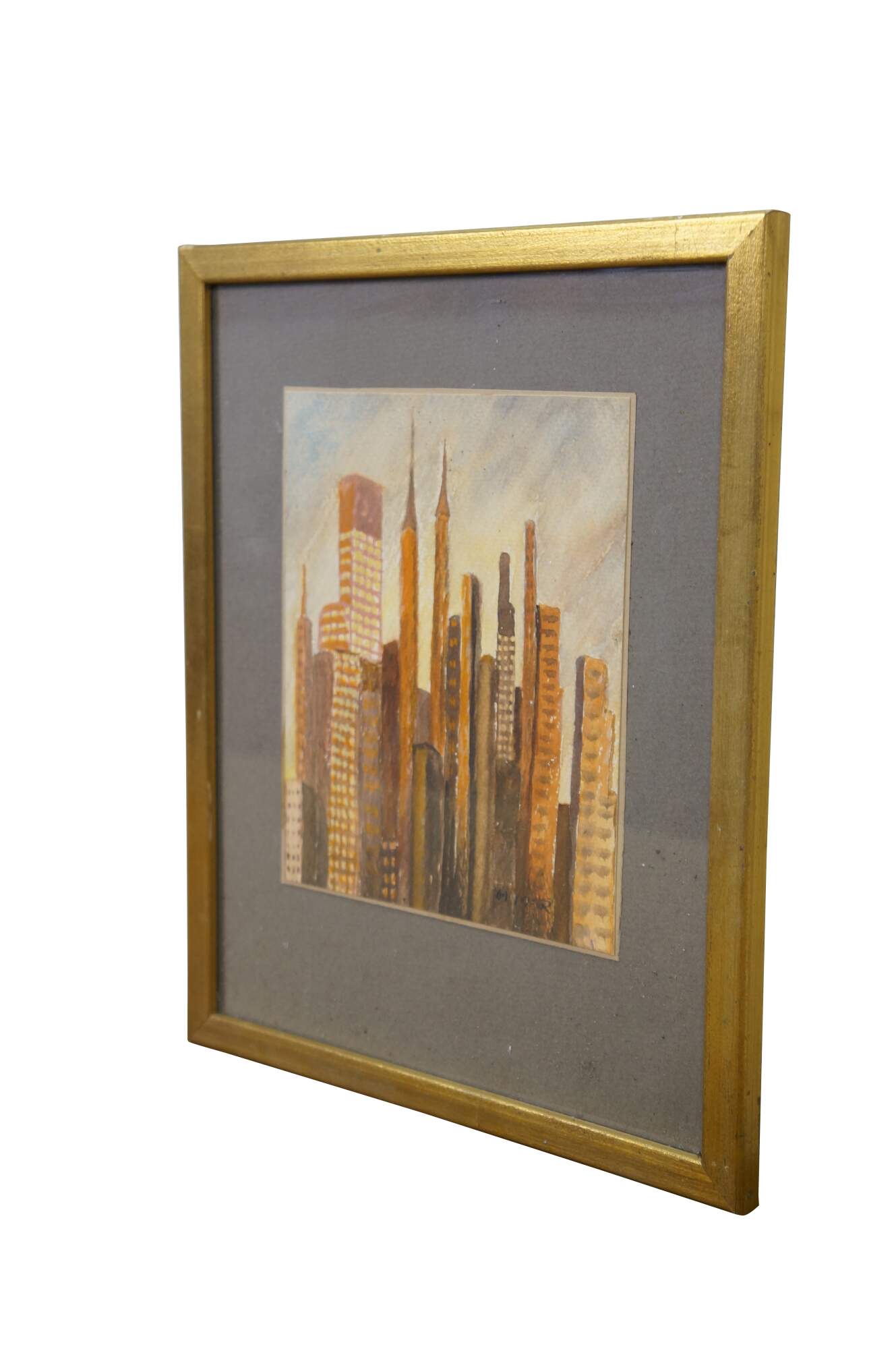 Mid Century Cityscape Watercolor Paintings by Helen J. McRae of New York. Helen had masters in Fine Art. The watercolor depicts the New York City Skyline. Signed Lower right and framed under glass.