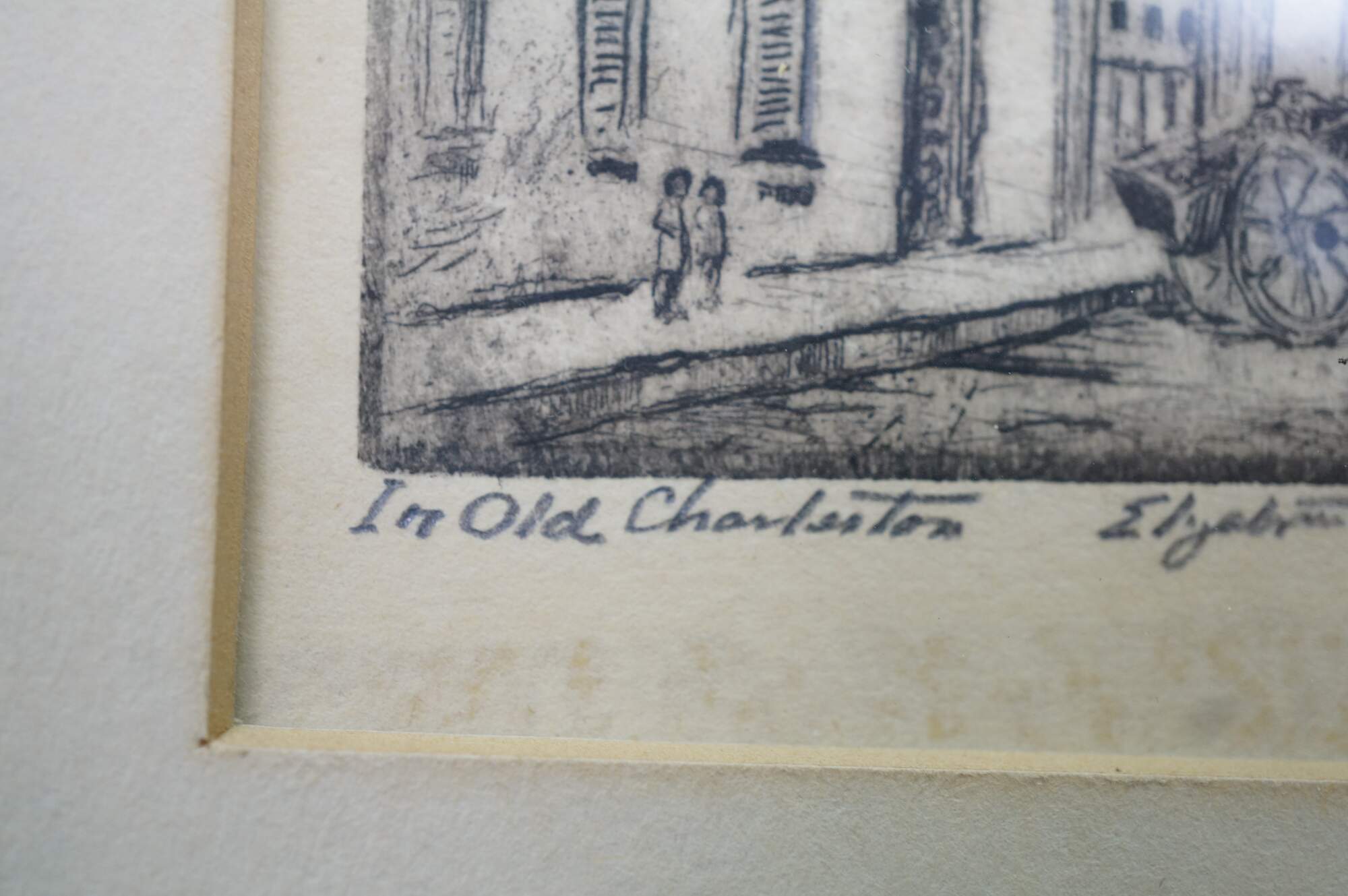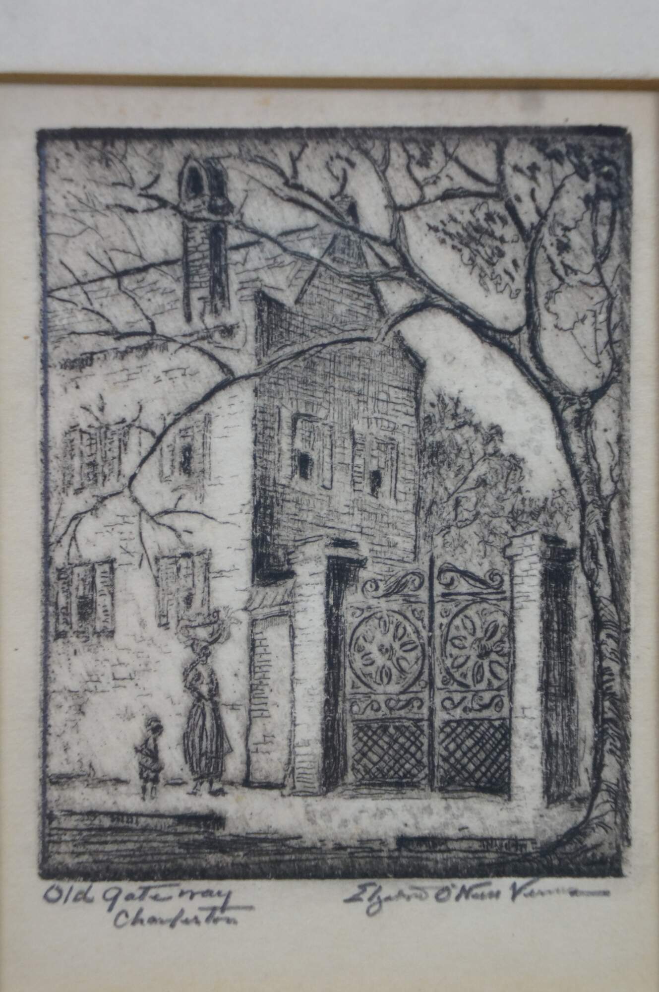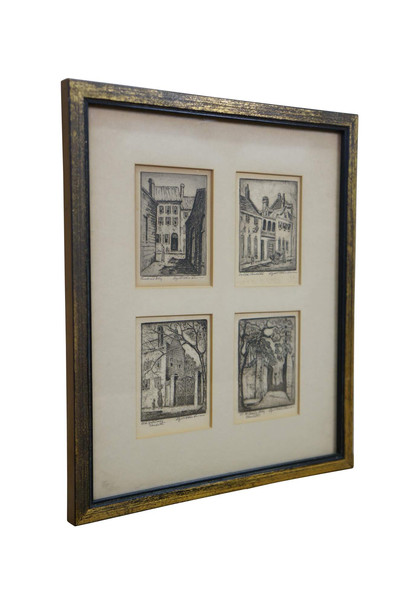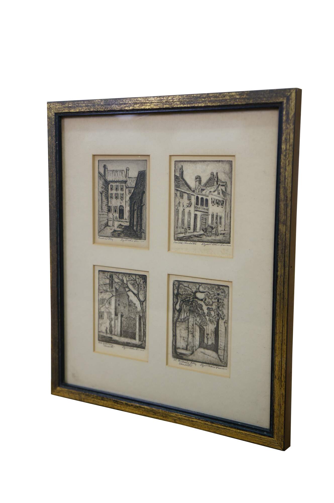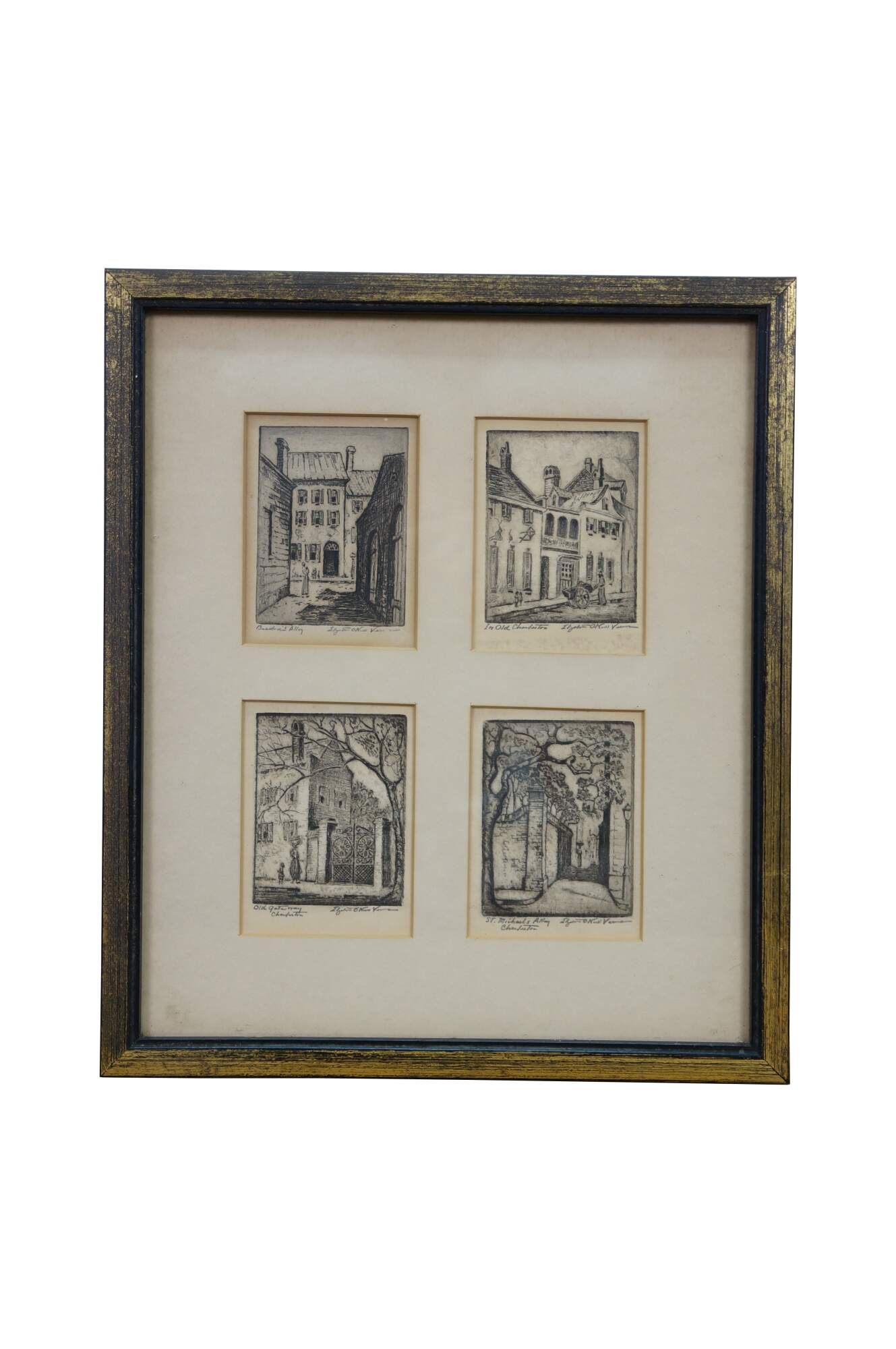 4 Rare Antique Elizabeth O'Neill Verner Miniature Etchings. Features St. Michaels Alley, Old Gateway, In Old Charleston and Beadons Alley. Each etching is hand signed and preserved under glass.