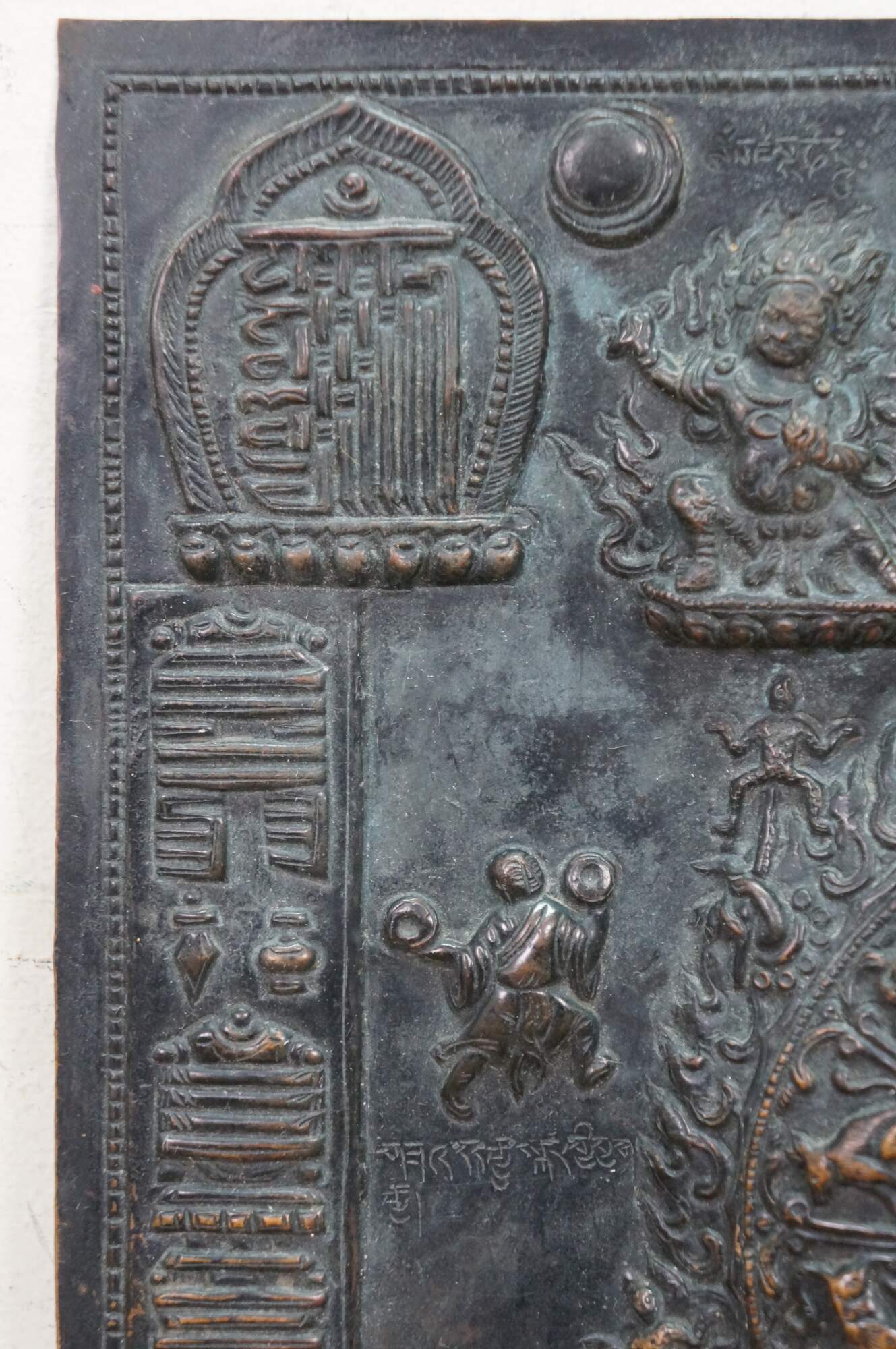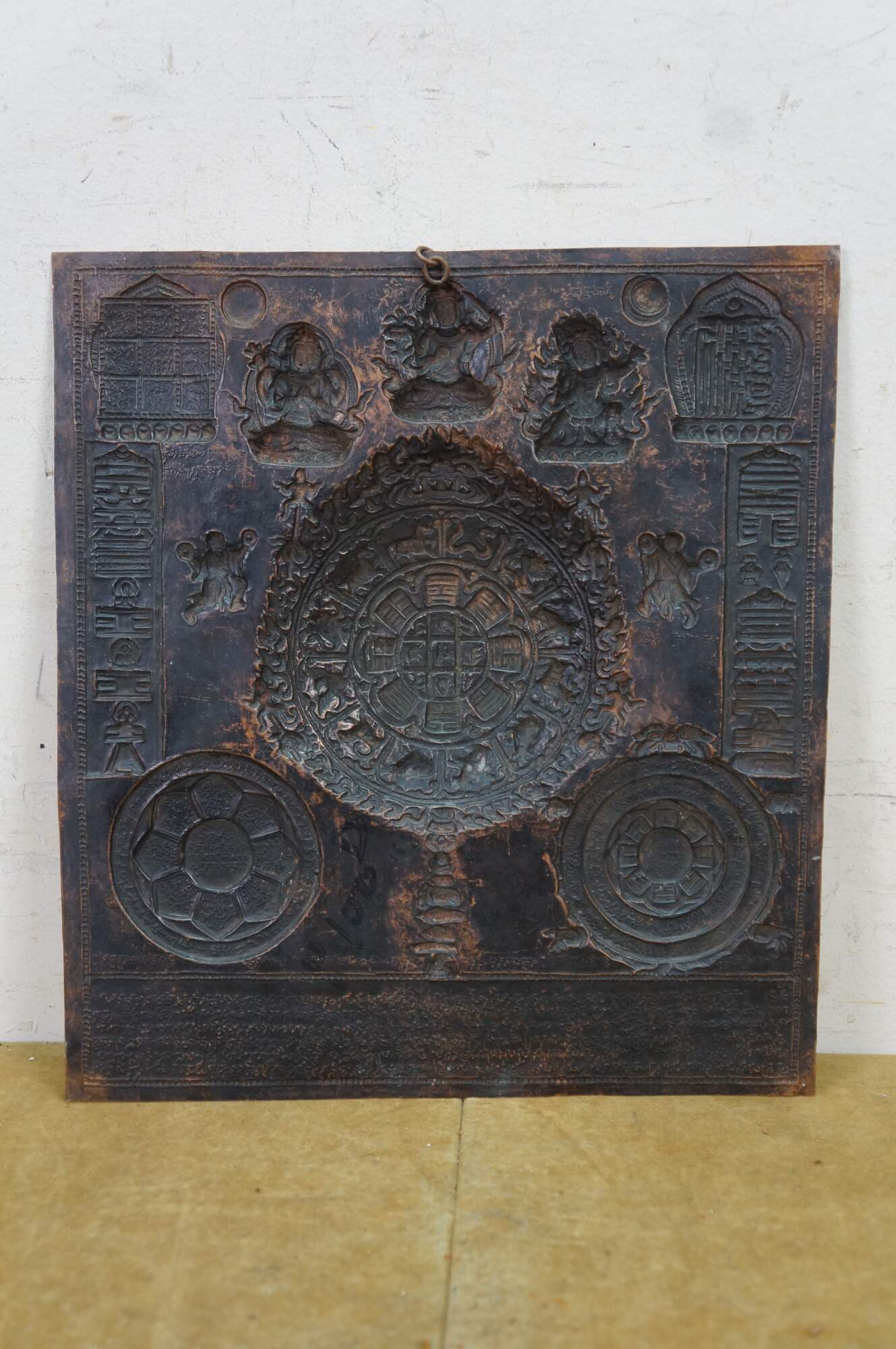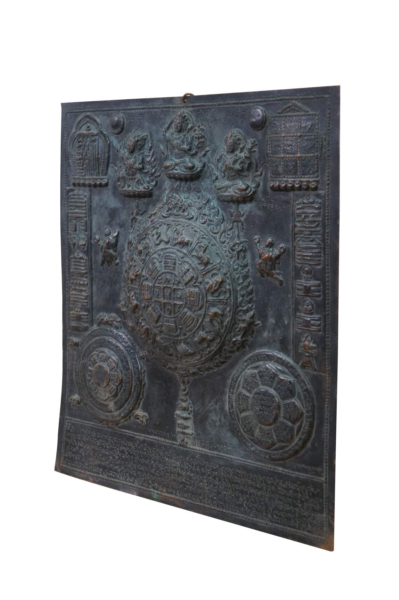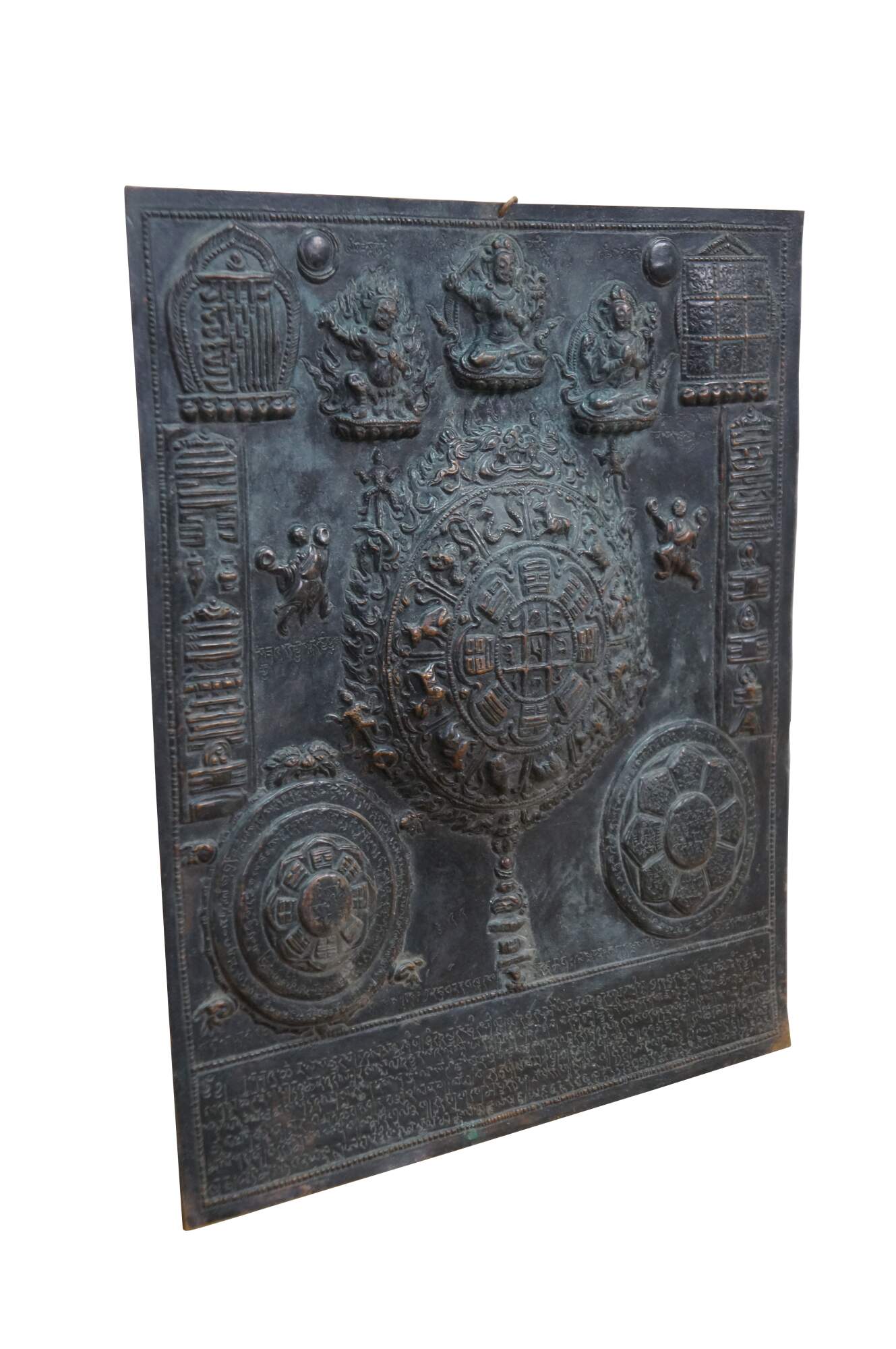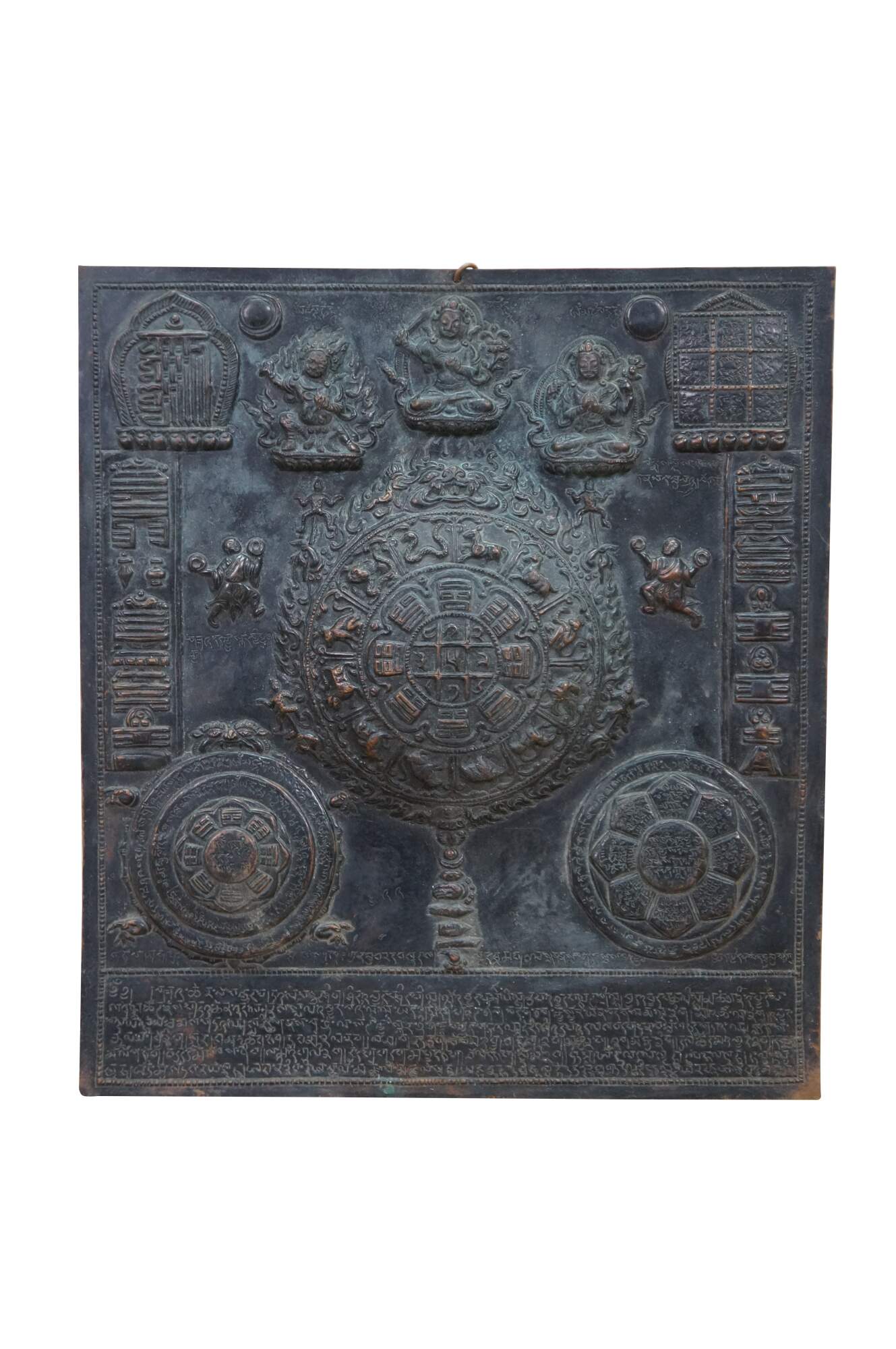 This metal plaque is a Tibetan astrological calendar, often referred to as a Srid-pa-ho or Tibetan Zodiac Mandala. Made from embossed or hammered copper using the repousse technique.