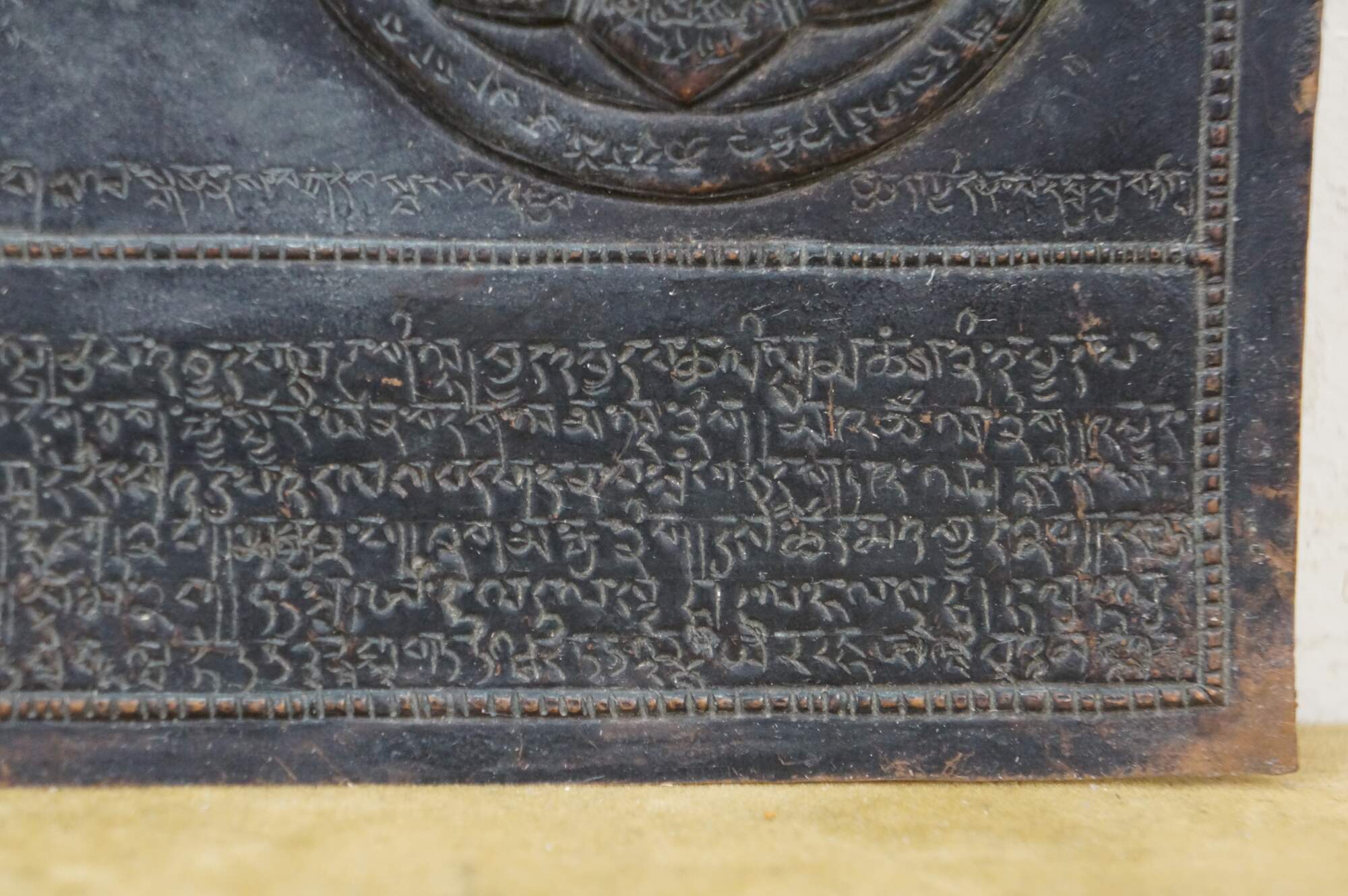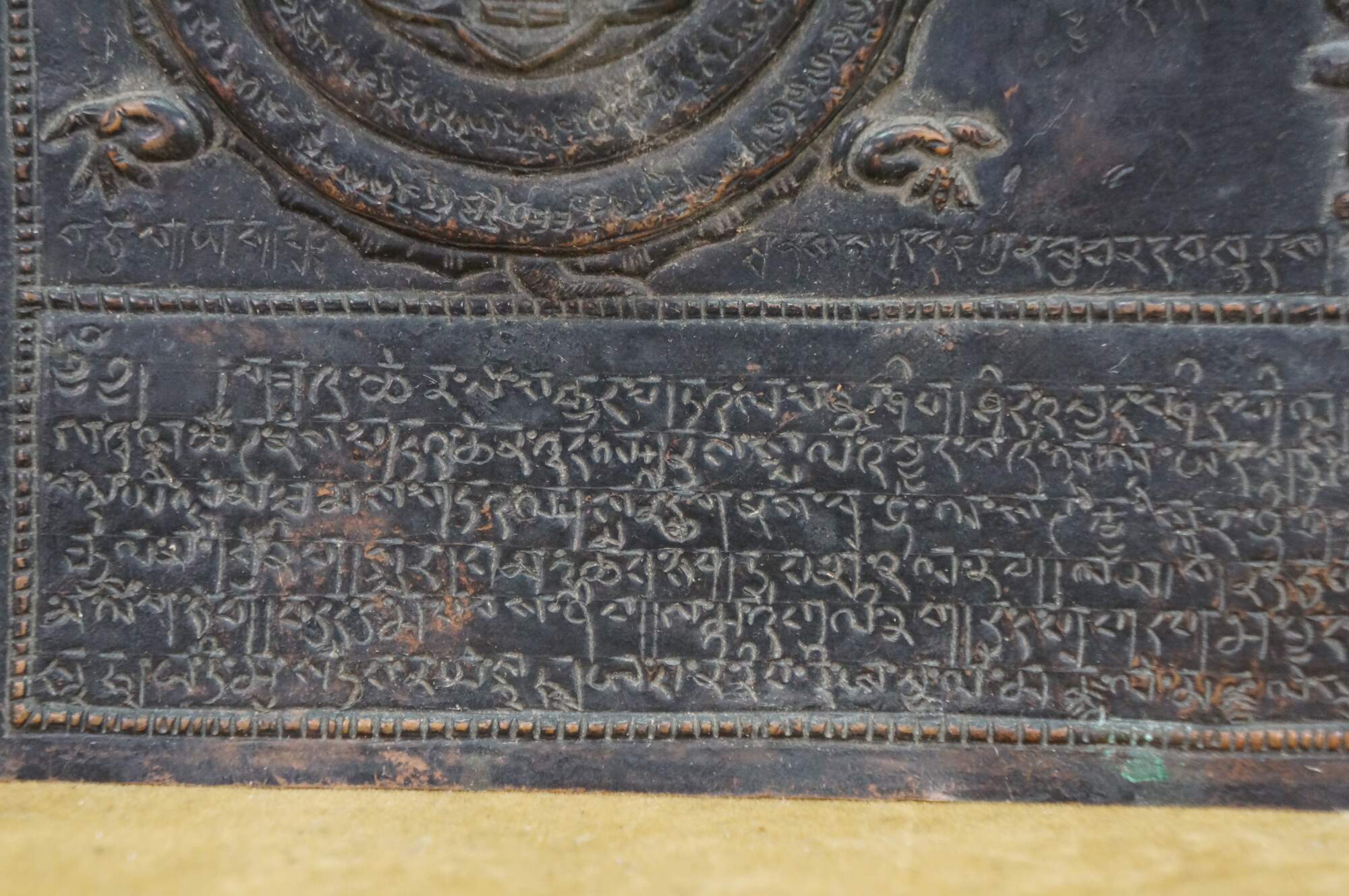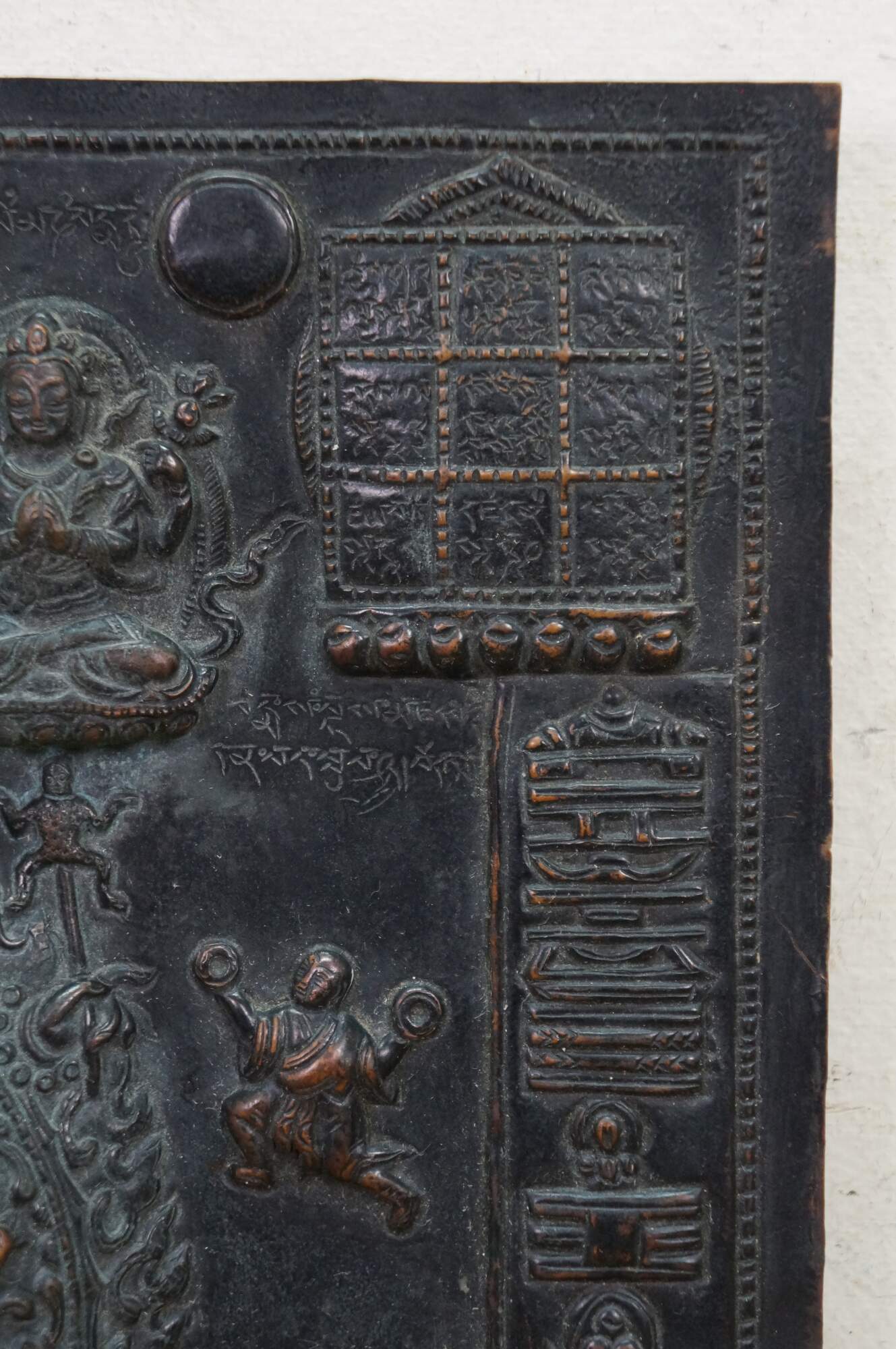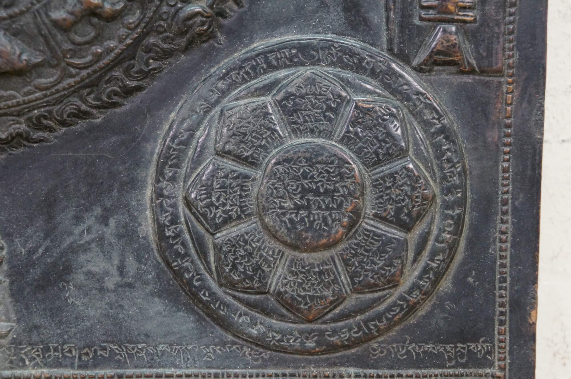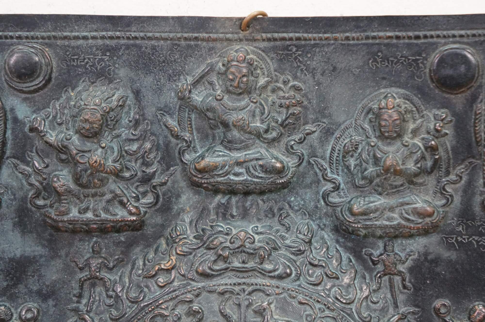 This metal plaque is a Tibetan astrological calendar, often referred to as a Srid-pa-ho or Tibetan Zodiac Mandala. Made from embossed or hammered copper using the repousse technique.