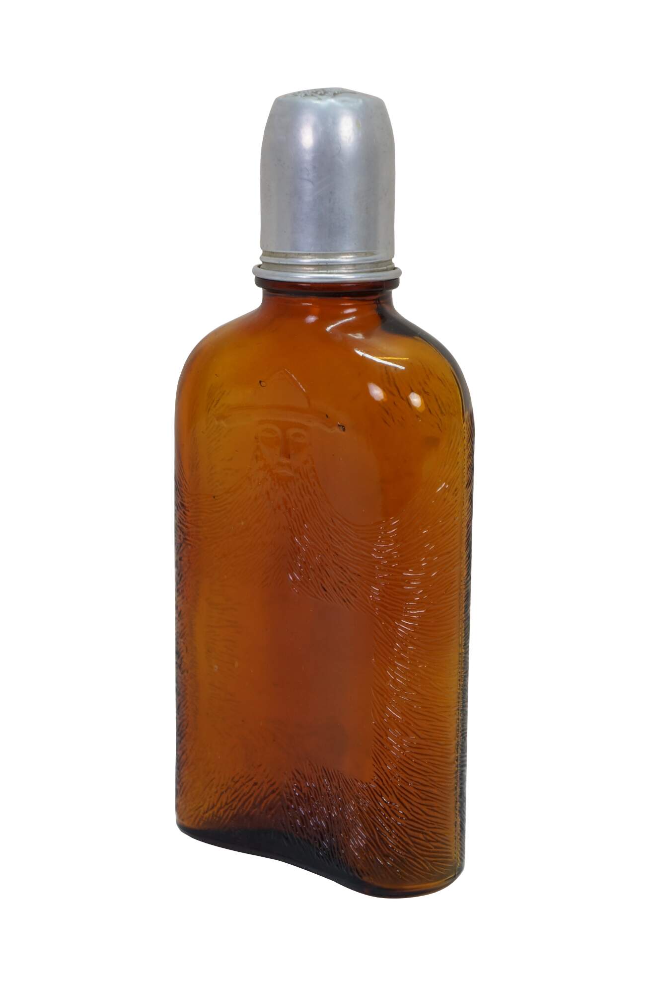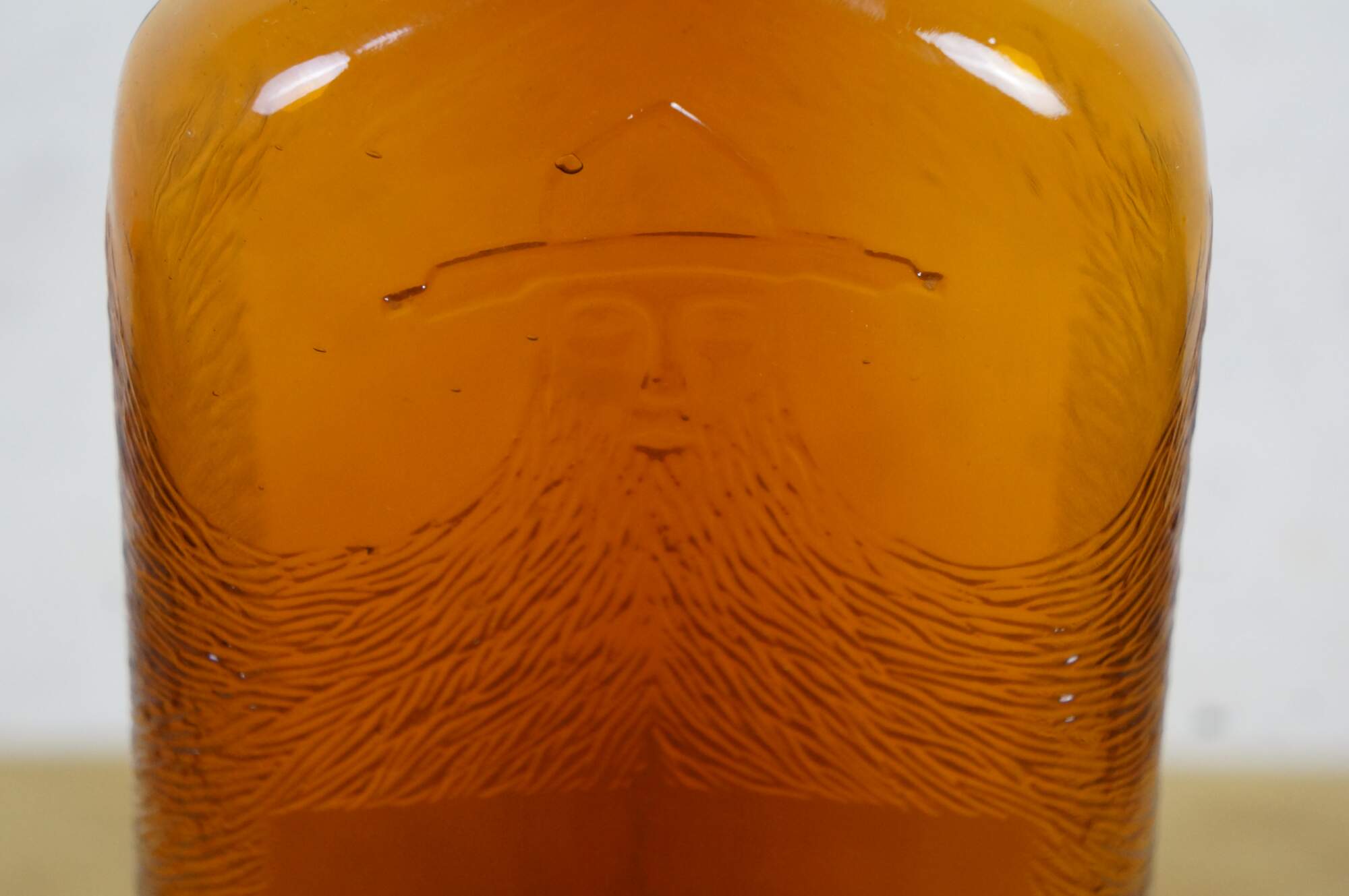 Antique Gooderham & Worts Canadian whiskey amber glass bottle, often referred to as the Bearded Man bottle. It features a distinctive embossed image of a man wearing a hat with a very large, prominent beard.