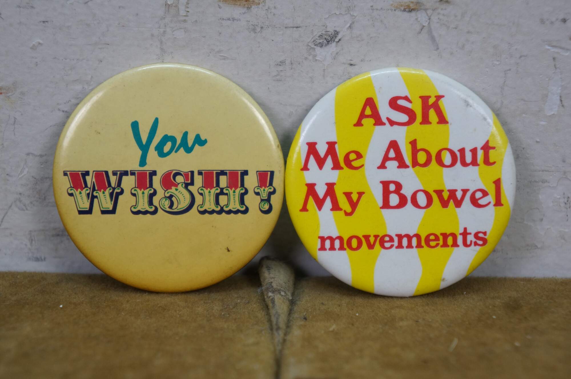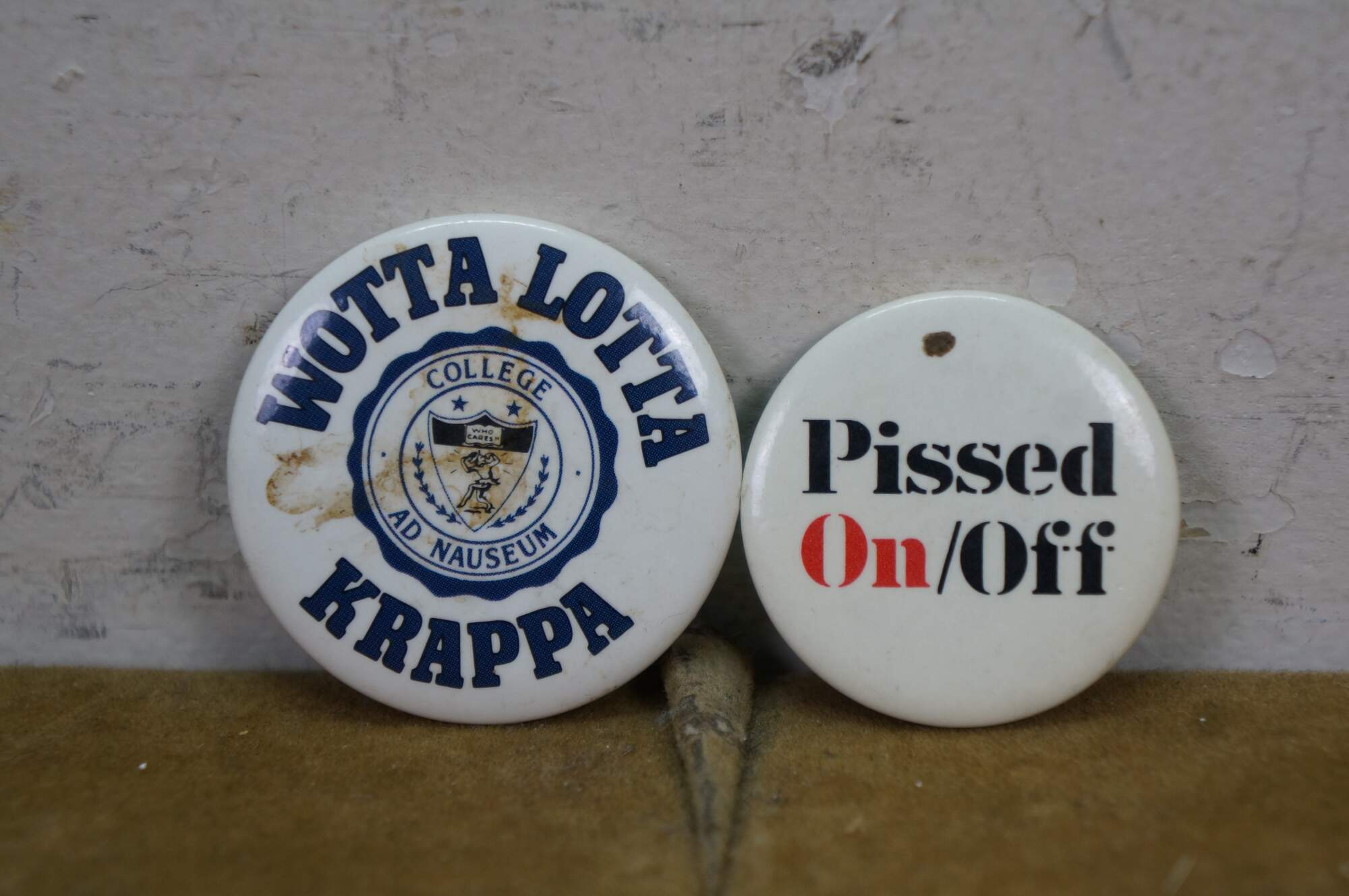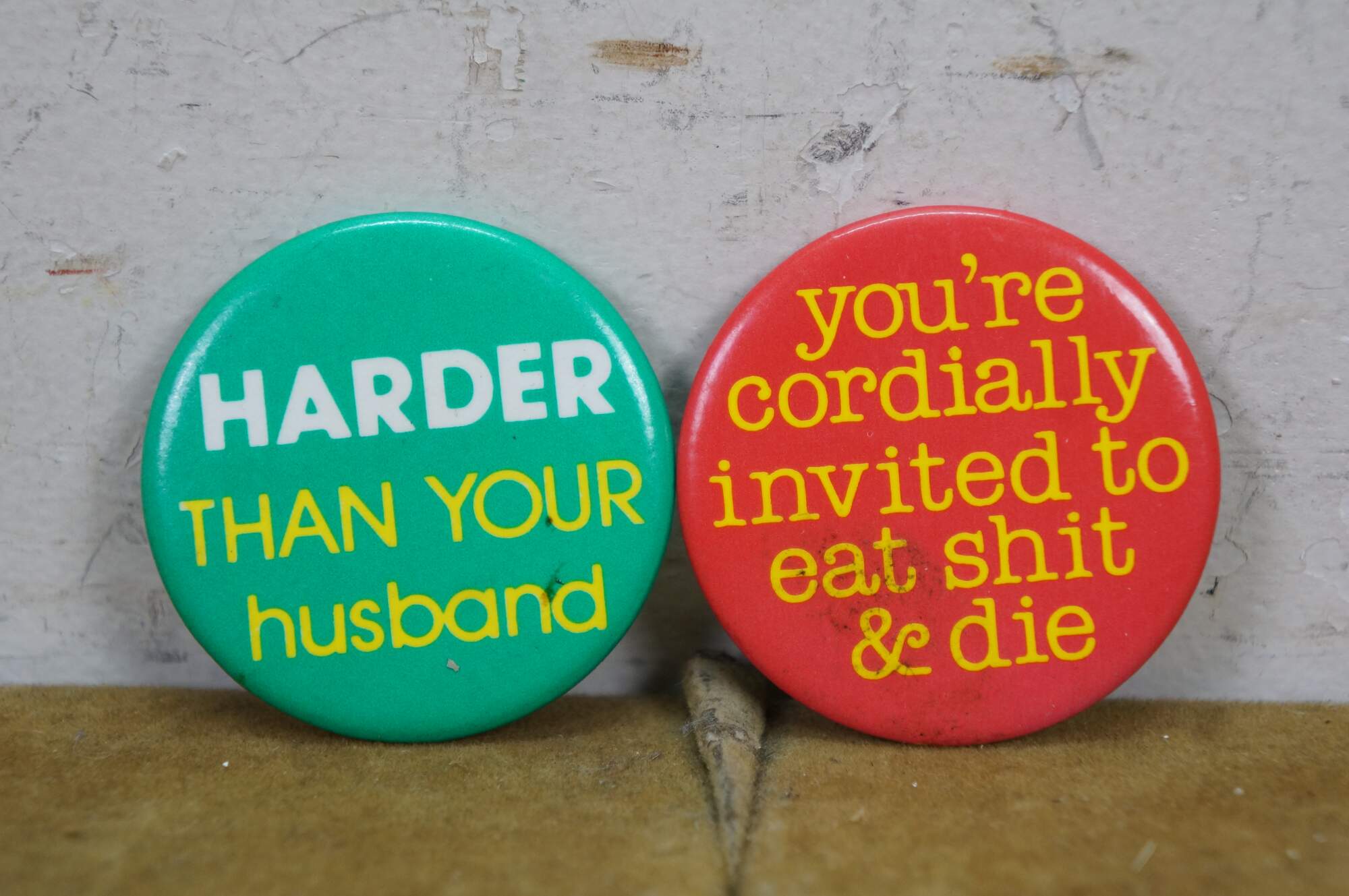 Vintage novelty pinback buttons, often called adult humor buttons or slogan pins, featuring various risqué or funny phrases from the 1970s and 80s.