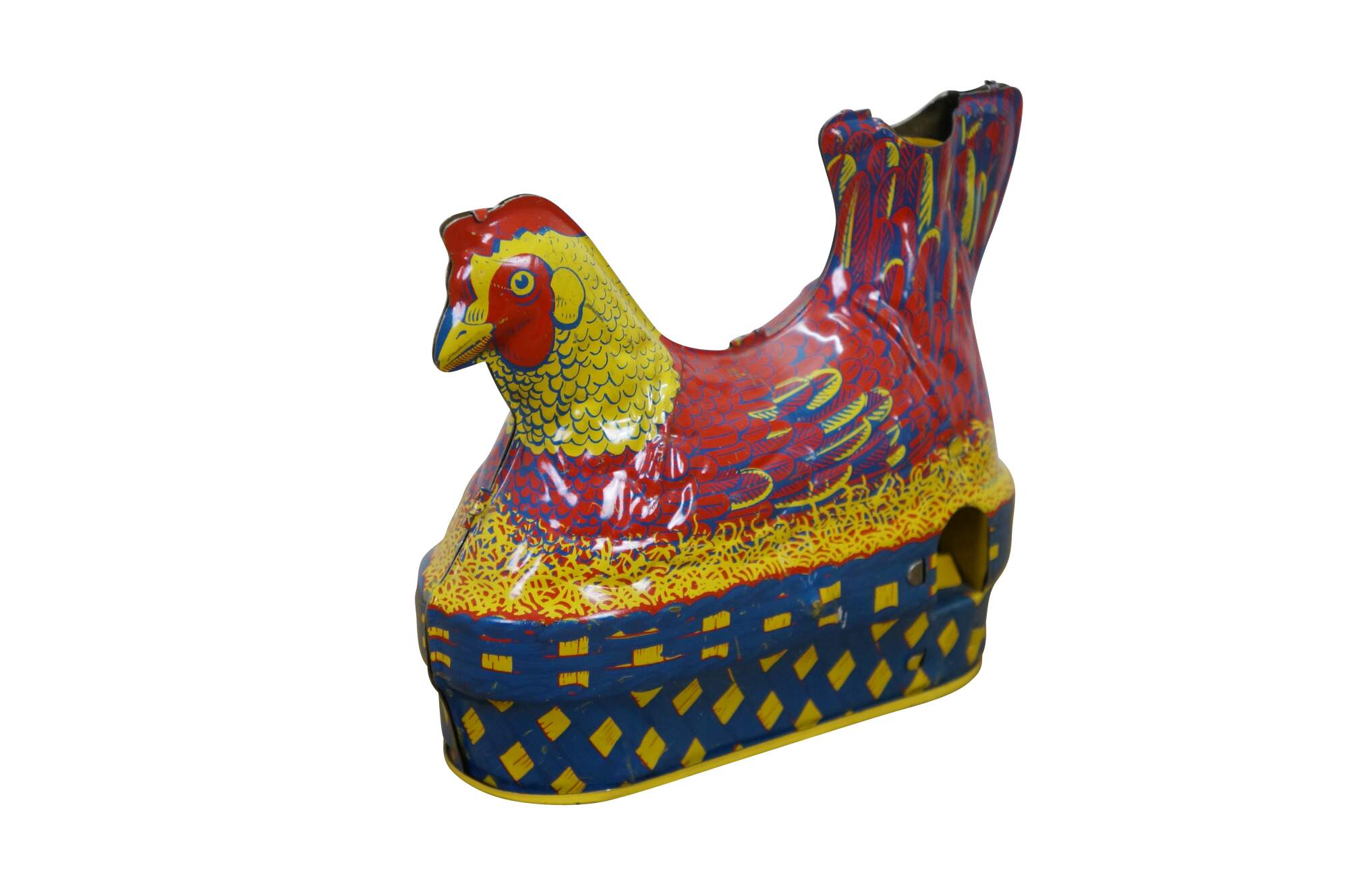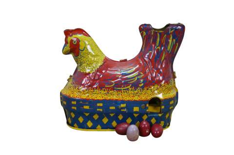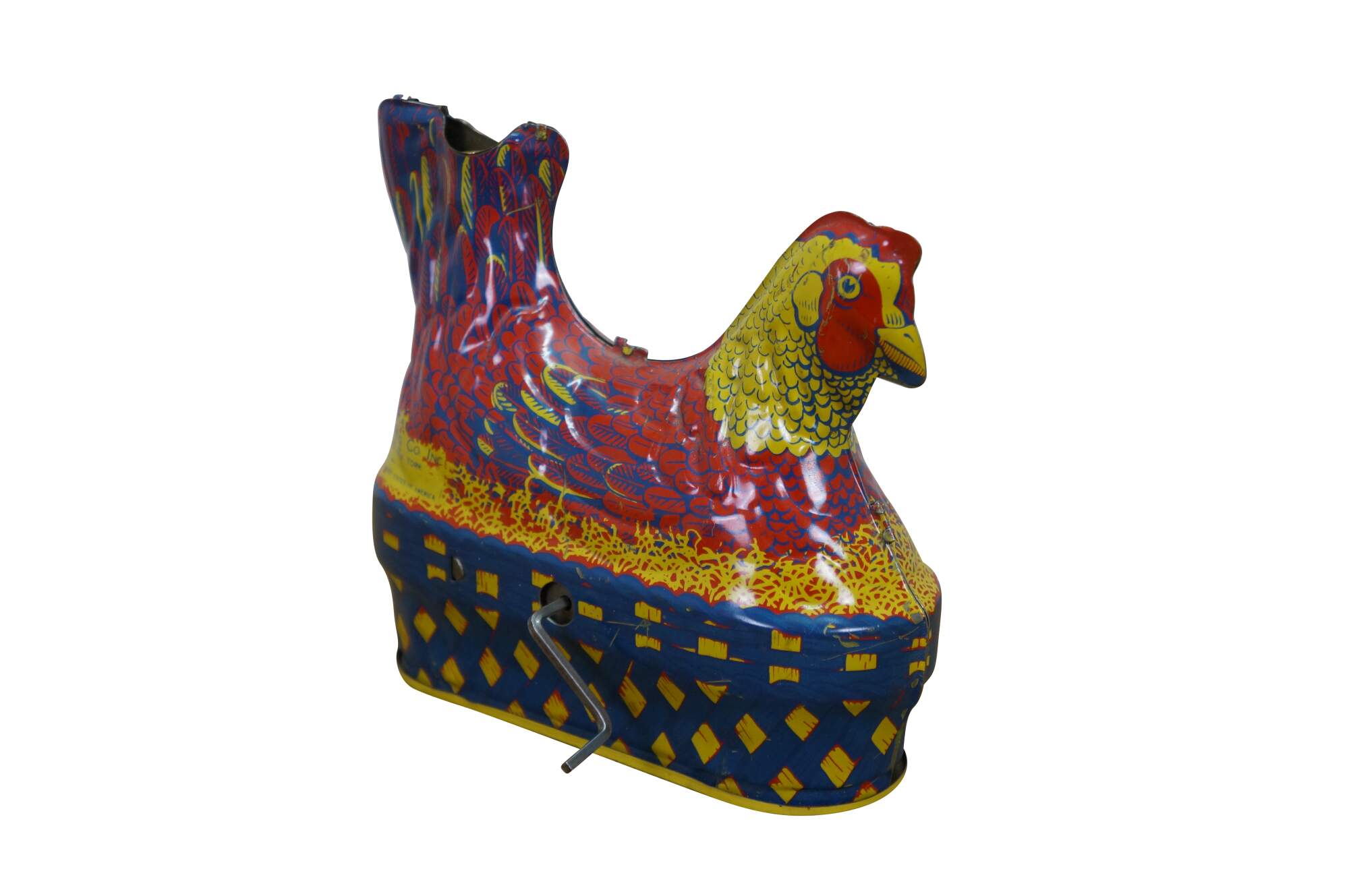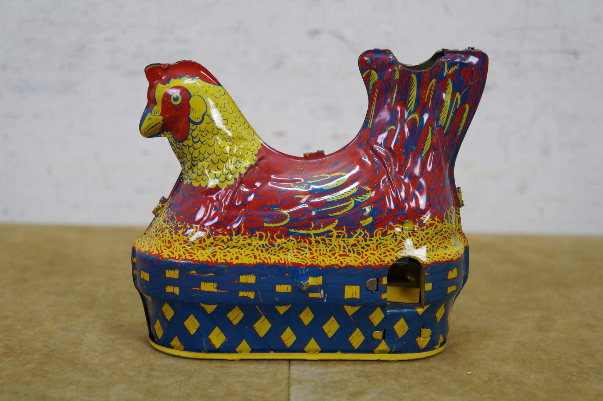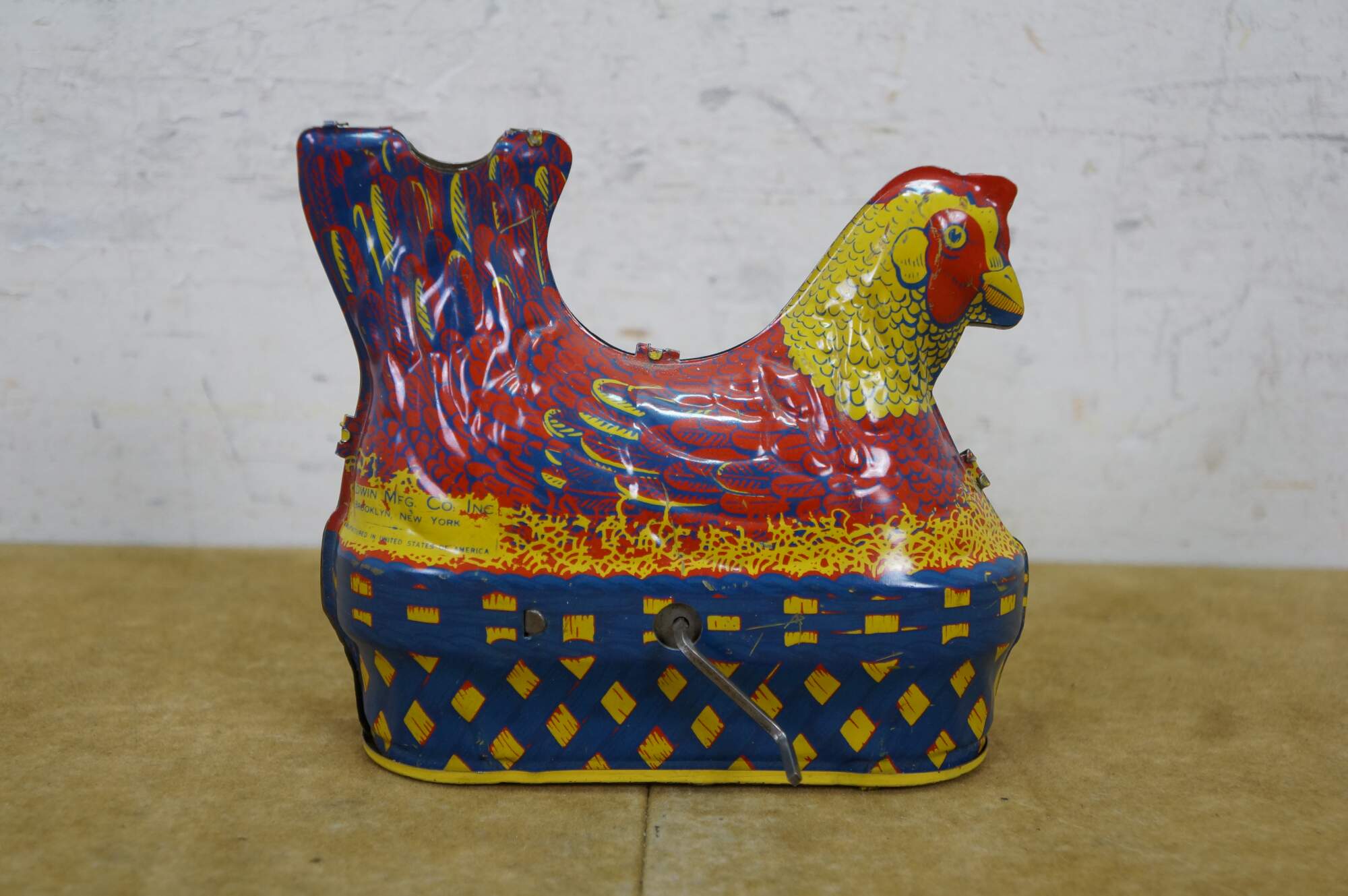 Antique 1930s Baldwin Manufacturing Company tin lithographed clucking and egg-laying chicken toy. Baldwin Manufacturing Company based in Brooklyn, New York.