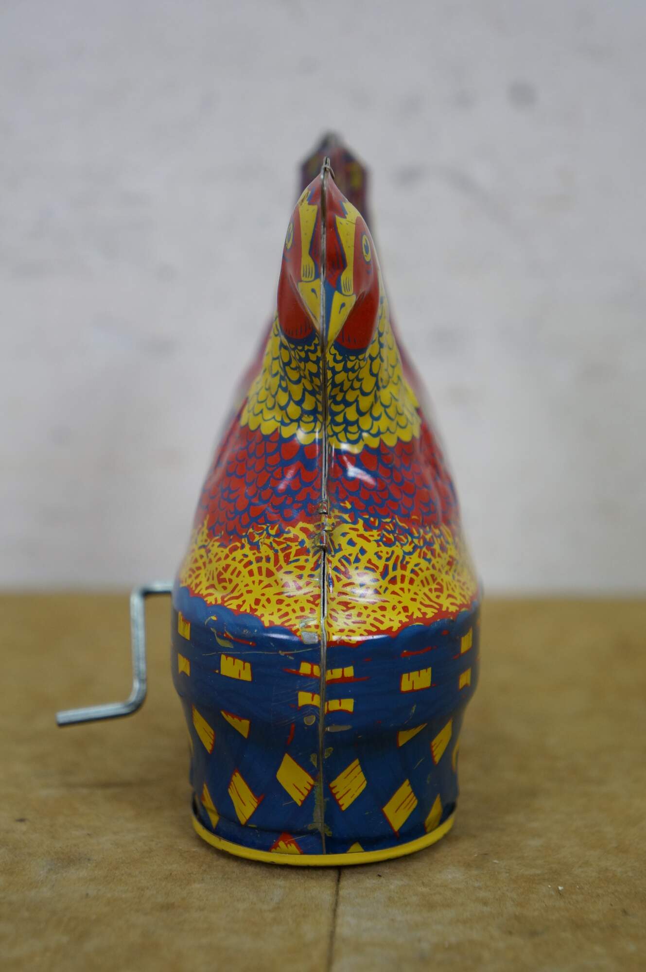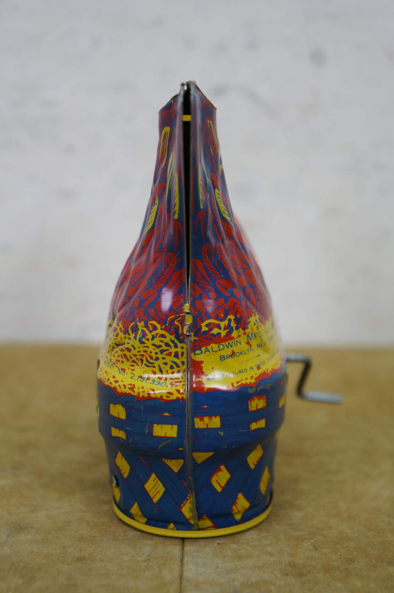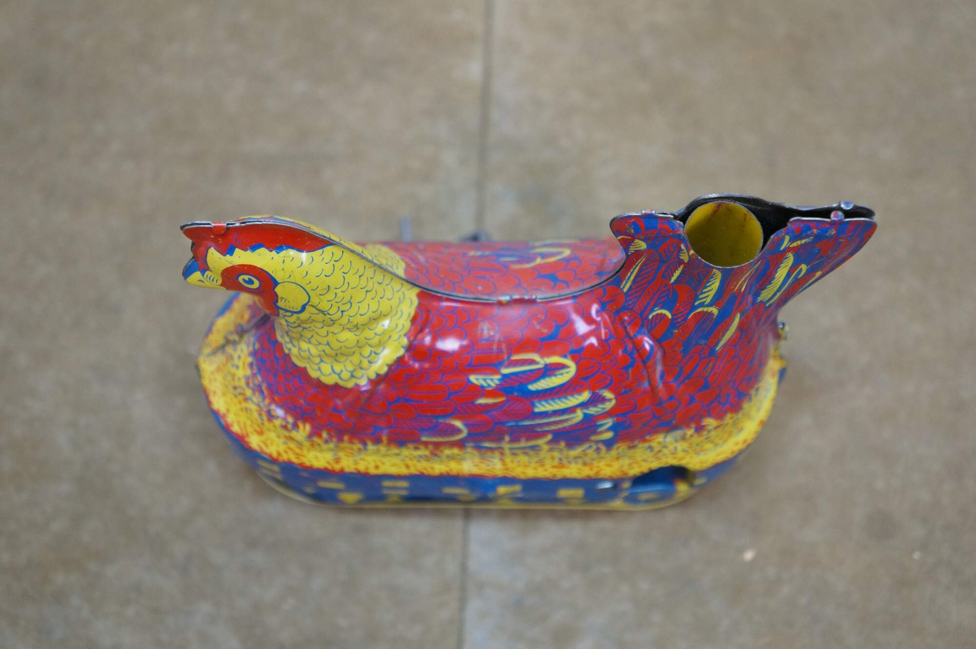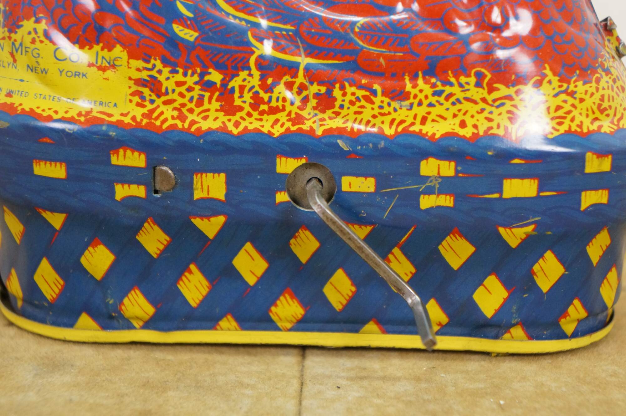 Antique 1930s Baldwin Manufacturing Company tin lithographed clucking and egg-laying chicken toy. Baldwin Manufacturing Company based in Brooklyn, New York.