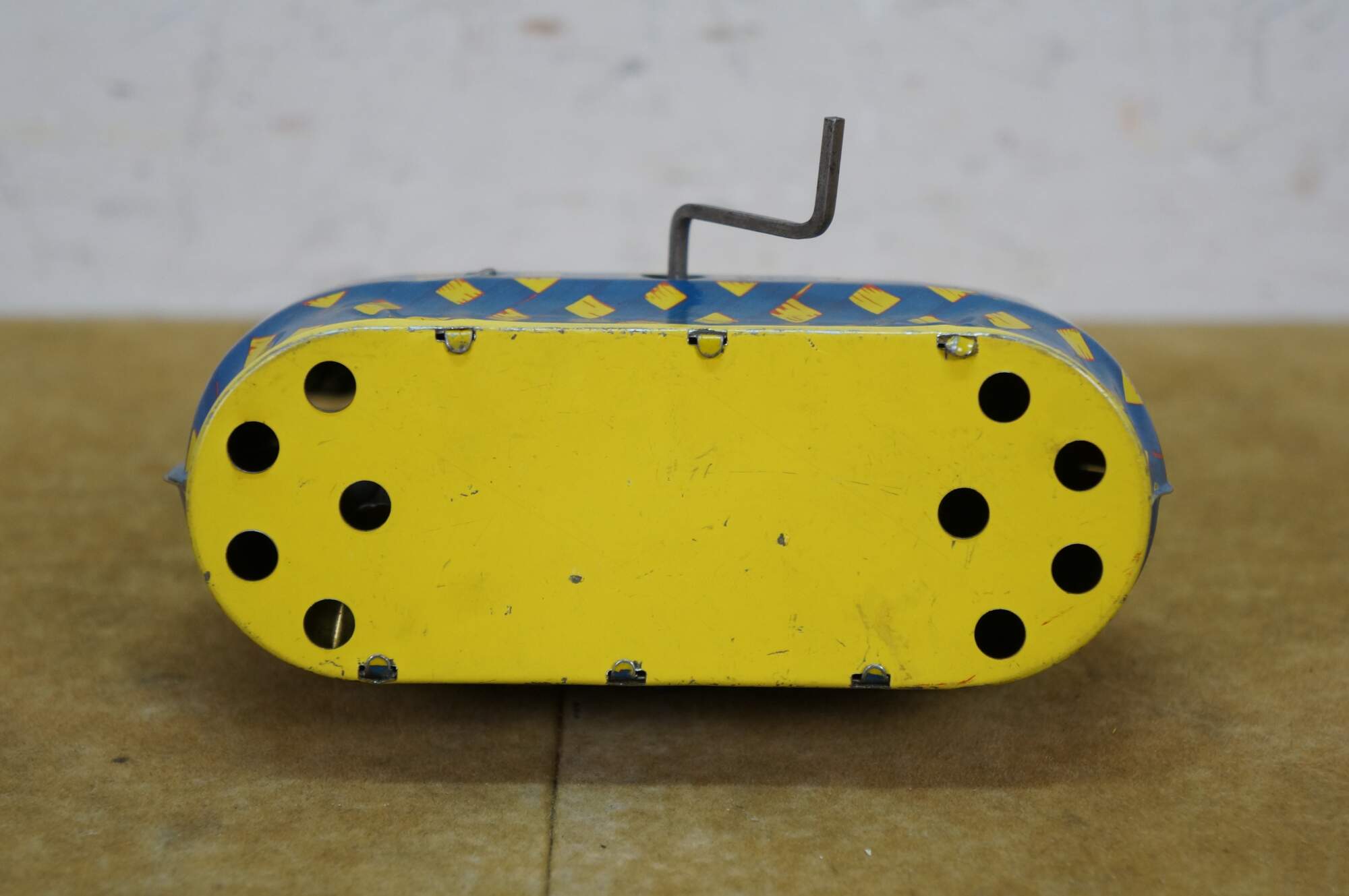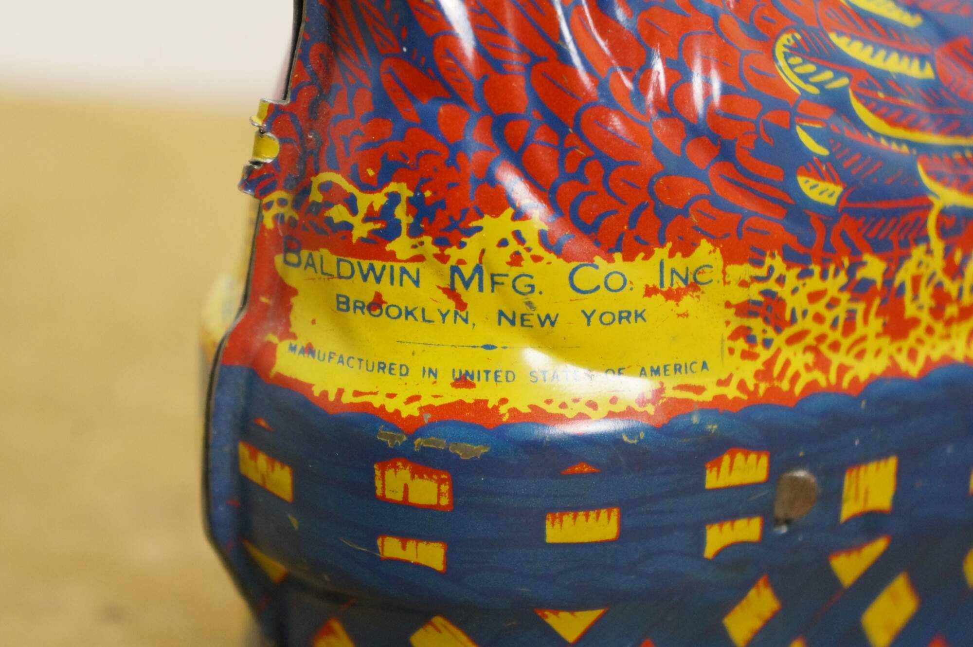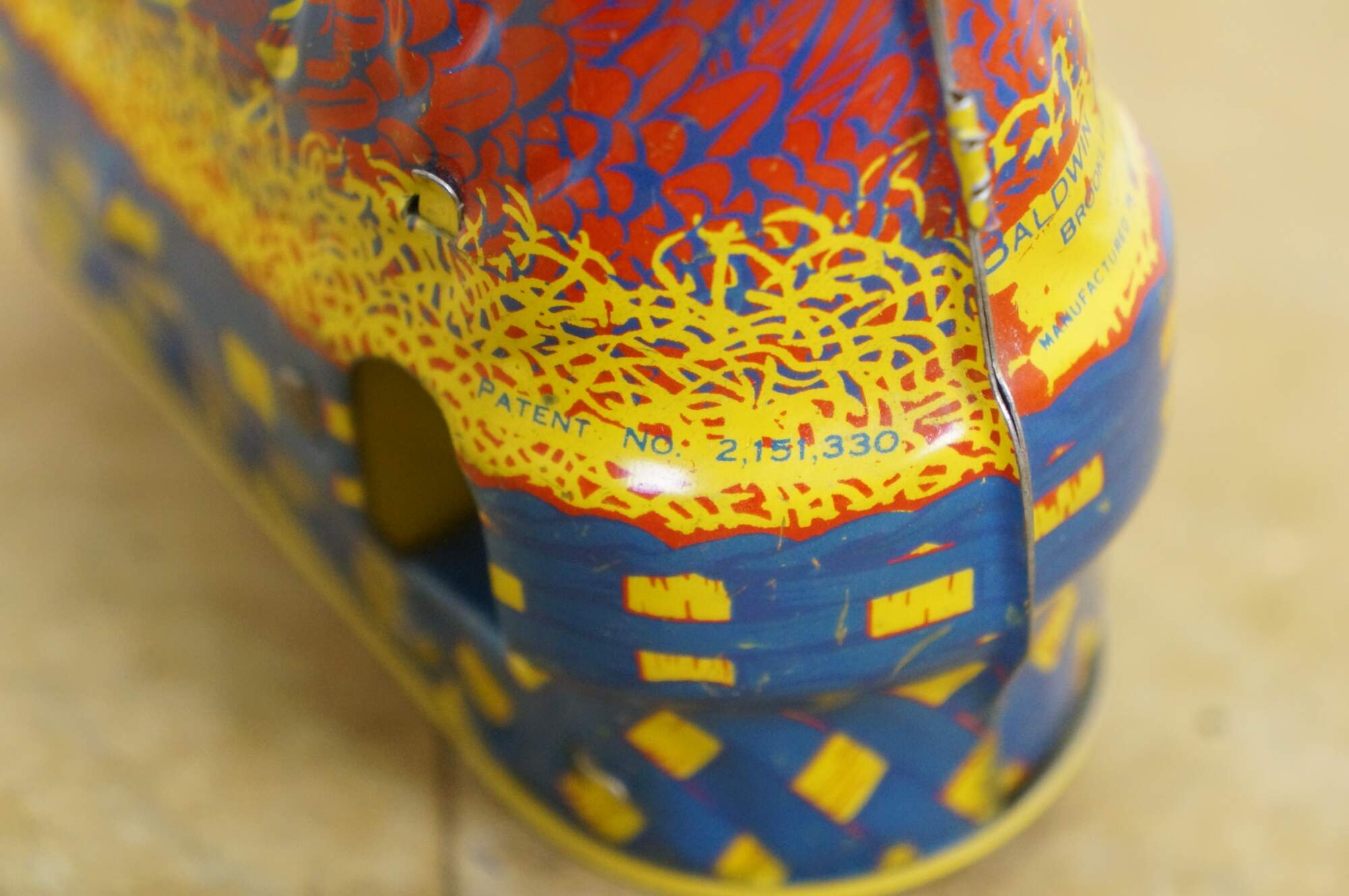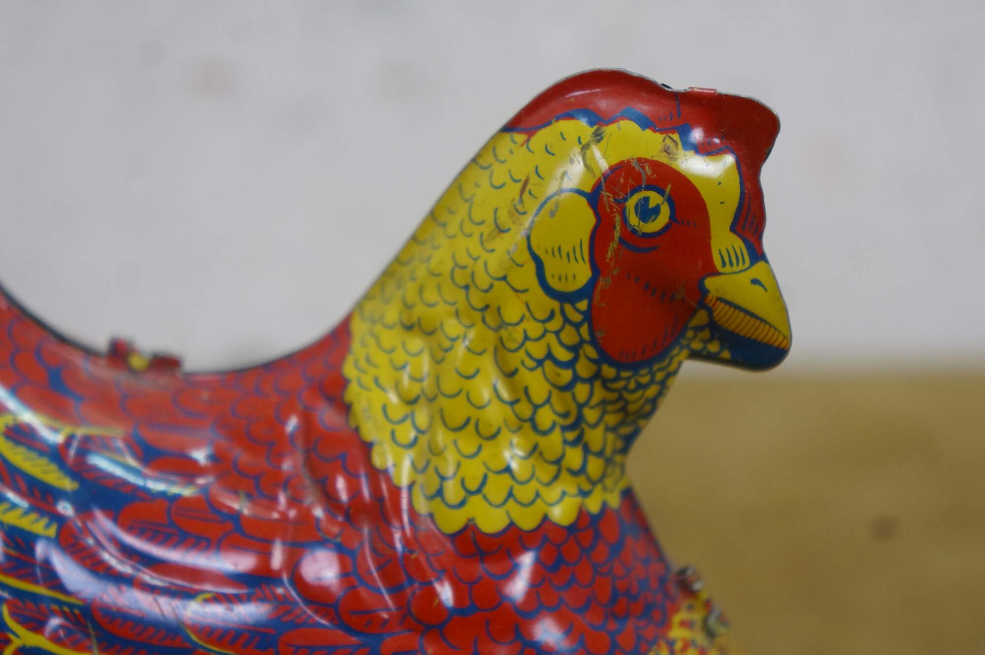 Antique 1930s Baldwin Manufacturing Company tin lithographed clucking and egg-laying chicken toy. Baldwin Manufacturing Company based in Brooklyn, New York.