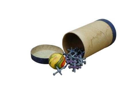 Mid century set of Jacks; includes a small, brightly colored rubber ball and 17 small, six-pointed pieces. This traditional children's game is played by tossing the ball into the air, picking up the jacks, and catching the ball before it bounces more than once. Circa 1950s.