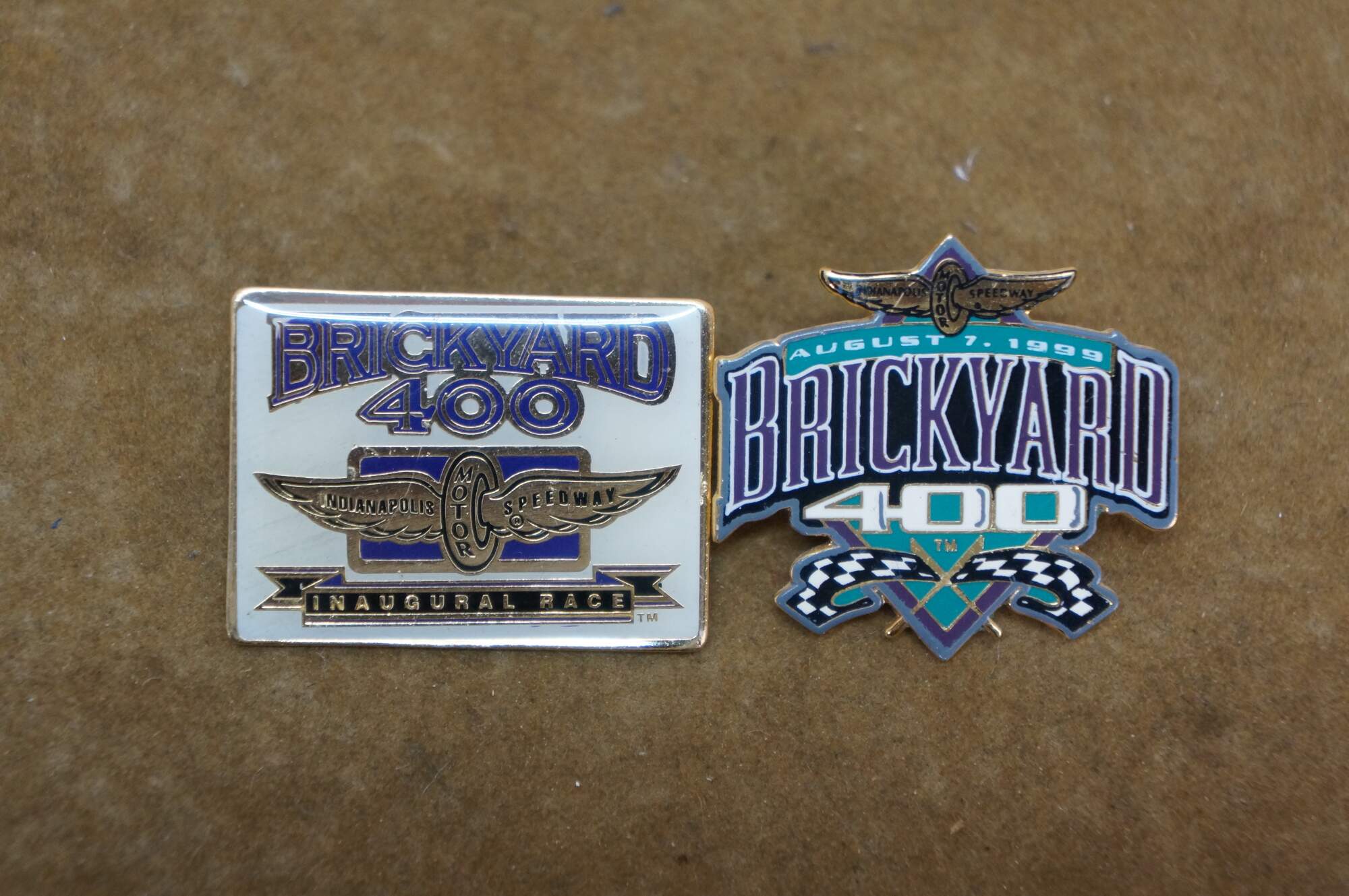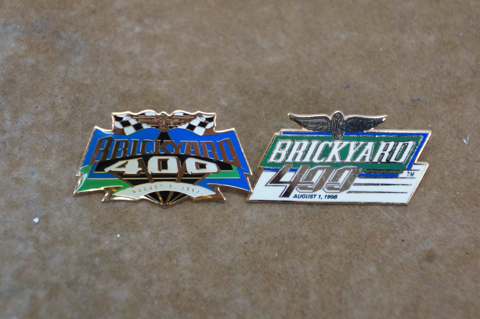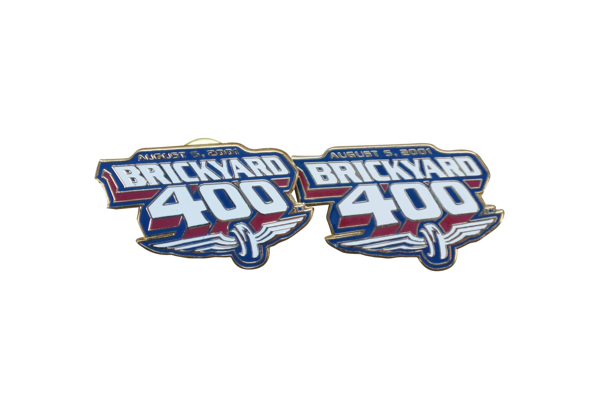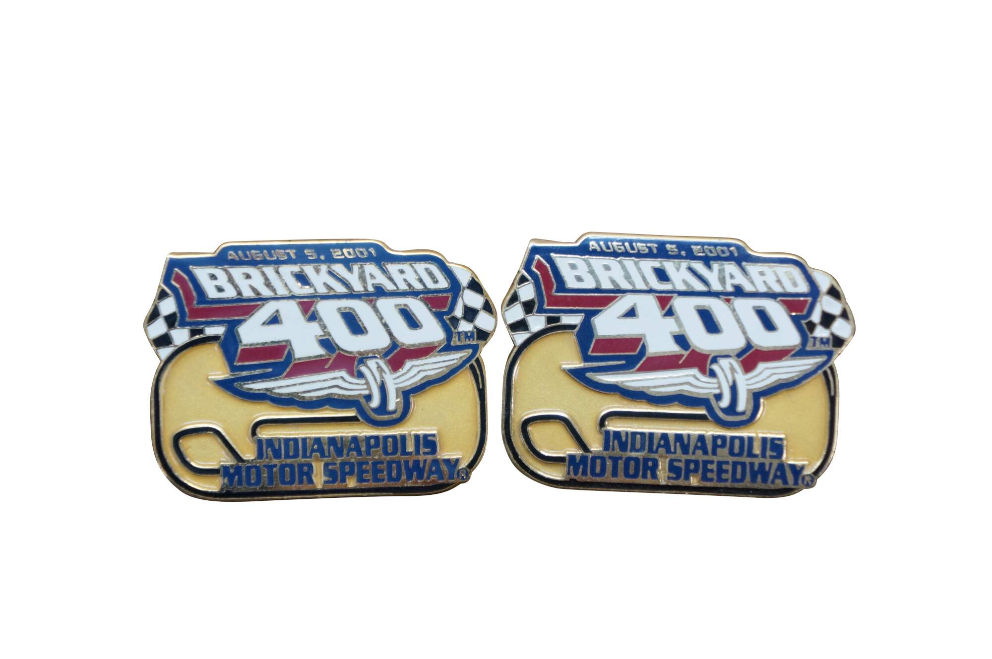 Fourteen vintage enamel lapel pins commemorating the NASCAR Brickyard 400 race held at the Indianapolis Motor Speedway.