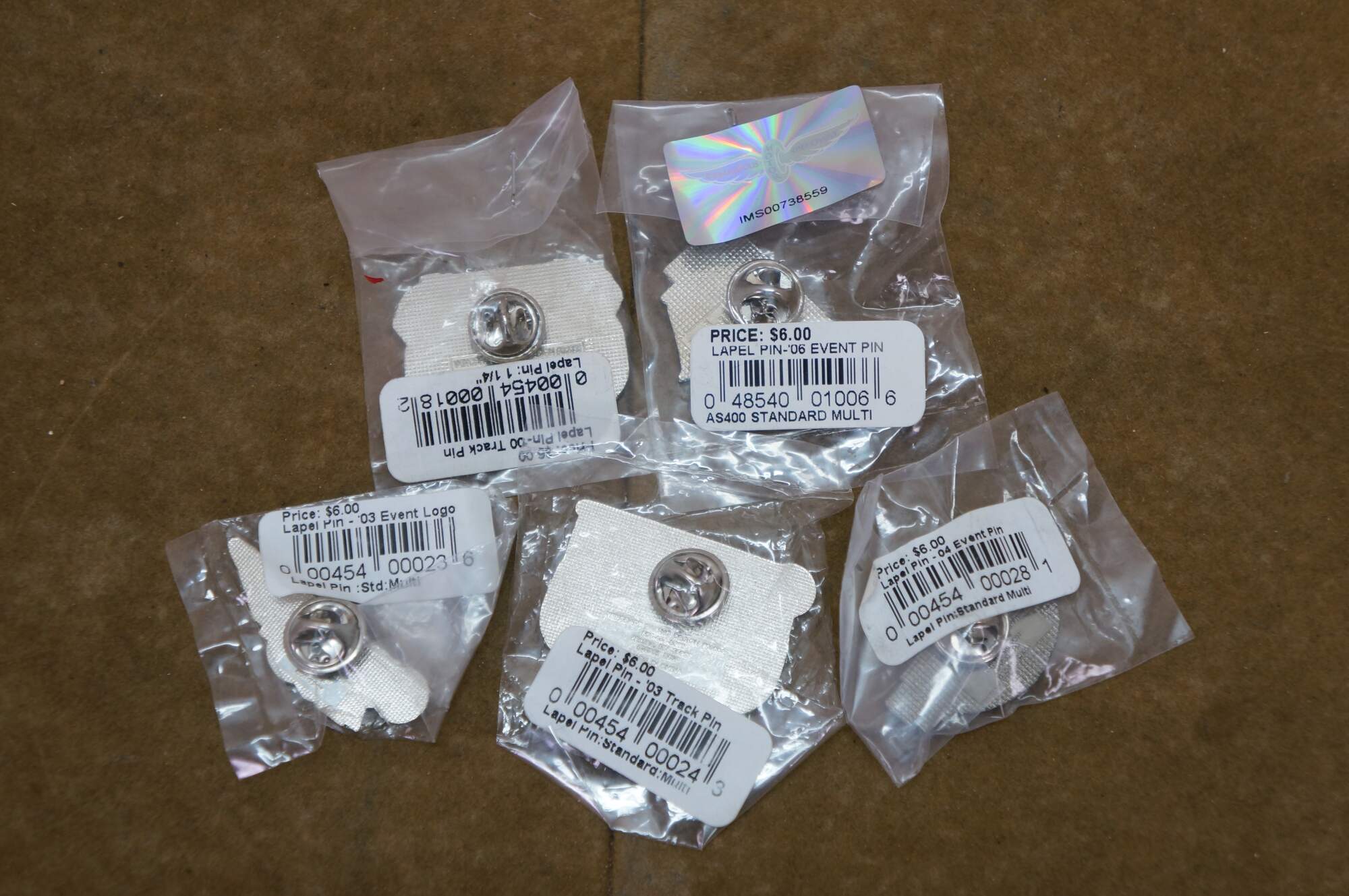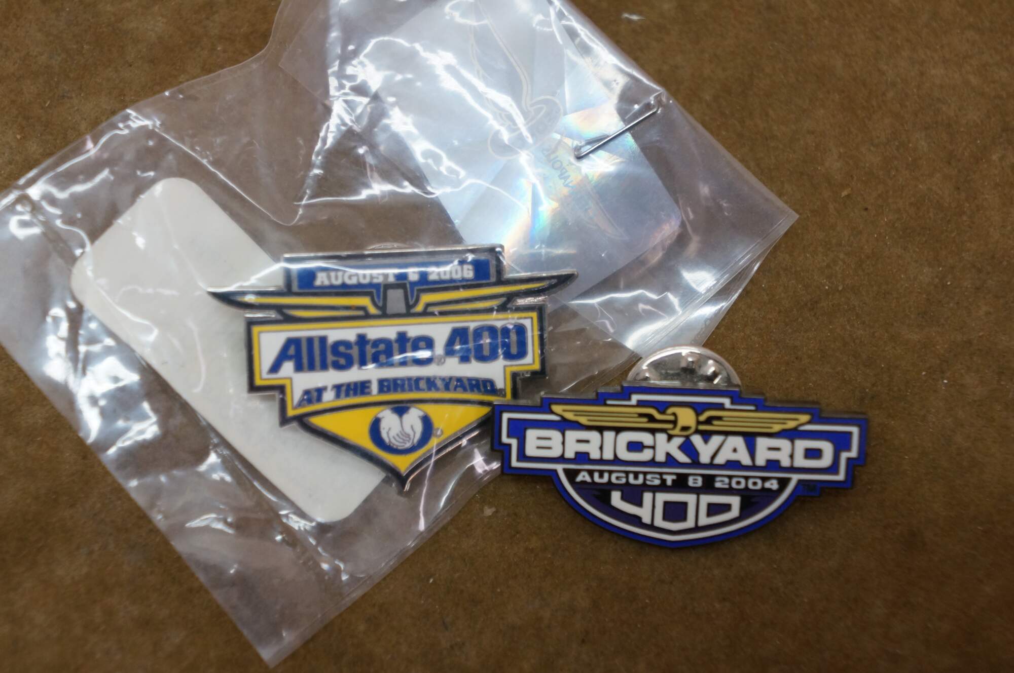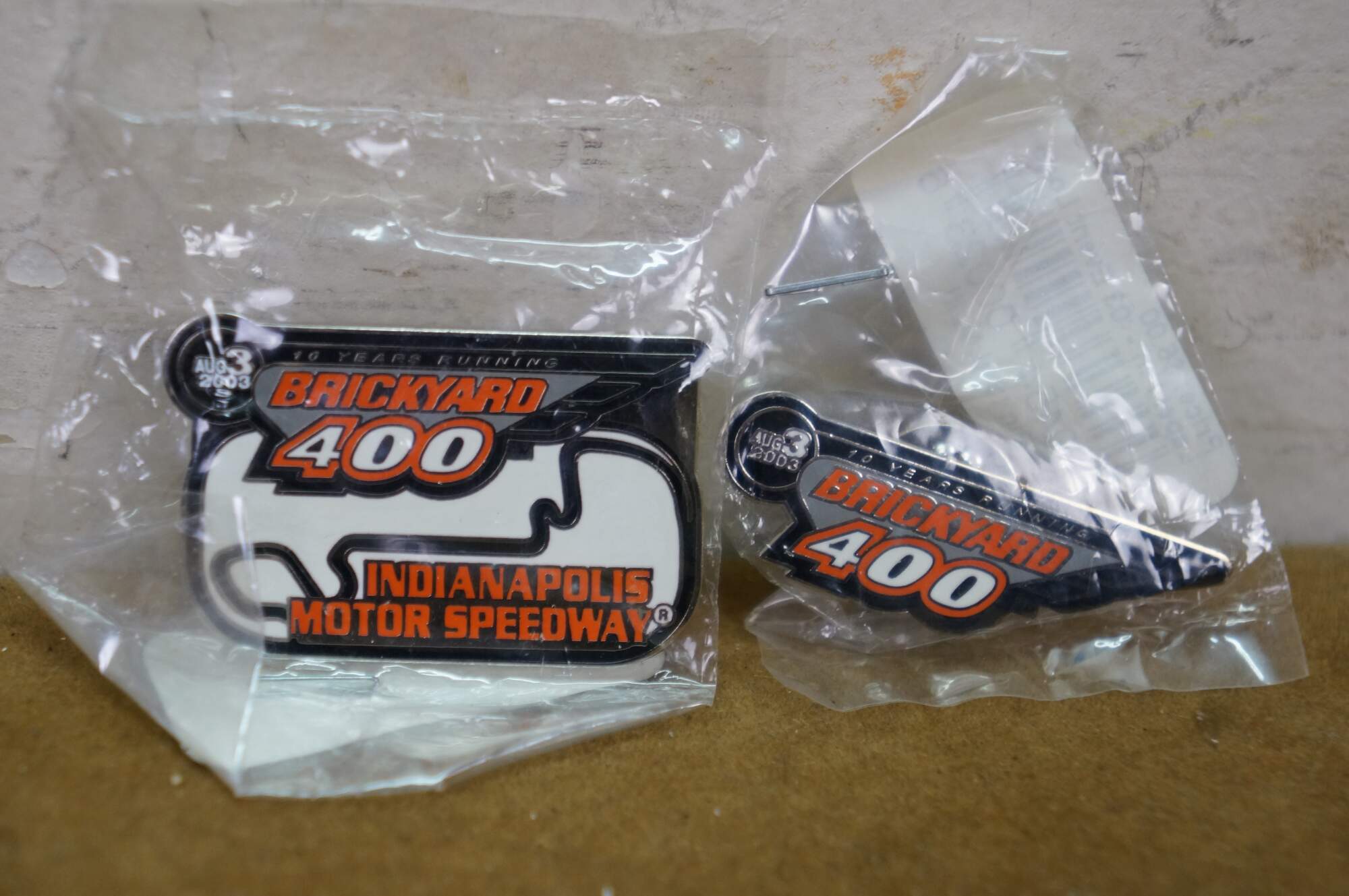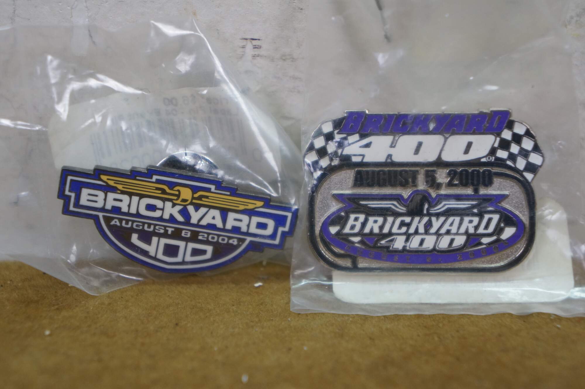 Fourteen vintage enamel lapel pins commemorating the NASCAR Brickyard 400 race held at the Indianapolis Motor Speedway.