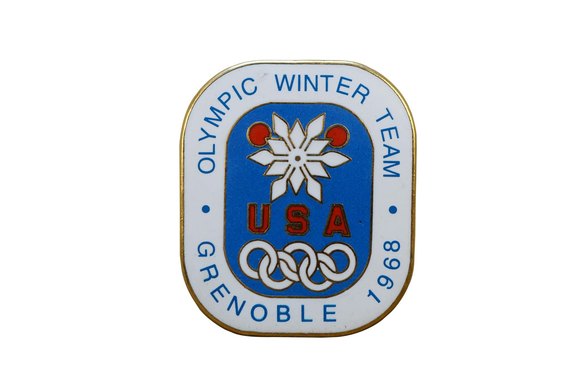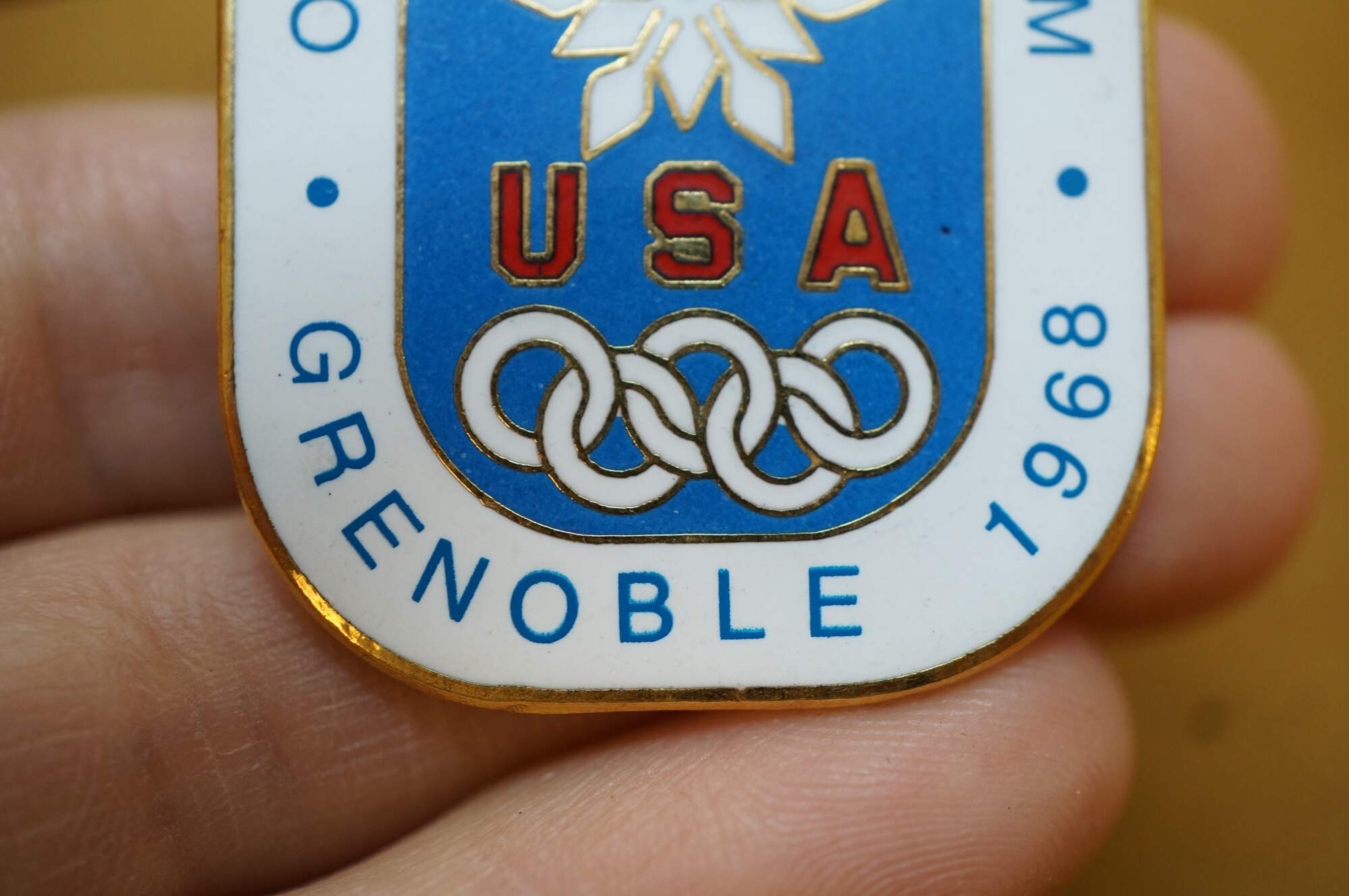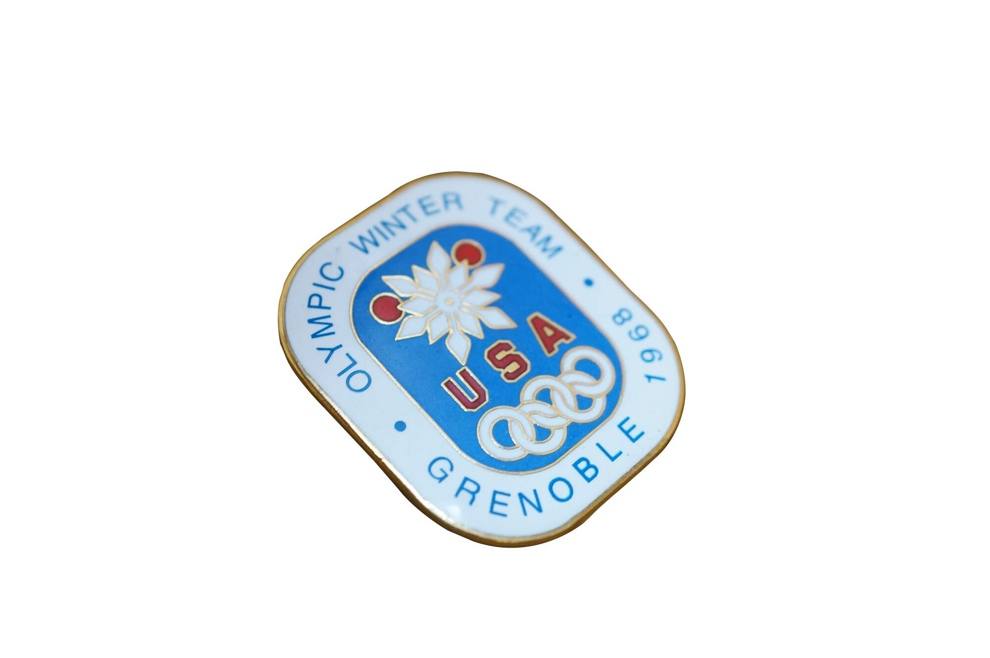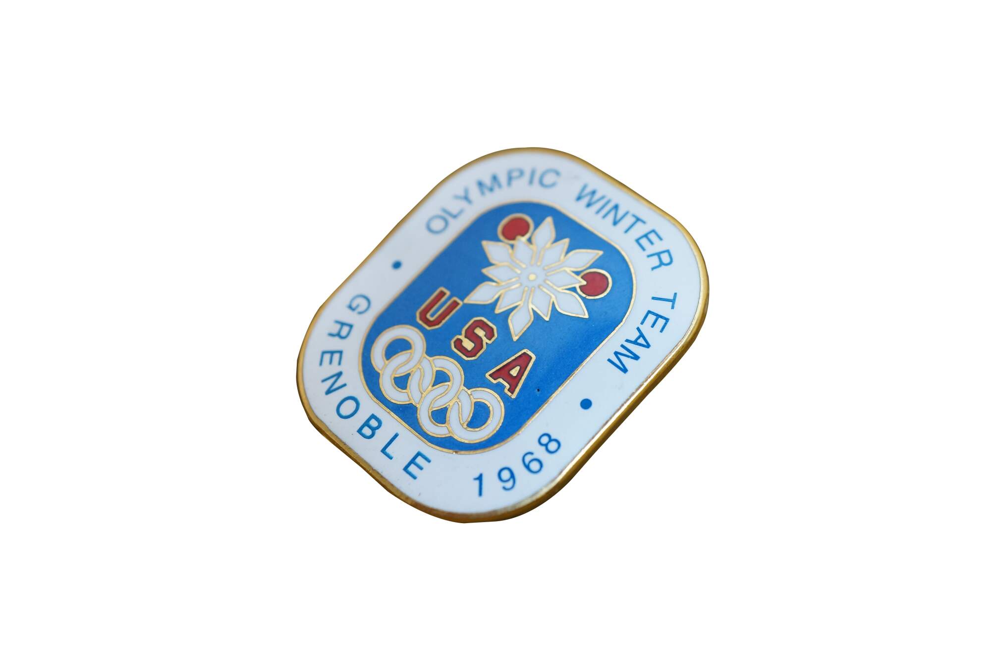Mid century 1968 Winter Olympics pin featuring the United States team logo from the Grenoble Games in France flanked by a snowflake and Olympic rings.