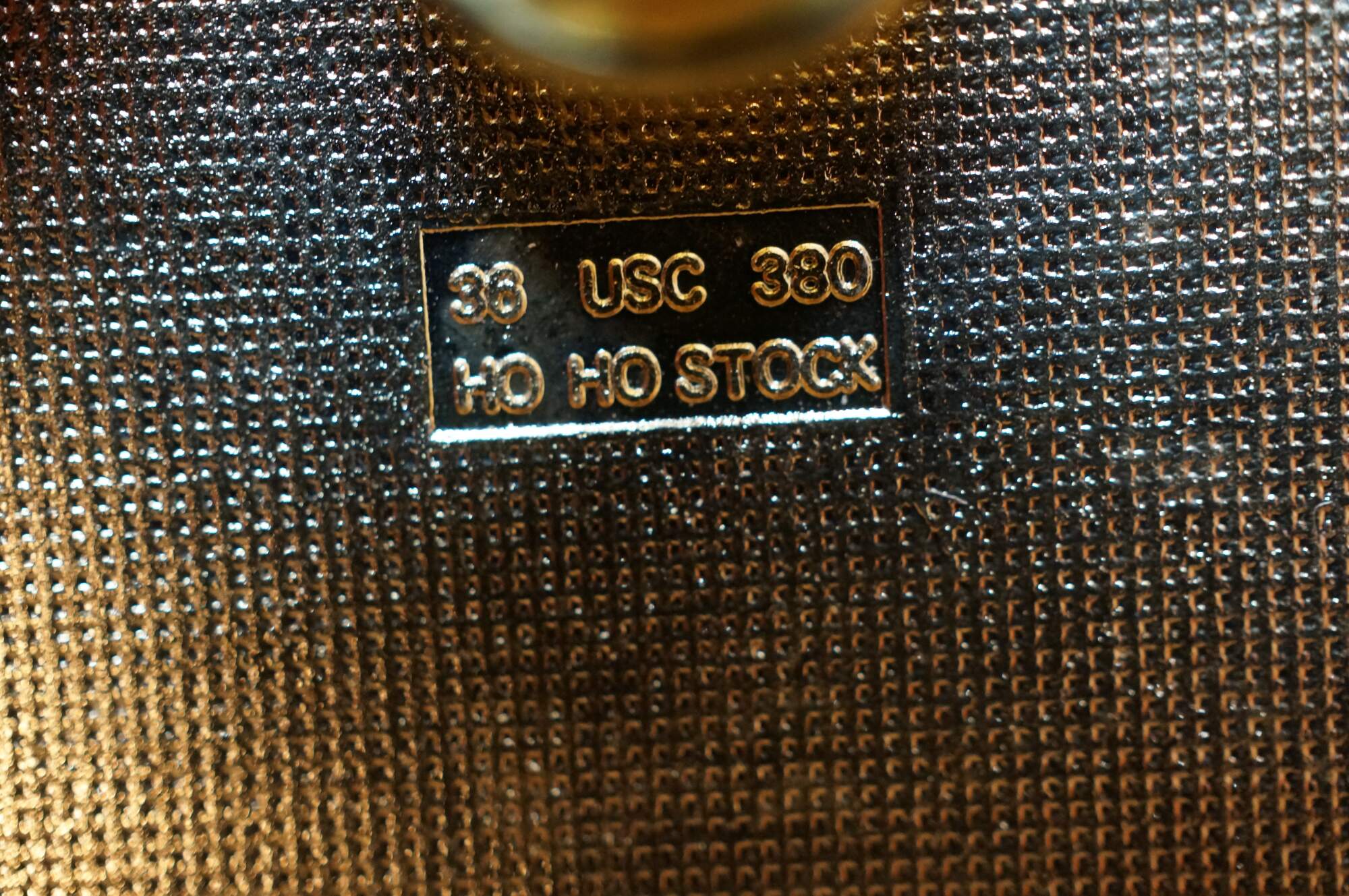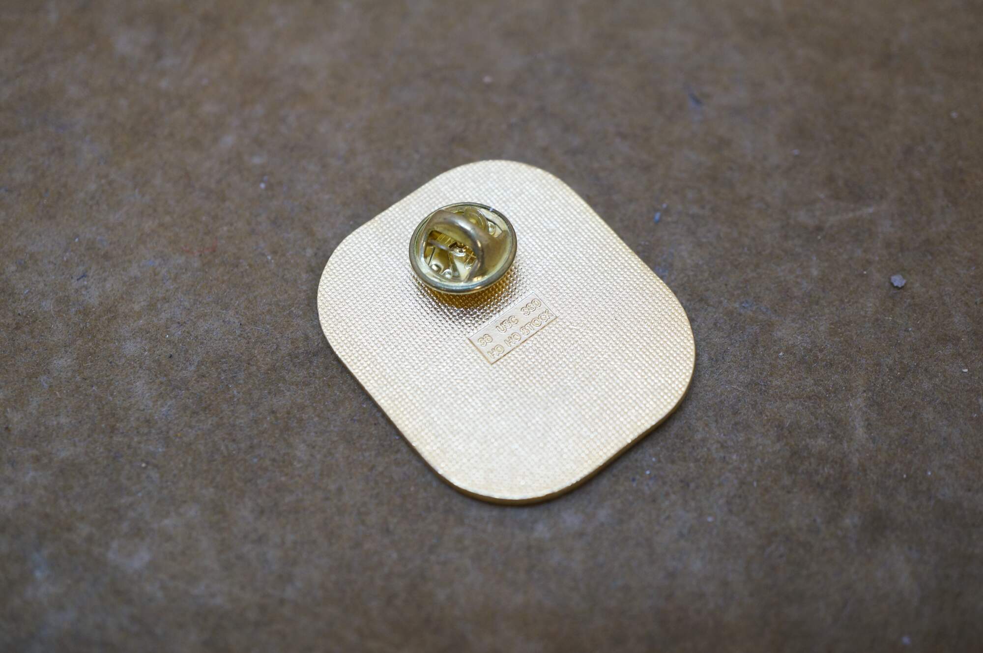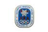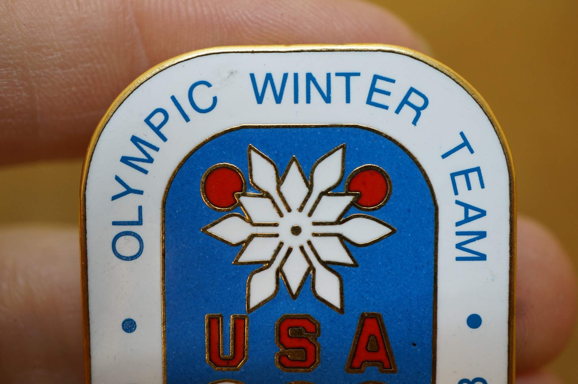 Mid century 1968 Winter Olympics pin featuring the United States team logo from the Grenoble Games in France flanked by a snowflake and Olympic rings.