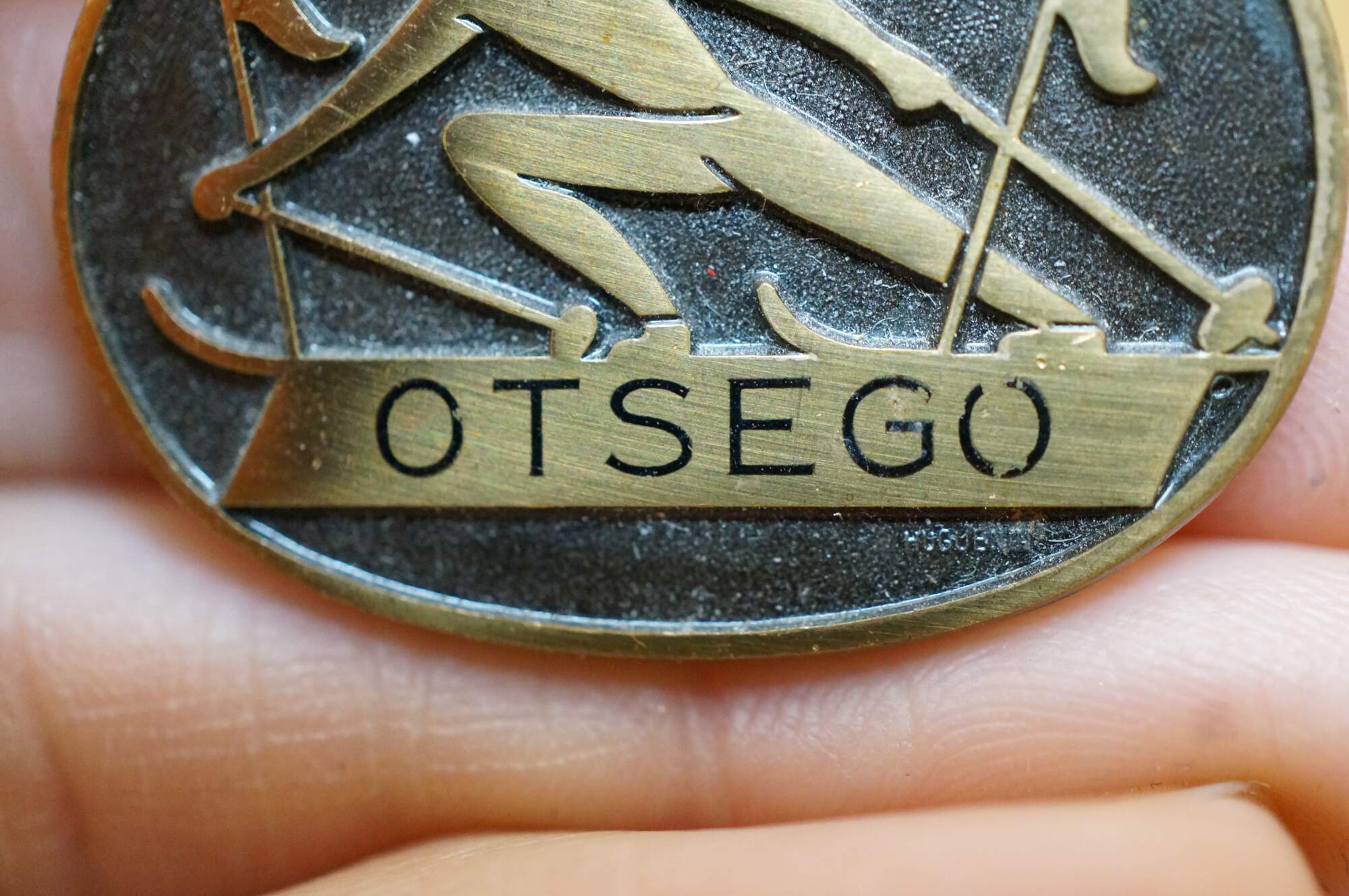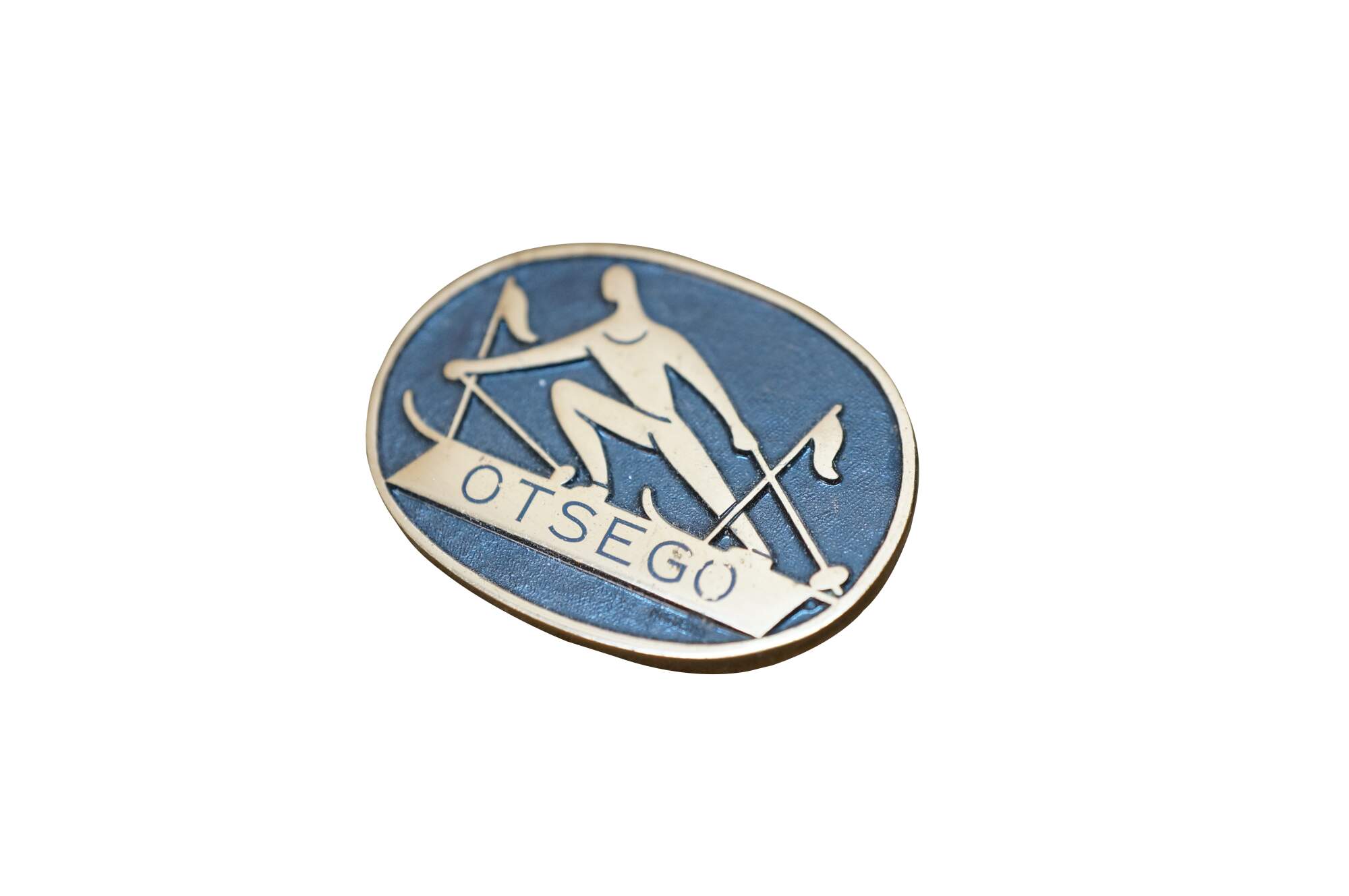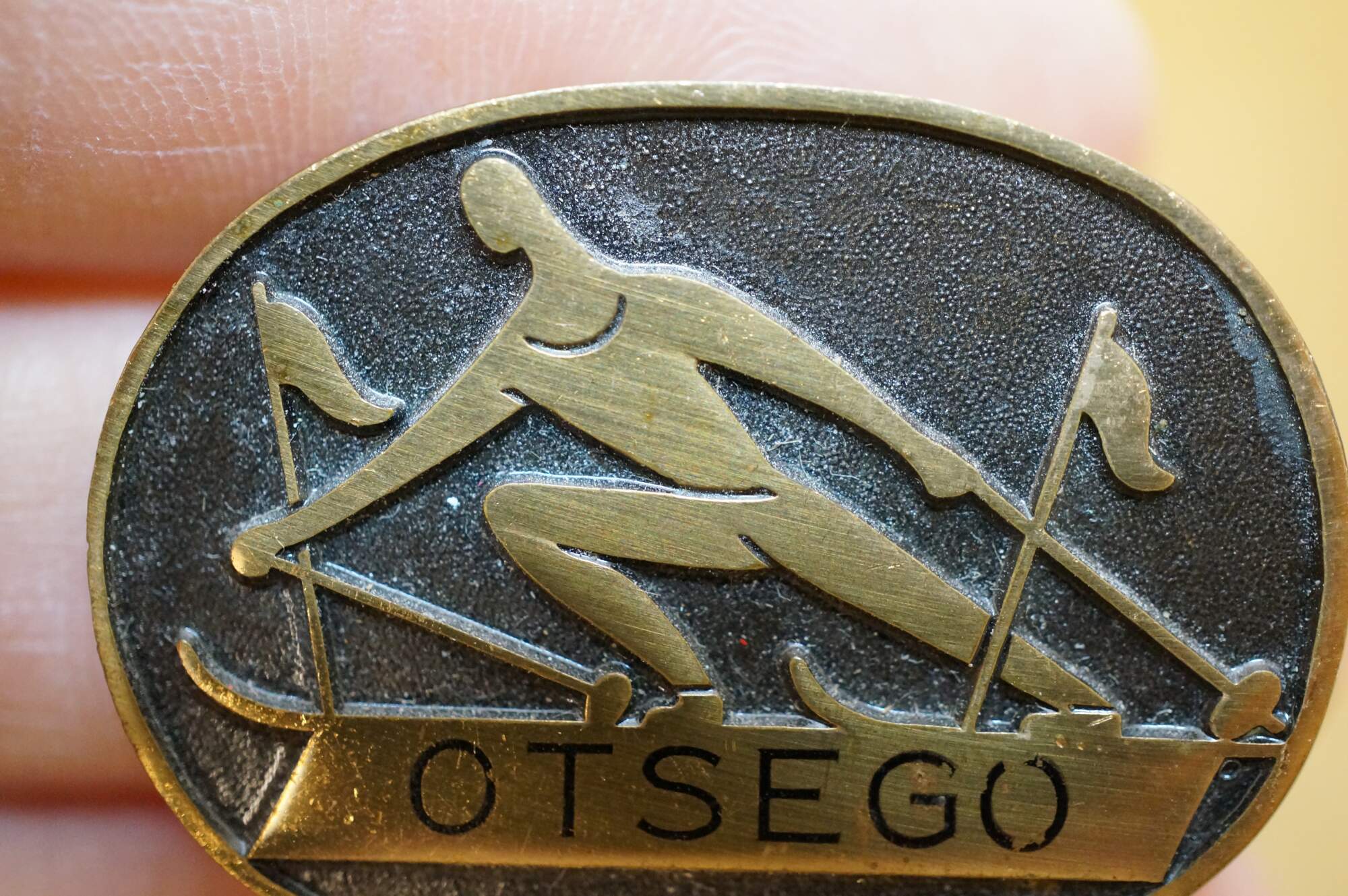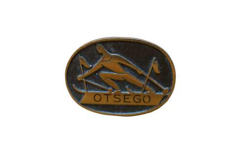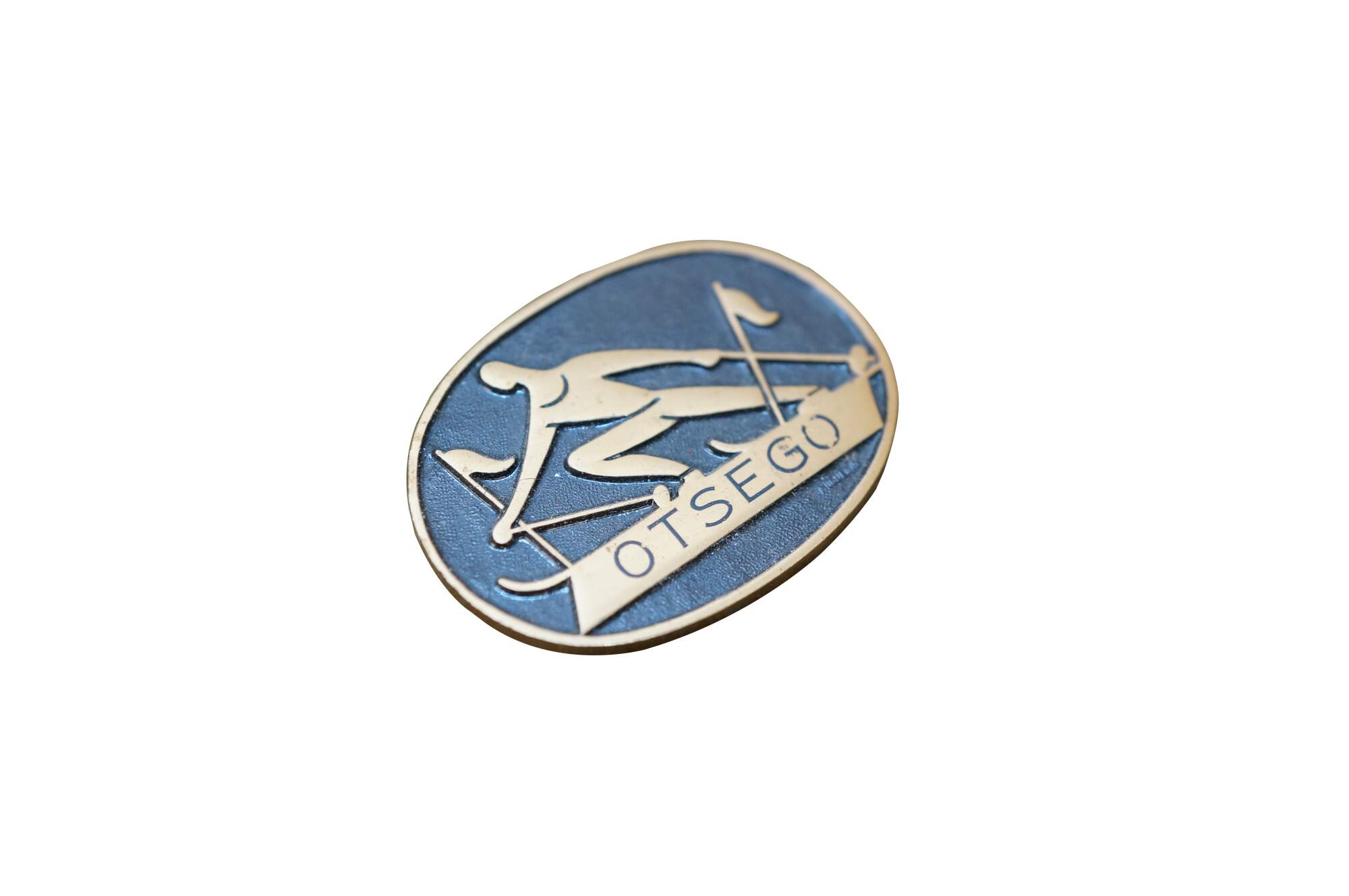Vintage Otsego enameled souvenir lapel pin featuring an Olympic alpine slalom skiing design.