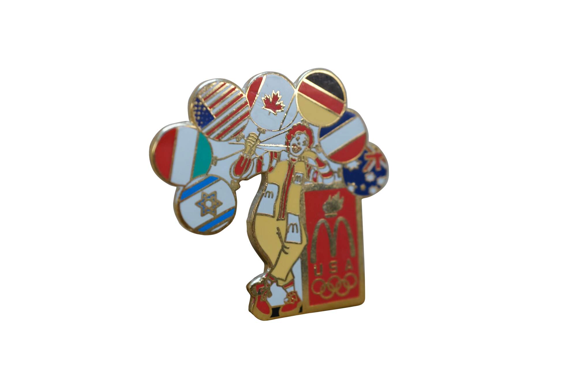 Vintage McDonald's Olympics souvenir lapel pin from the 1996 Atlanta games featuring Ronald McDonald holding balloons representing various nations' flags.