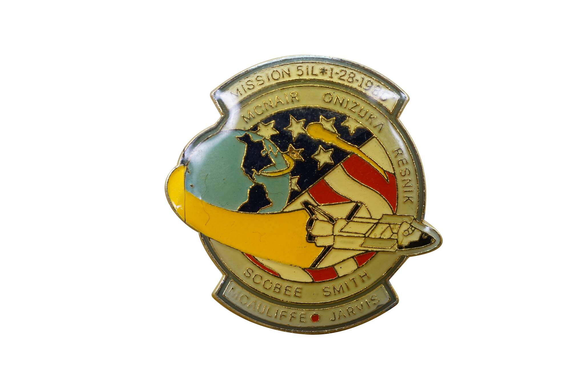 -1986 Space Shuttle Challenger mission STS-51L - It features the names of the seven crew members who were lost: Scobee, Smith, McNair, Onizuka, Resnik, McAuliffe, and Jarvis.
