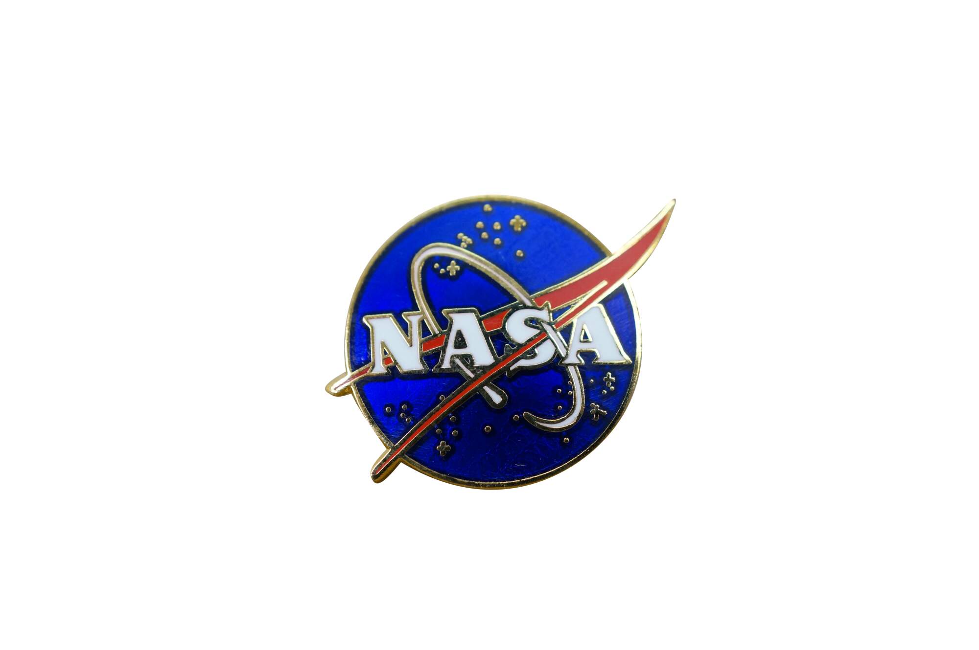- NASA "meatball" enamel lapel pin featuring the iconic red, white, and blue logo on a gold-toned metal back