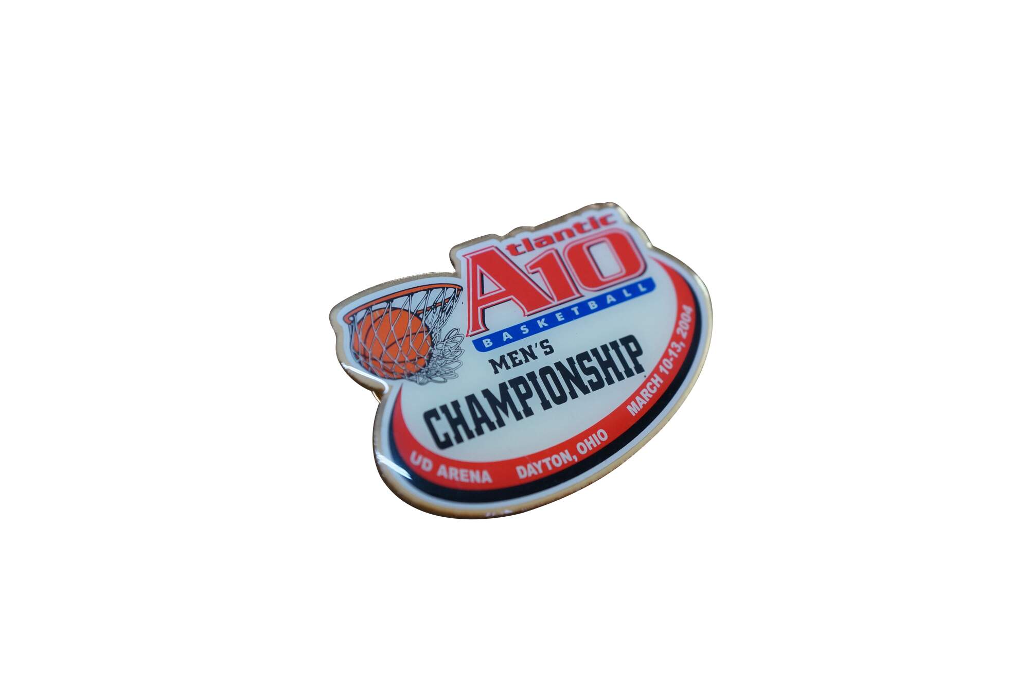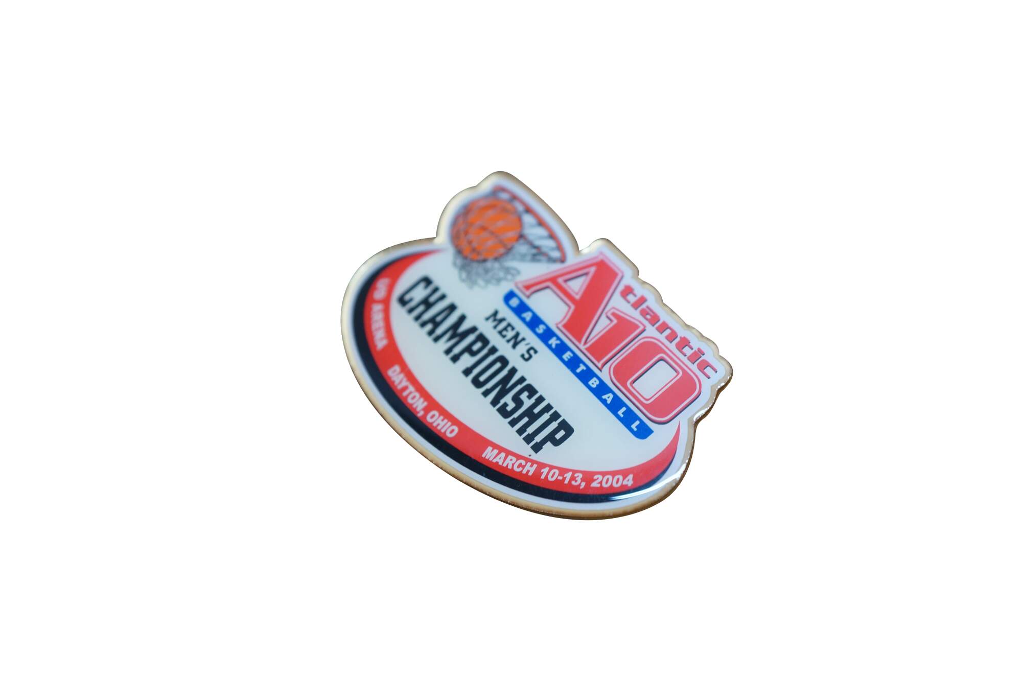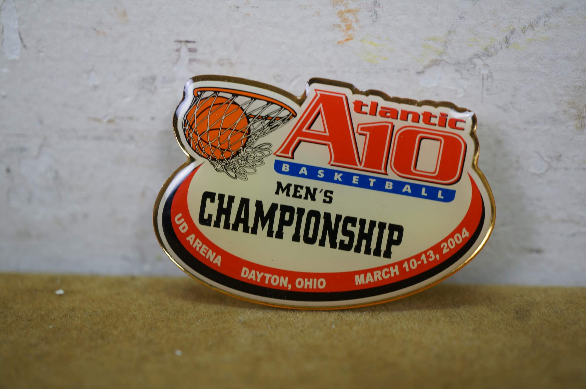 Three vintage lapel pins / brooches commemorating the 2004 Atlantic 10 Men's Basketball Tournament in Dayton Ohio.