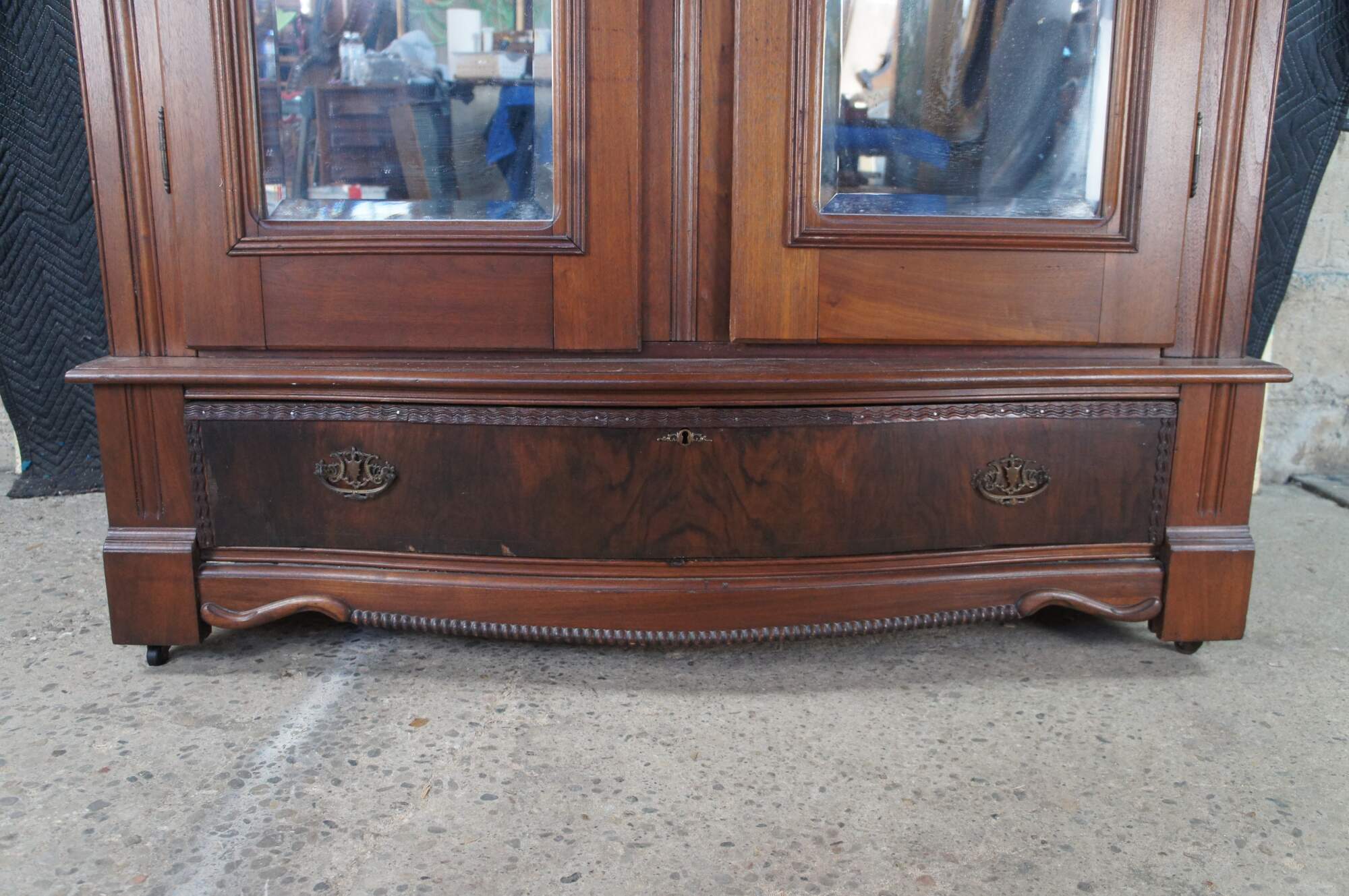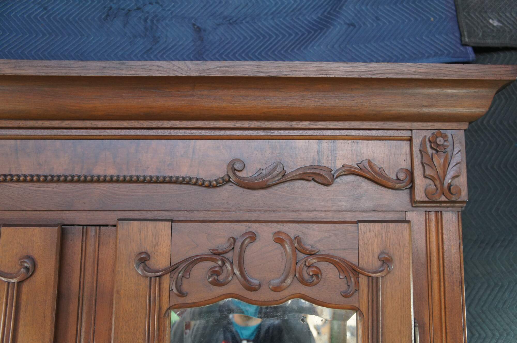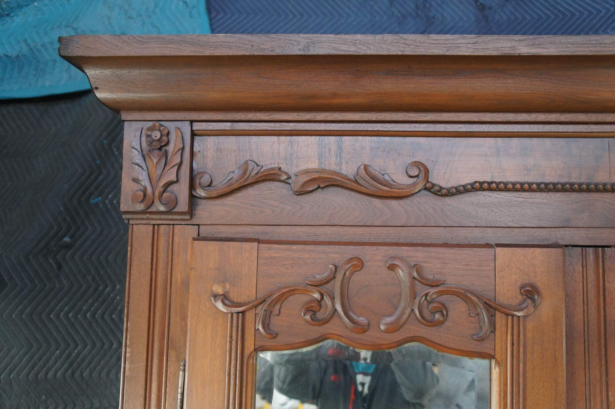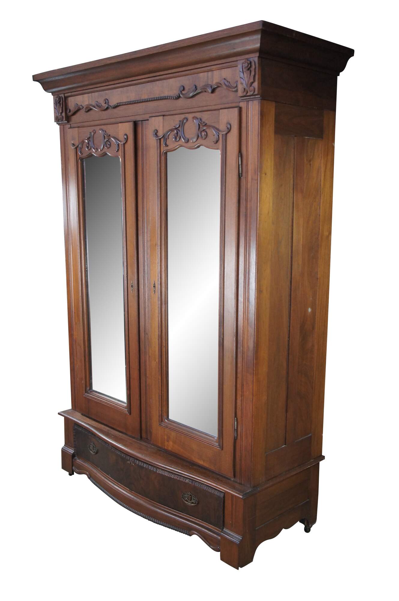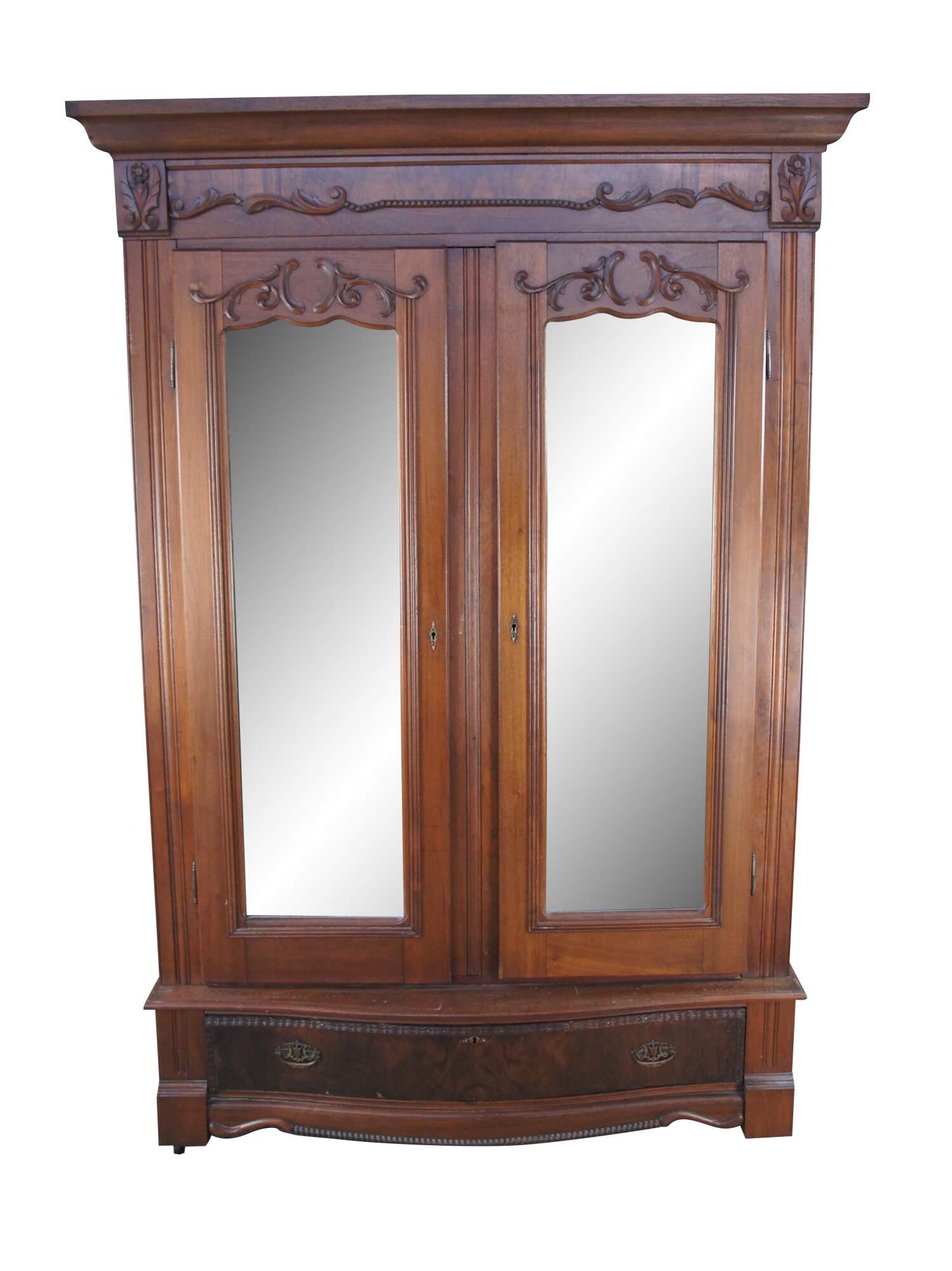 Antique 19th-century French clothing armoire. Made of walnut featuring hand-carved floral / acanthus / beaded details, full-length beveled mirrored doors, and a bottom drawer.