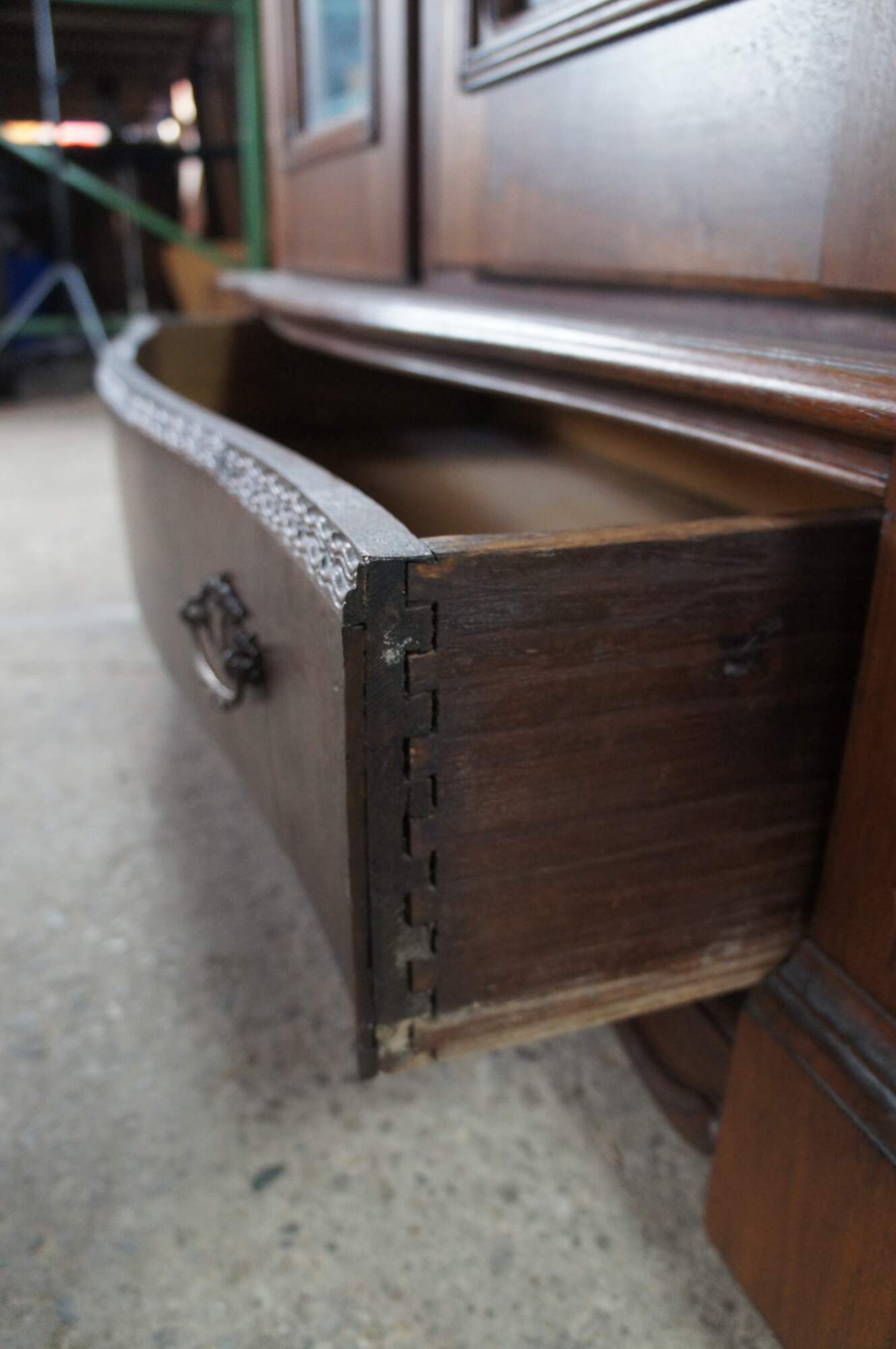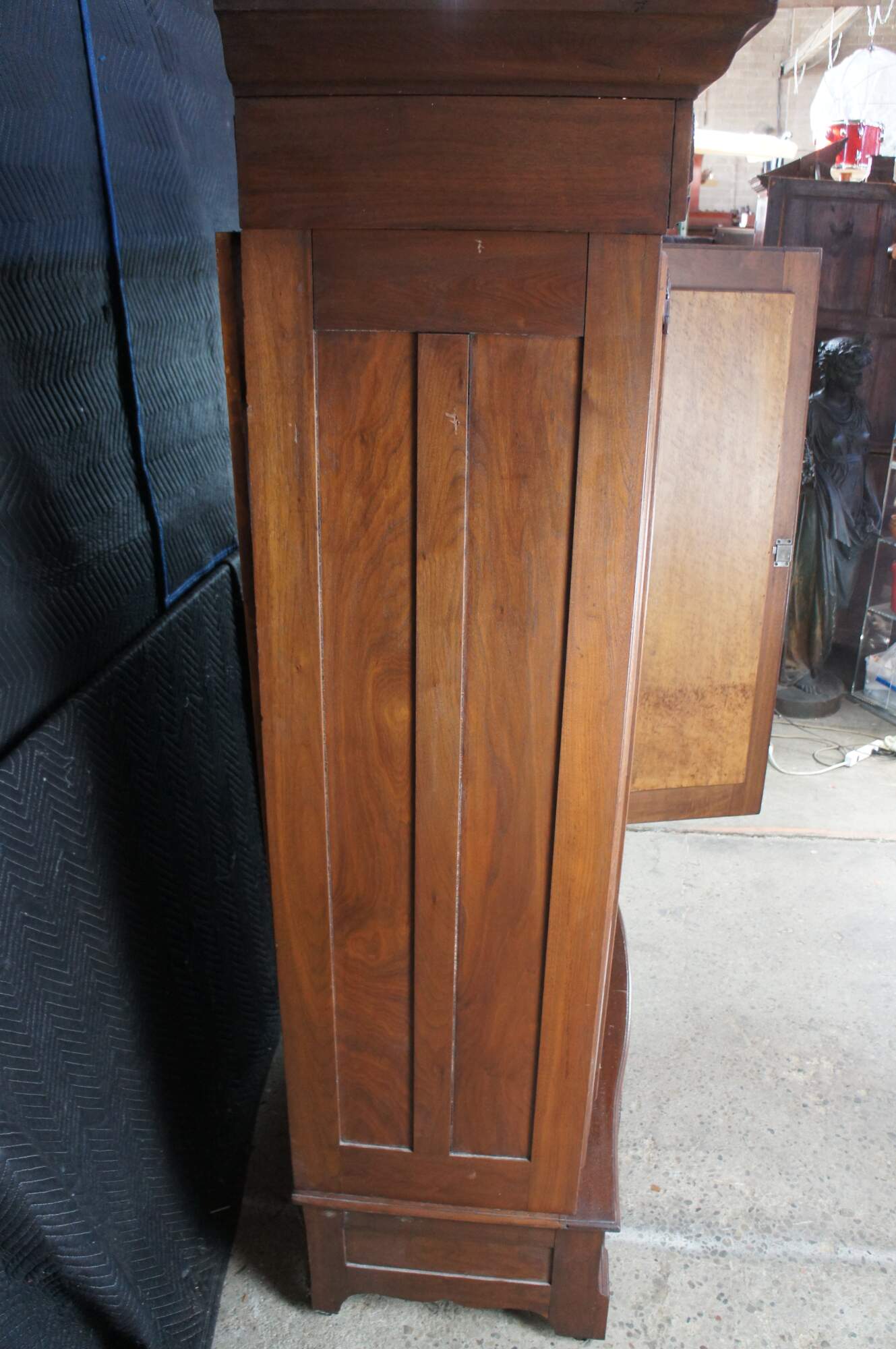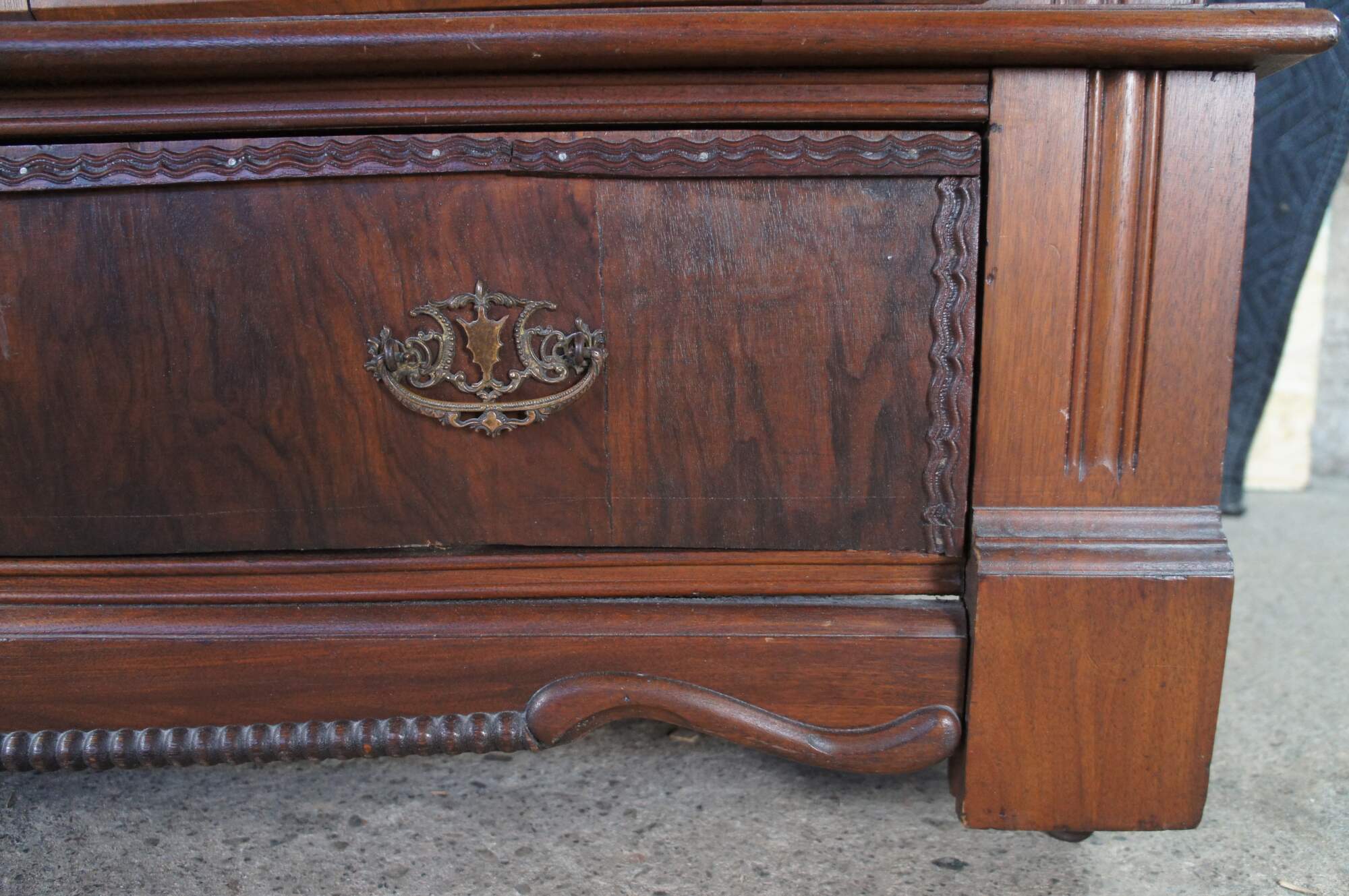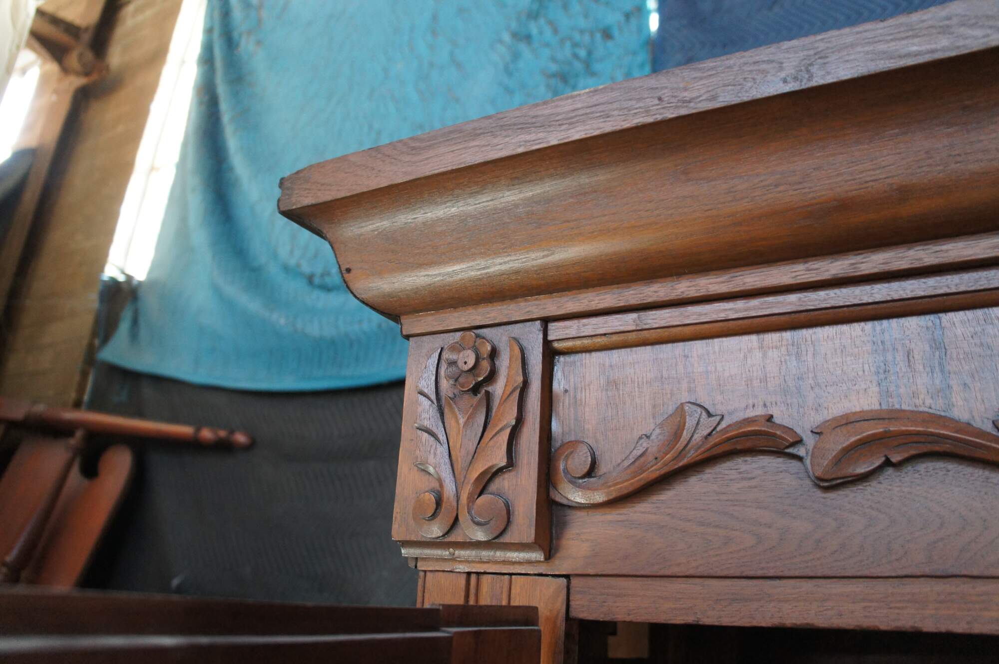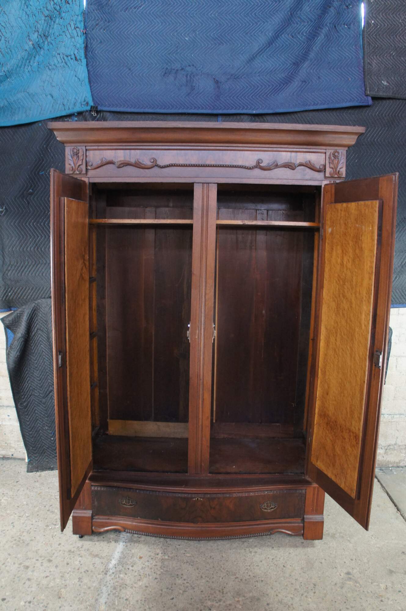 Antique 19th-century French clothing armoire. Made of walnut featuring hand-carved floral / acanthus / beaded details, full-length beveled mirrored doors, and a bottom drawer.