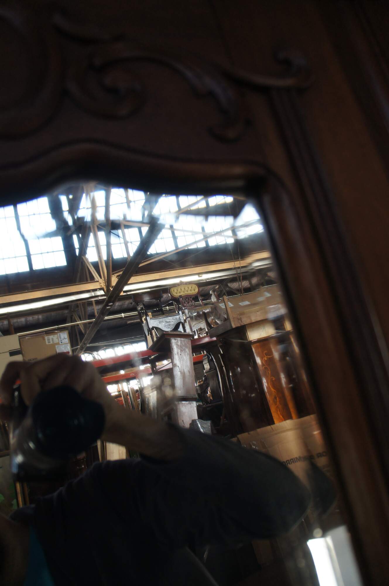 Good antique condition, wear and distressing from age and use, veneer loss, missing trim on drawer, silver loss / streaking to mirror.
