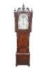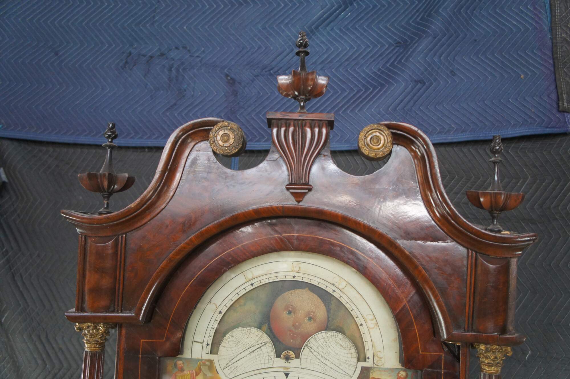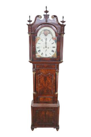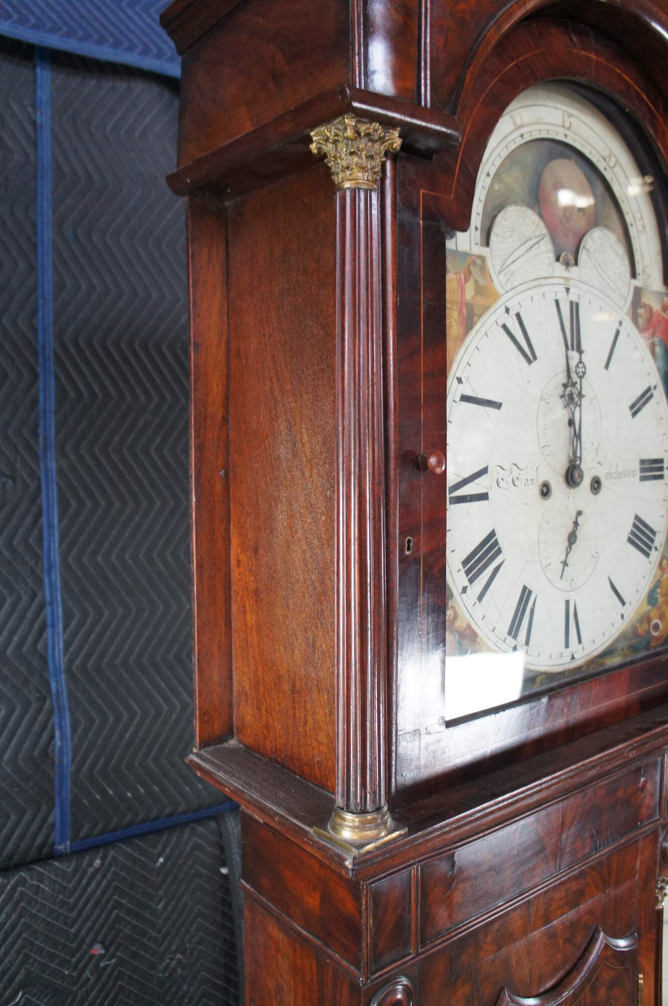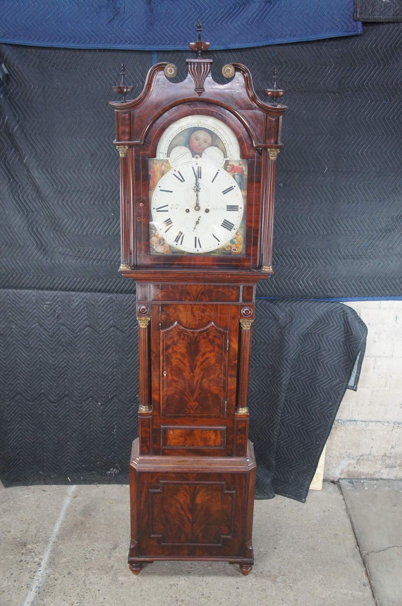 Monumental Fabulous Super Terrific 18th Century English Georgian Manchester grandfather 8 day clock. Exceptional flame mahogany case featuring an open pediment scrolled crown with brass rosettes and ornate finials, which houses a sun and moon face with roman numerals and painted figures. There is a man reading a book with a cow / bull, a man drinking with a turkey, a man with a lion, and a man reading a scroll. The clock case features fluted corinthian columns capped and footed with brass and paneled accents.