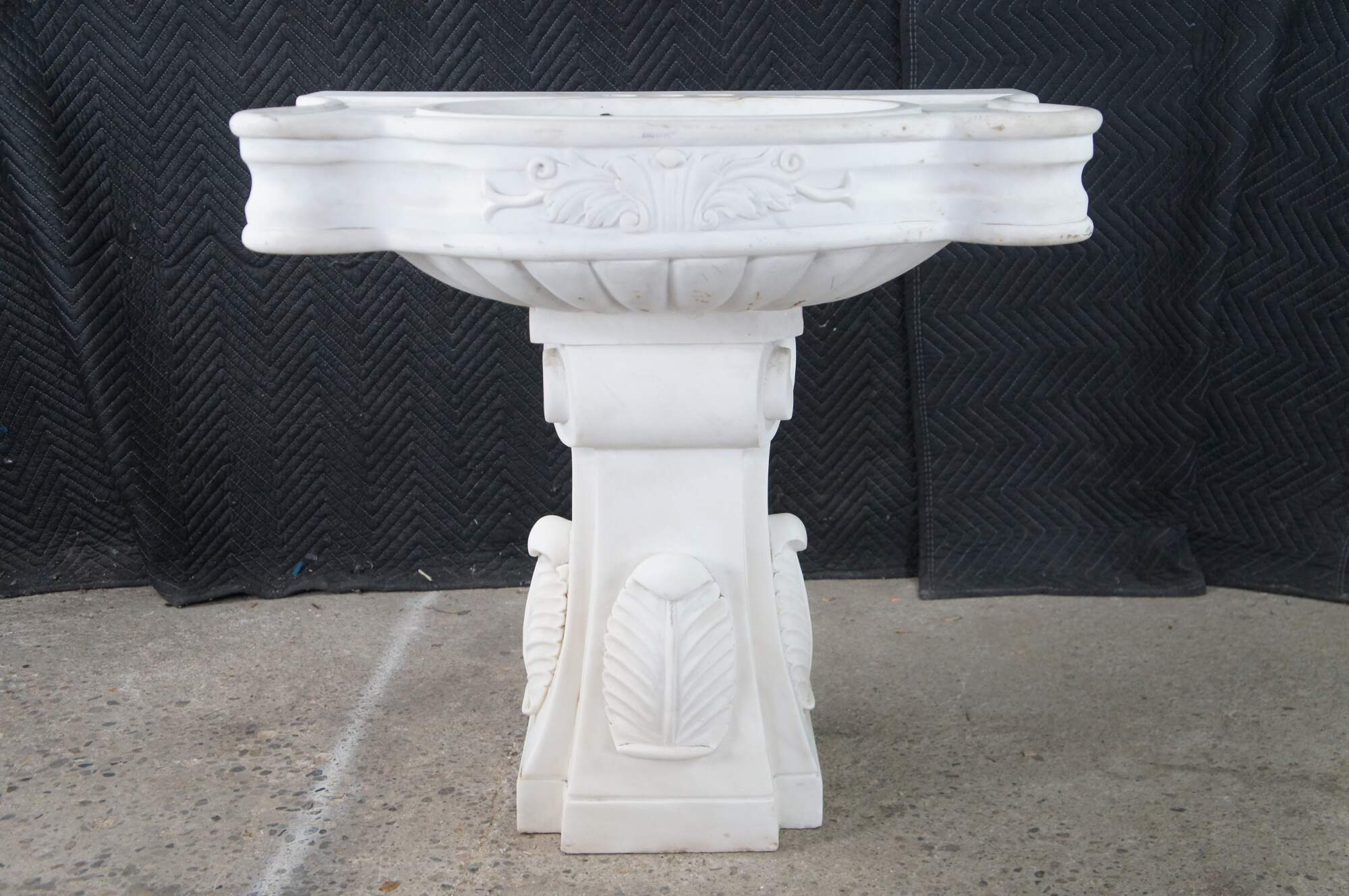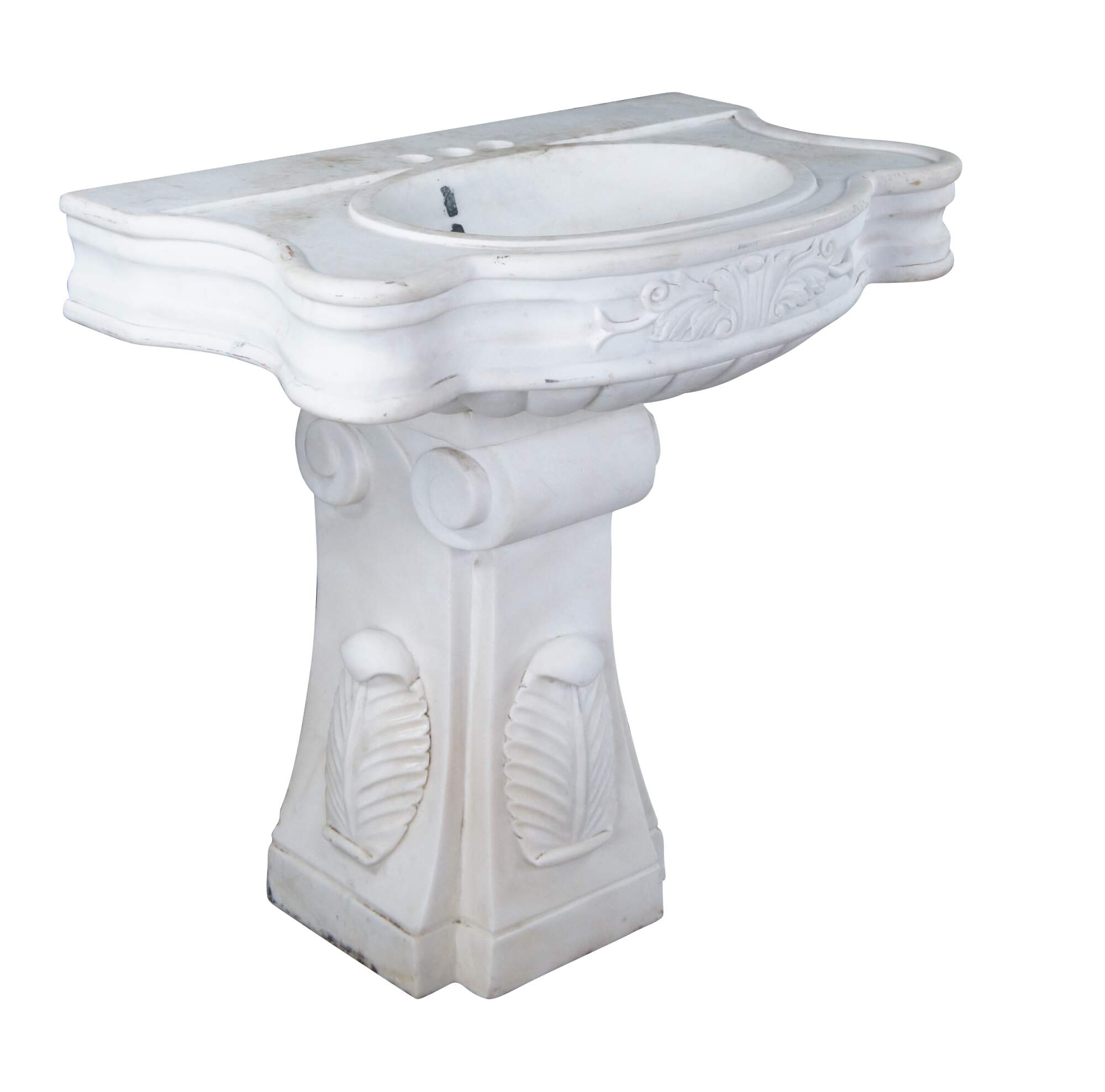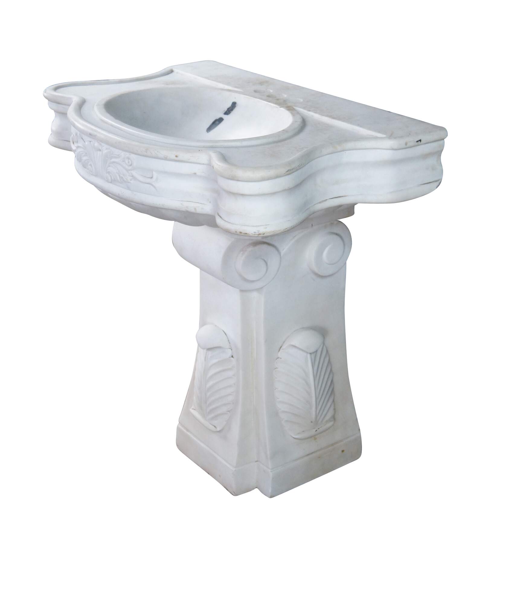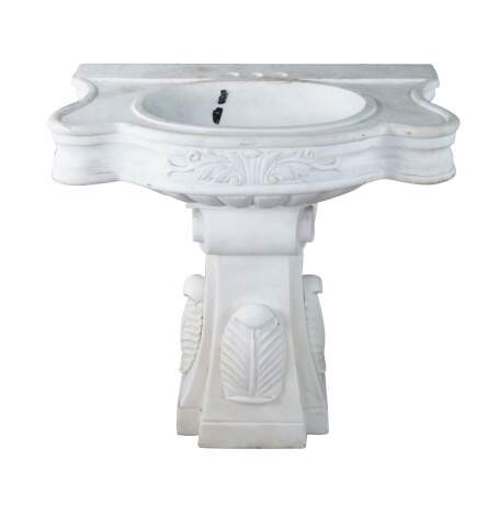 Monumental mid century Italian Neoclassical white Carrara marble bathroom sink. A thick rectangular plith column supports a serpentine sink with acanthus accents.