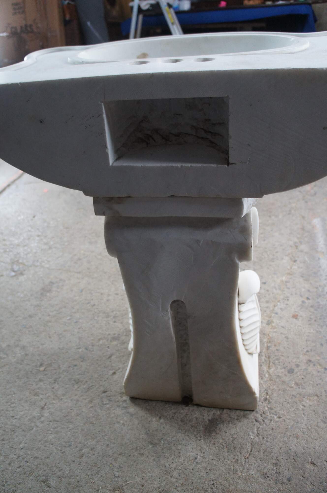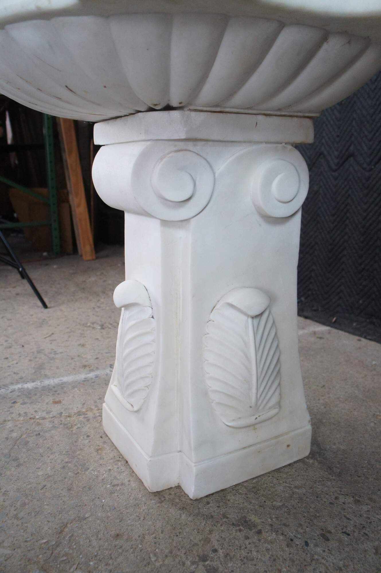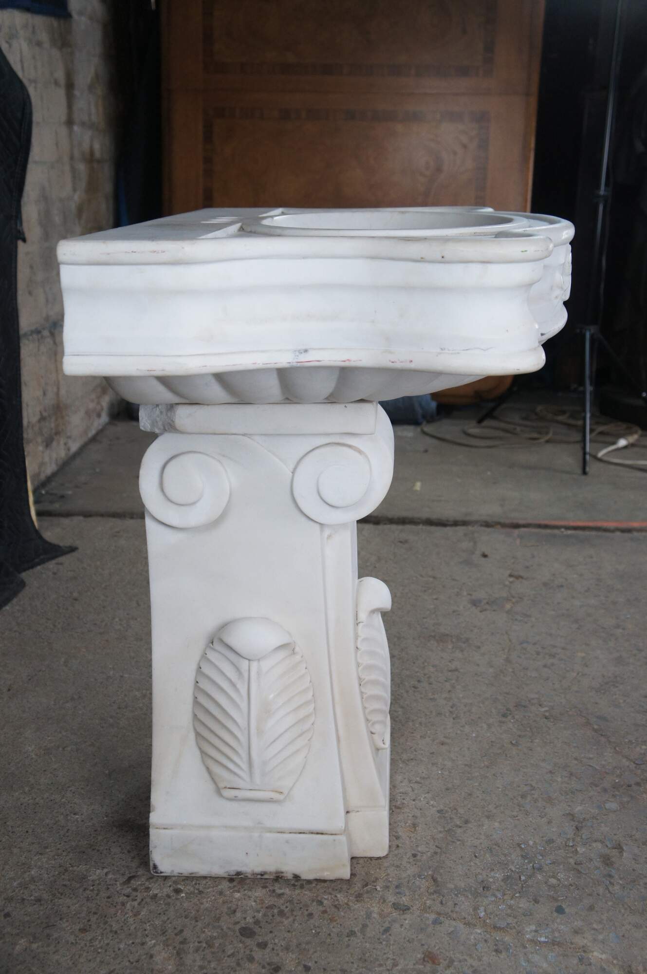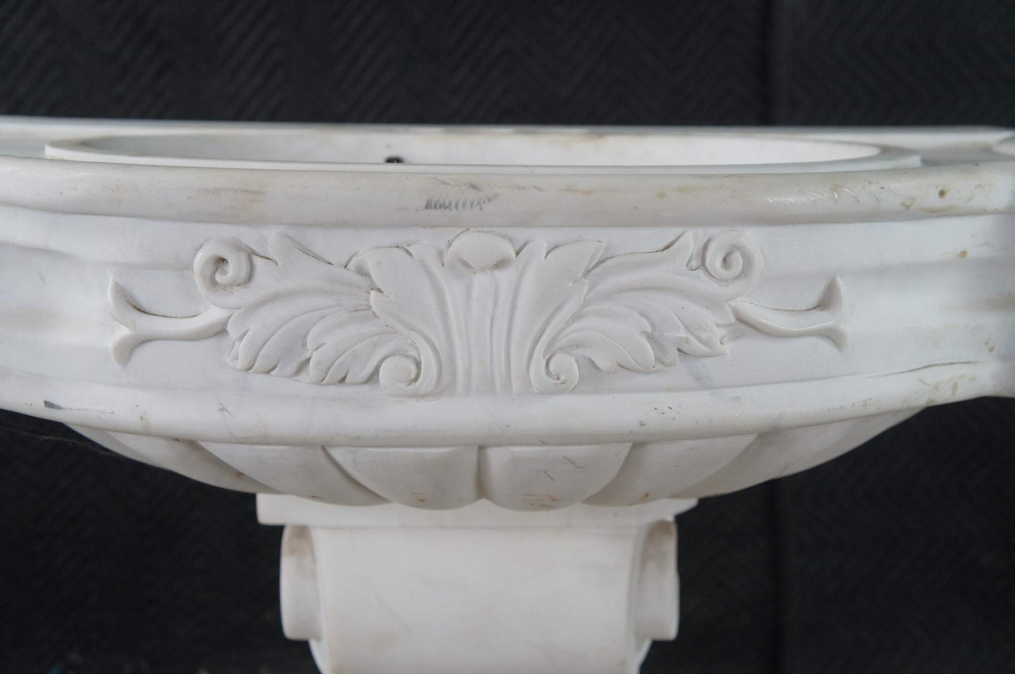 Monumental mid century Italian Neoclassical white Carrara marble bathroom sink. A thick rectangular plith column supports a serpentine sink with acanthus accents.